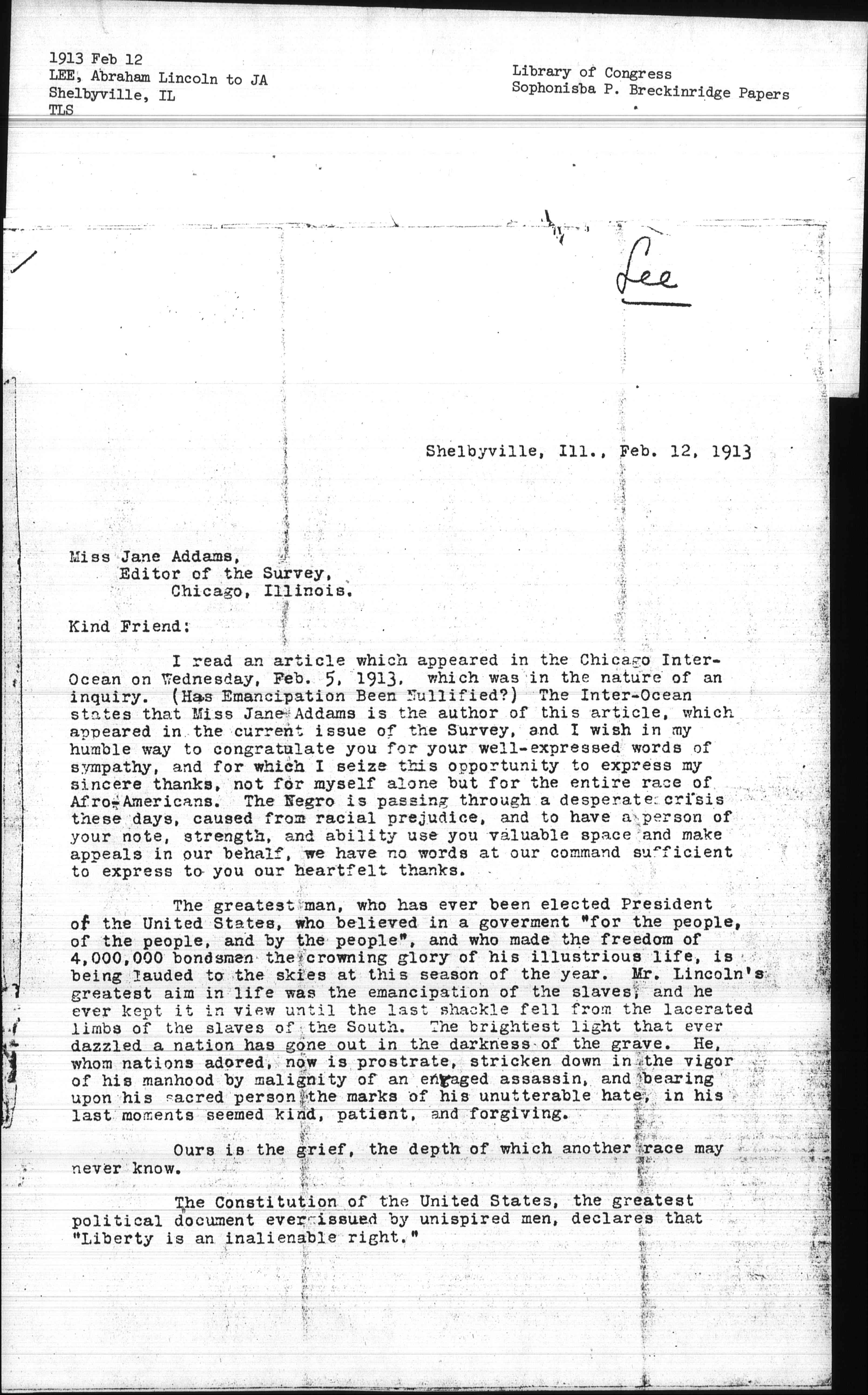 I read an article which appeared in the Chicago Inter-Ocean on Wednesday, Feb, 5, 1913, which was in the nature of an inquiry. (Has Emancipation Been Nullified?) The Inter-Ocean states that Miss Jane Addams is the author of this article, which appeared in the current issue of the Survey, and I wish in my humble way to congratulate you for your well-expressed words of sympathy, and for which I seize this opportunity to express my sincere thanks, not for myself alone but for the entire race of Afro-Americans. The Negro is passing through a desperate crisis these days, caused from racial prejudice, and to have a person of your note, strength, and ability use [your] valuable space and make appeals in our behalf, we have no words at our command sufficient to express to you our heartfelt thanks.
