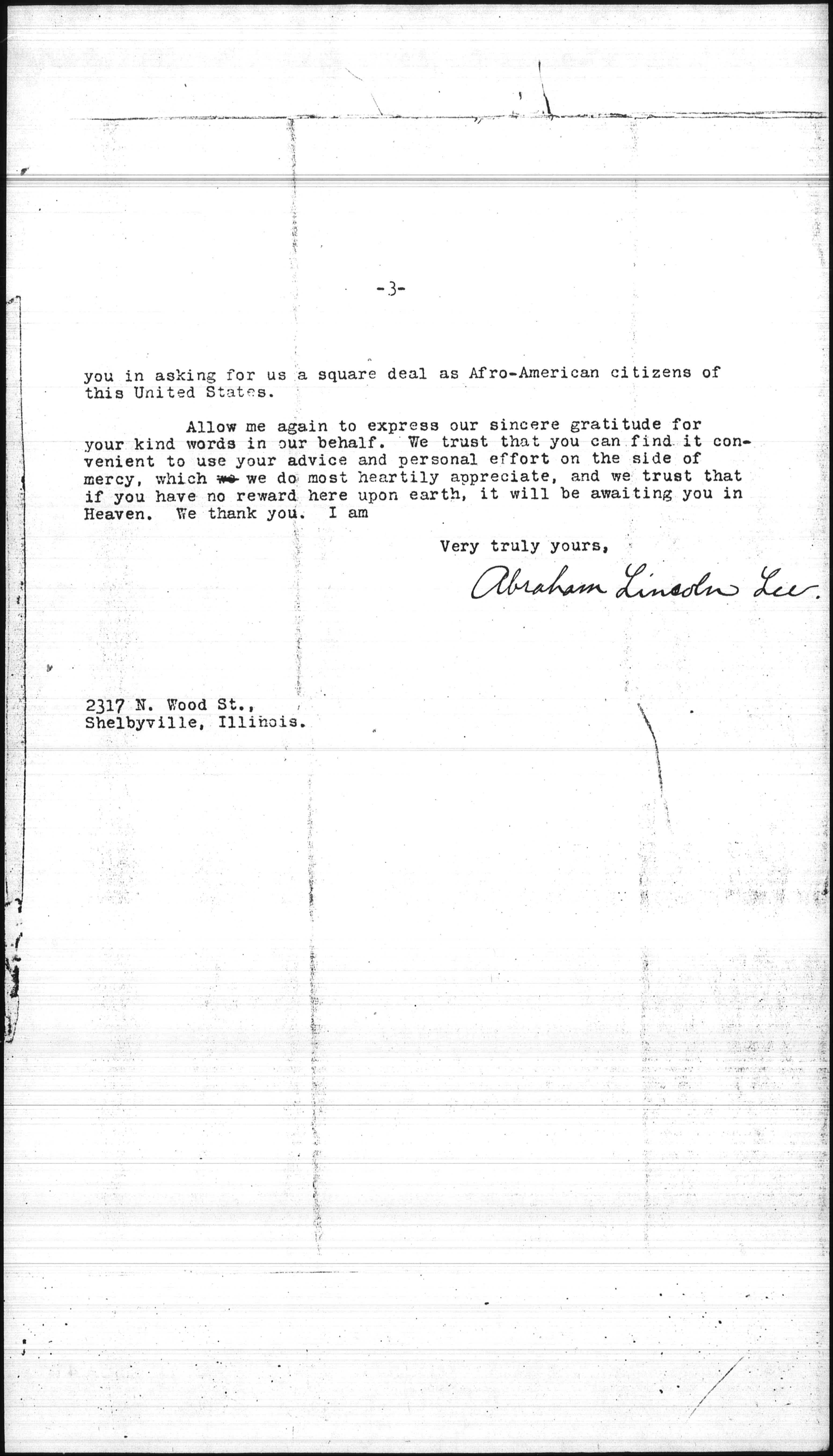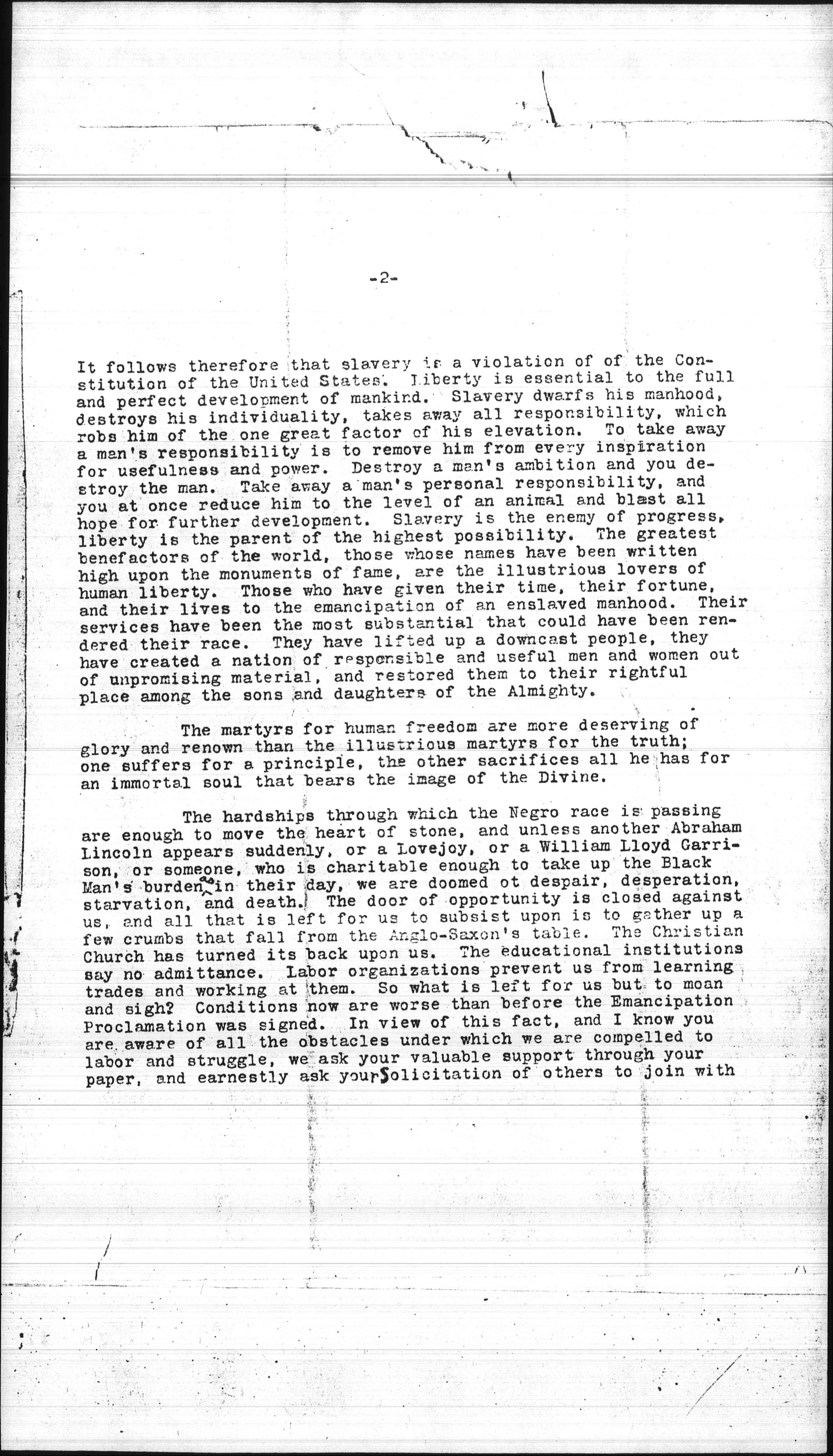 The hardships through which the Negro race is passing are enough to move the heart of stone, and unless another Abraham Lincoln appears suddenly, or a Lovejoy, or a William Lloyd Garrison, or someone, who is charitable enough to take up the Black Man's Burden <as> in their day, we are doomed to despair, desperation, starvation, and death. The door of opportunity is closed against us, and all that is left for us to subsist upon is to gather up a few crumbs that fell from the Anglo-Saxon's table. The Christian Church has turned its back upon us. The educational institutions say no admittance. Labor organizations prevent us from learning trades and working at them. So what is left for us but to moan and sigh? Conditions now are worse than before the Emancipation Proclamation was signed. In view of this fact, and I know you are aware of all the obstacles under which we are compelled to labor and struggle, we ask your valuable support through your paper, and earnestly ask your solicitation of others to join with [page 3] you in asking for us a square deal as Afro-American citizens of this United States.