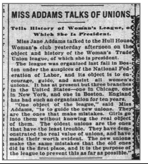 "One object of the league," said Miss Addams, "is to guide the new unions. They are the ones that make mistakes. Girls go into them without knowing the real object of them. The oldest unions are the ones that have the least trouble. They have demonstrated the real value of unions, and have made their worth evident. The new unions make the same mistakes that the old ones did in the first place, and it is the purpose of the league to prevent this as far as possible."