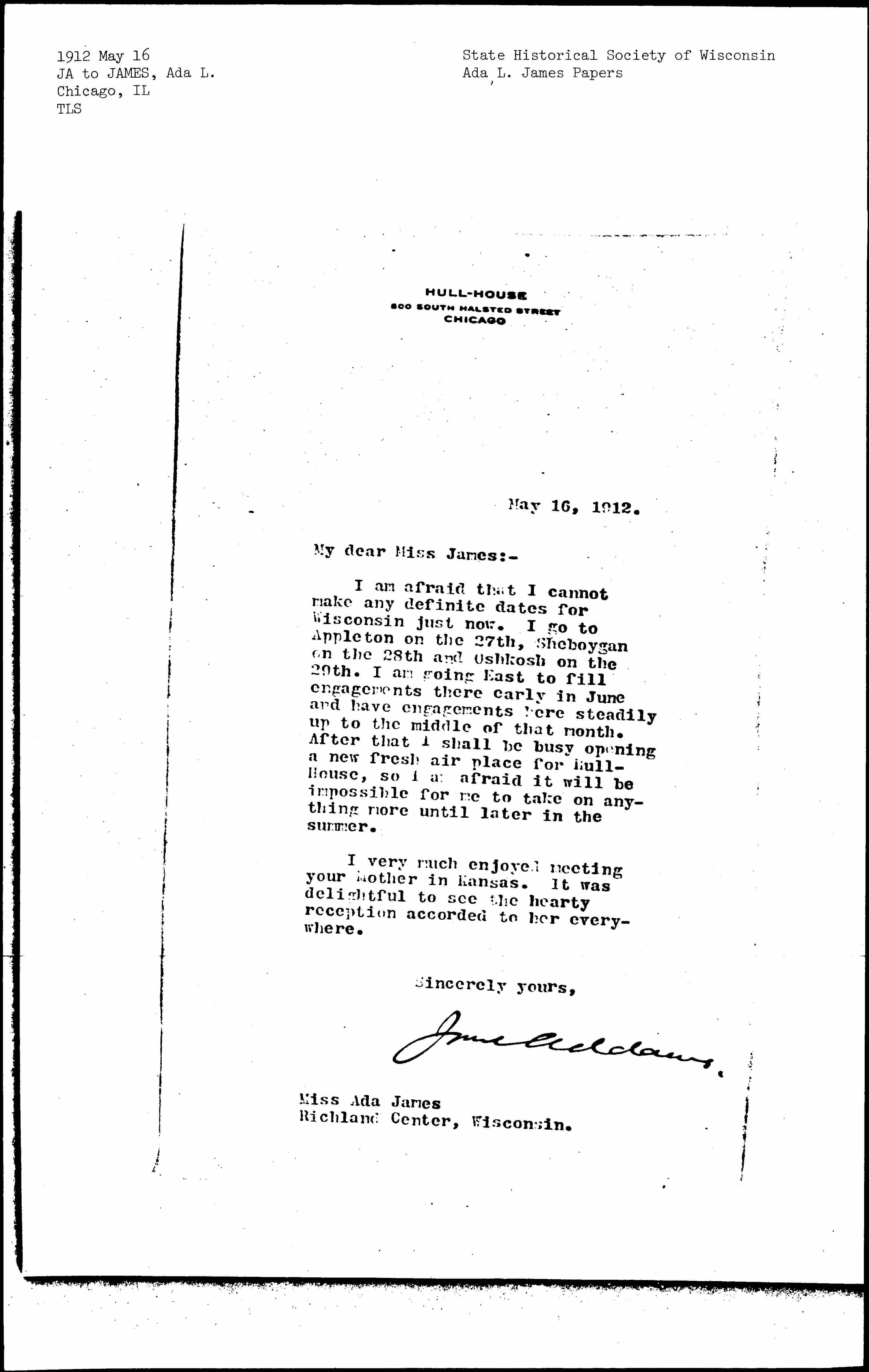 I am afraid that I cannot make any definite dates for Wisconsin just now. I go to Appleton on the 27th, Sheboygan on the 28th and Oshkosh on the 29th. I am going East to fill engagements there early in June and have engagements here steadily up to the middle of that month. After that I shall be busy opening a new fresh air place for Hull-House, so I am afraid it will be impossible for me to take on anything more until later in the summer.