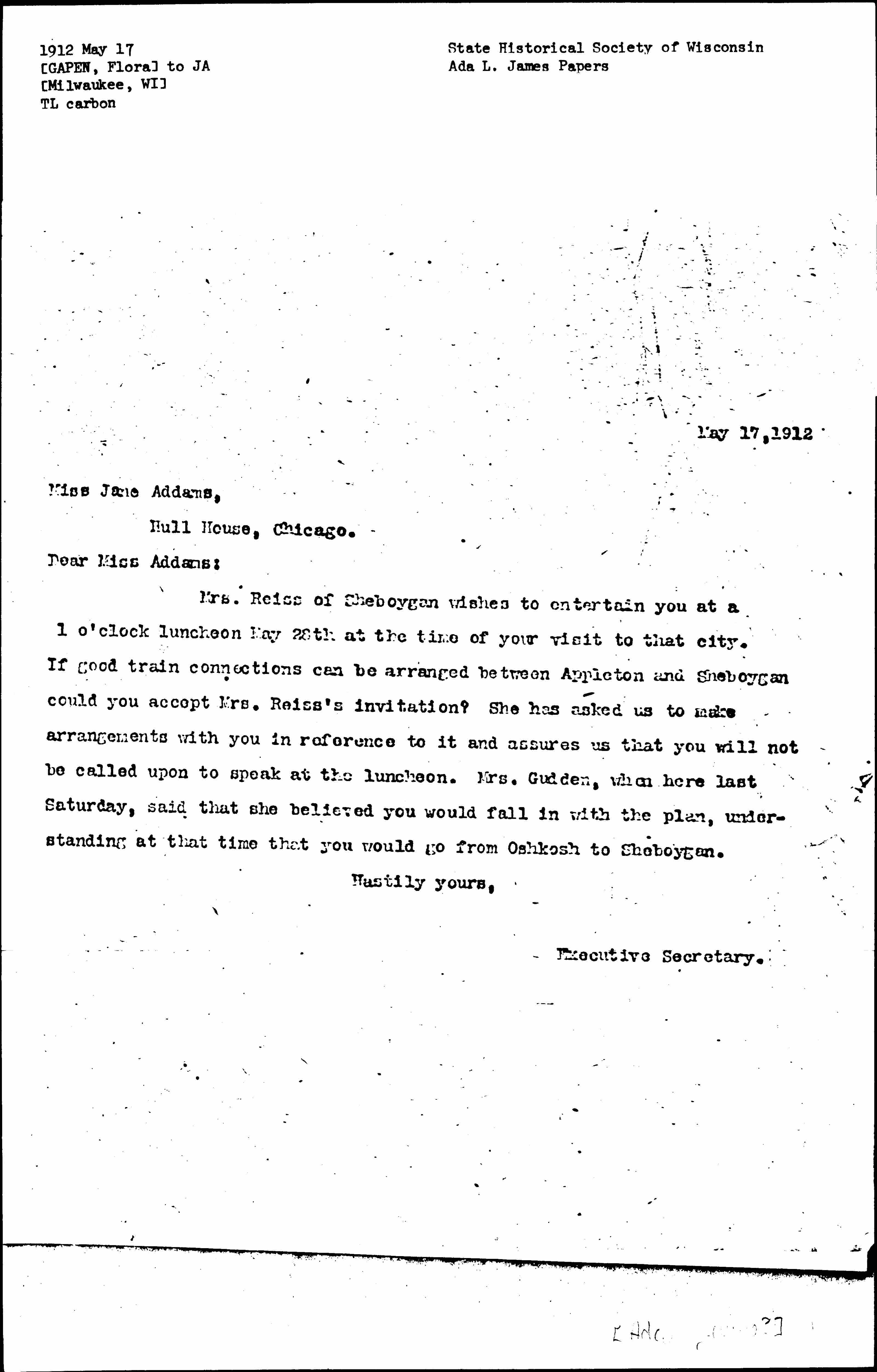 Mrs. Reiss of Sheboygan wishes to entertain you at a 1 o'clock luncheon May 28th at the time of your visit to that city. If good train connections can be arranged between Appleton and Sheboygan could you accept Mrs. Reiss's invitation? She has asked us to make arrangements with you in reference to it and assures us that you will not be called upon to speak at the luncheon. Mrs. Gudden, when here last Saturday, said that she believed you would fall in with the plan, understanding at that time that you would go from Oshkosh to Sheboygan.