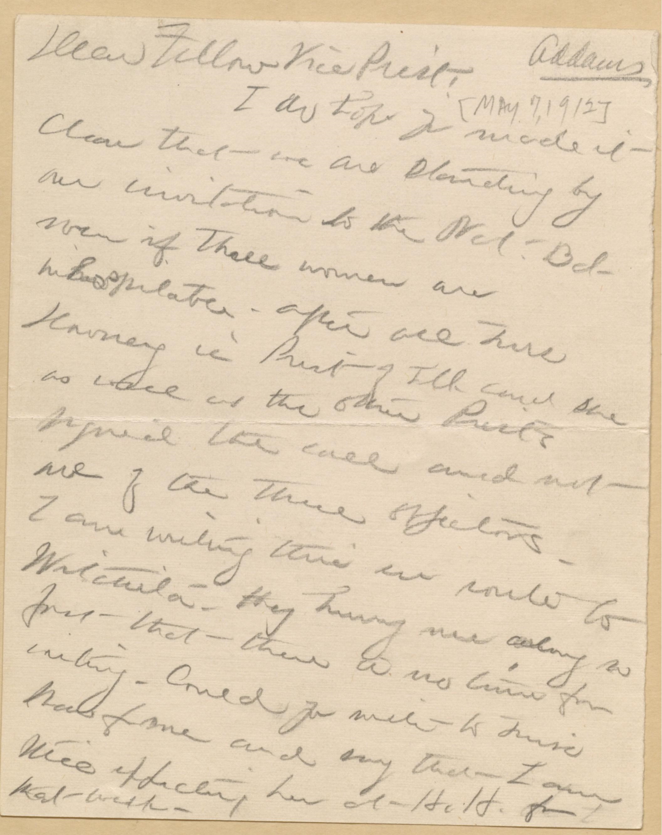 I do hope you made it clear that we are standing by our invitation to the Nat. Bd. even if three women are inhospitable -- after all Mrs Downey is Pres't of Ill. and she as well as the other Pres'ts signed the call and not one of the three objectors. I am writing this en route to [Wichita] -- they hurry me along so fast that there is no time for writing. Could you write to Miss Shaw from me and say that I am still expecting her at H.H. for that week. [page 2] I should ↑think↓ that Mrs Dennett ought to be there for her own education in the campaigns and on the whole I believe we ought to make it clear that while a small group do not want them, that we do.