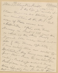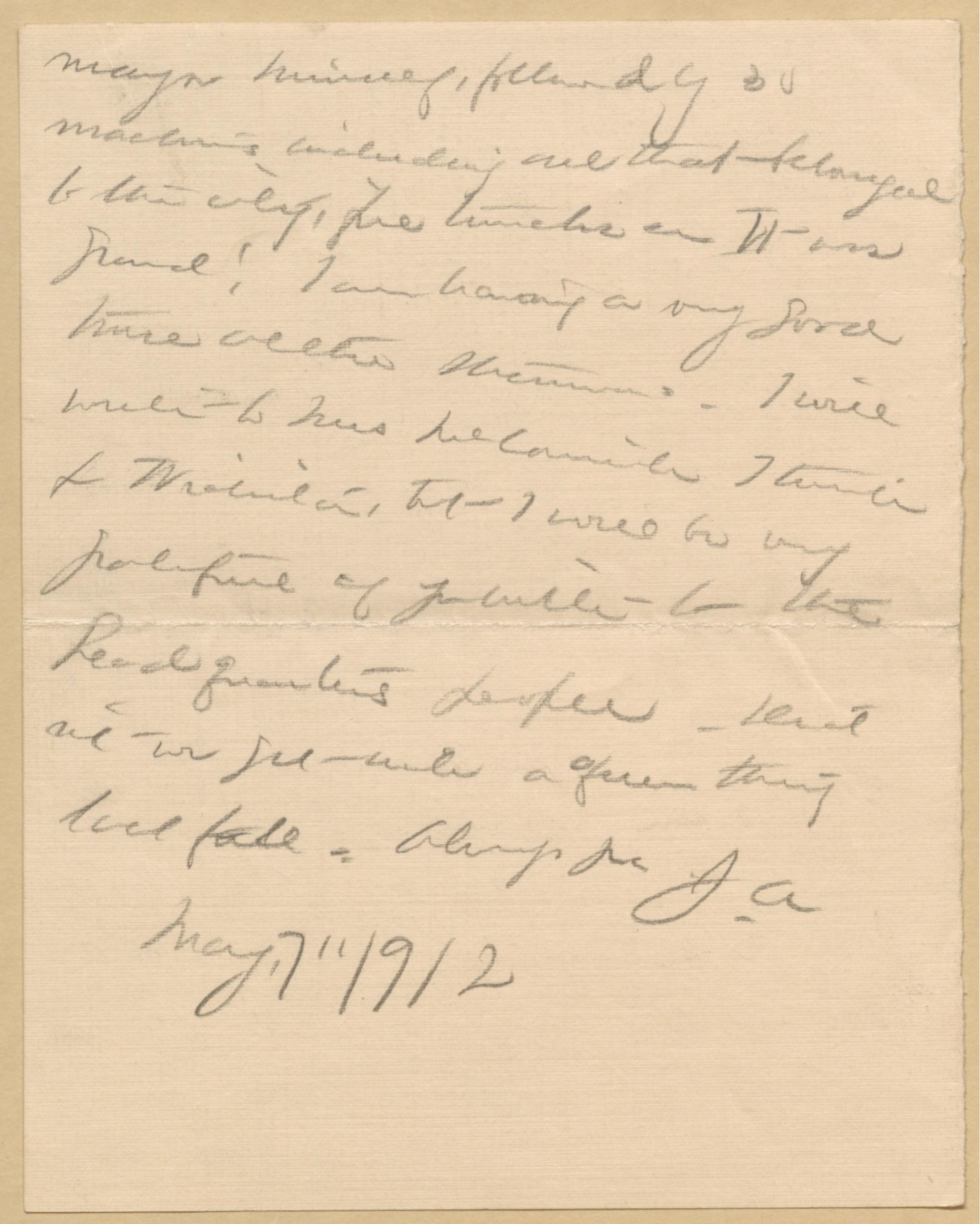 I am [traveling] about with the Rev Olympia Brown and find her a most delightful alive old lady and so far have struck none of the supposed animosities. I am inclined to think that Miss Shaw's responses exaggerate everything. You ought to have witnessed our automobile parade in Kansas City yesterday. I was driven by the [page 3] mayor himself, followed by 30 machines including one that belonged to the city, fire trucks [etc.] It was grand! I am having a very good time [although] strenuous. I will write to Mrs McCormick I think from Wichita, but I will be very grateful if you write to the headquarters people. Didn't we get [such] a [queer] thing last fall. Always ys J. A