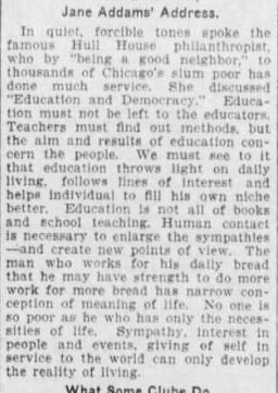 In quiet, forcible tones spoke the famous Hull House philanthropist, who by "being a good neighbor," to thousands of Chicago's slum poor has done much service. She discussed "Education and Democracy." Education must not be left to the educators. Teachers must find out methods, but the aim and results of education concern the people. We must see to it that education throws light on daily living, follows lines of interest and helps individual to fill his own niche better. Education is not all of books and school teaching. Human contact is necessary to enlarge the sympathies – and create new points of view. The man who works for his daily bread that he may have strength to do more work for more bread has narrow conception of meaning of life. No one is so poor has he who has only the necessities of life. Sympathy, interest in people and events, giving of self in service to the world can only develop the reality of living.