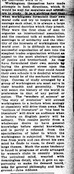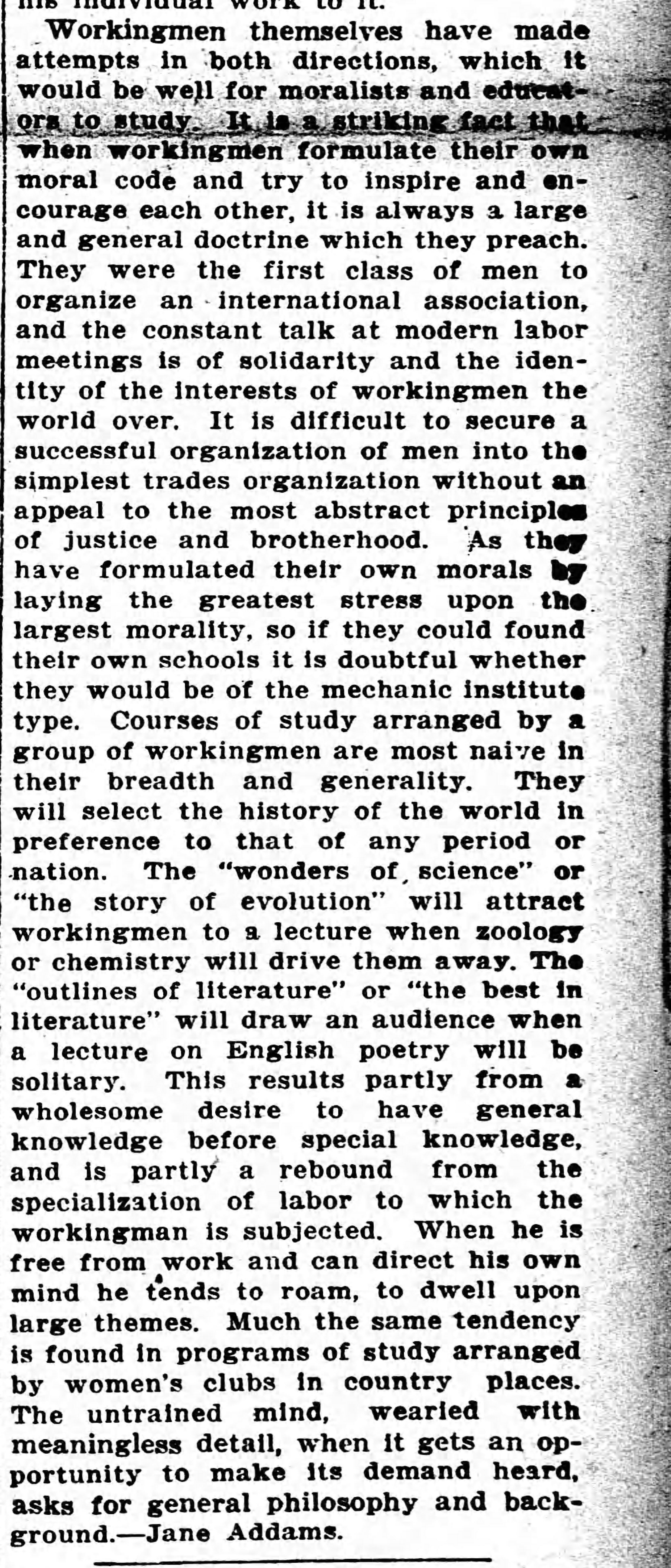 Workingmen themselves have made attempts in both directions, which it would be well for moralists and educators to study. It is a striking fact that when workingmen formulate their own moral code and try to inspire and encourage each other, it is always a large and general doctine which they preach. They were the first class of men to organize an international association, and the constant talk at modern labor meetings is of solidarity and the identify of the interests of workingmen the world over. It is difficult to secure a successful organization of men into the simplest trades organization without an appeal to the most abstract principles of justice and brotherhood. As they have formulated their own morals by laying the greatest stress upon the largest morality, so if they could found their own schools it is doubtful whether they would be of the mechanic institute type. Courses of study arranged by a group of workingmen are most naive in their breadth and generality. They will select the history of the world in preference to that of any period or nation. The "wonders of science" or "the story of evolution" will attract workingmen to a lecture when zoology or chemistry will drive them away. The "outlines of literature" or "the best in literature" will draw an audience when a lecture on English poetry will be solitary. This results partly from a wholesome desire to have general knowledge before special knowledge, and is partly a rebound from the specialization of labor to which the workingman is subjected. When he is free from work and can direct his own mind he tends to roam, to dwell upon large themes. Much the same tendency is found in programs of study arranged by women's clubs in country places. The untrained mind, wearied with meaningless detail, when it gets an opportunity to make its demand heard, asks for general philosophy and background. -- Jane Addams.