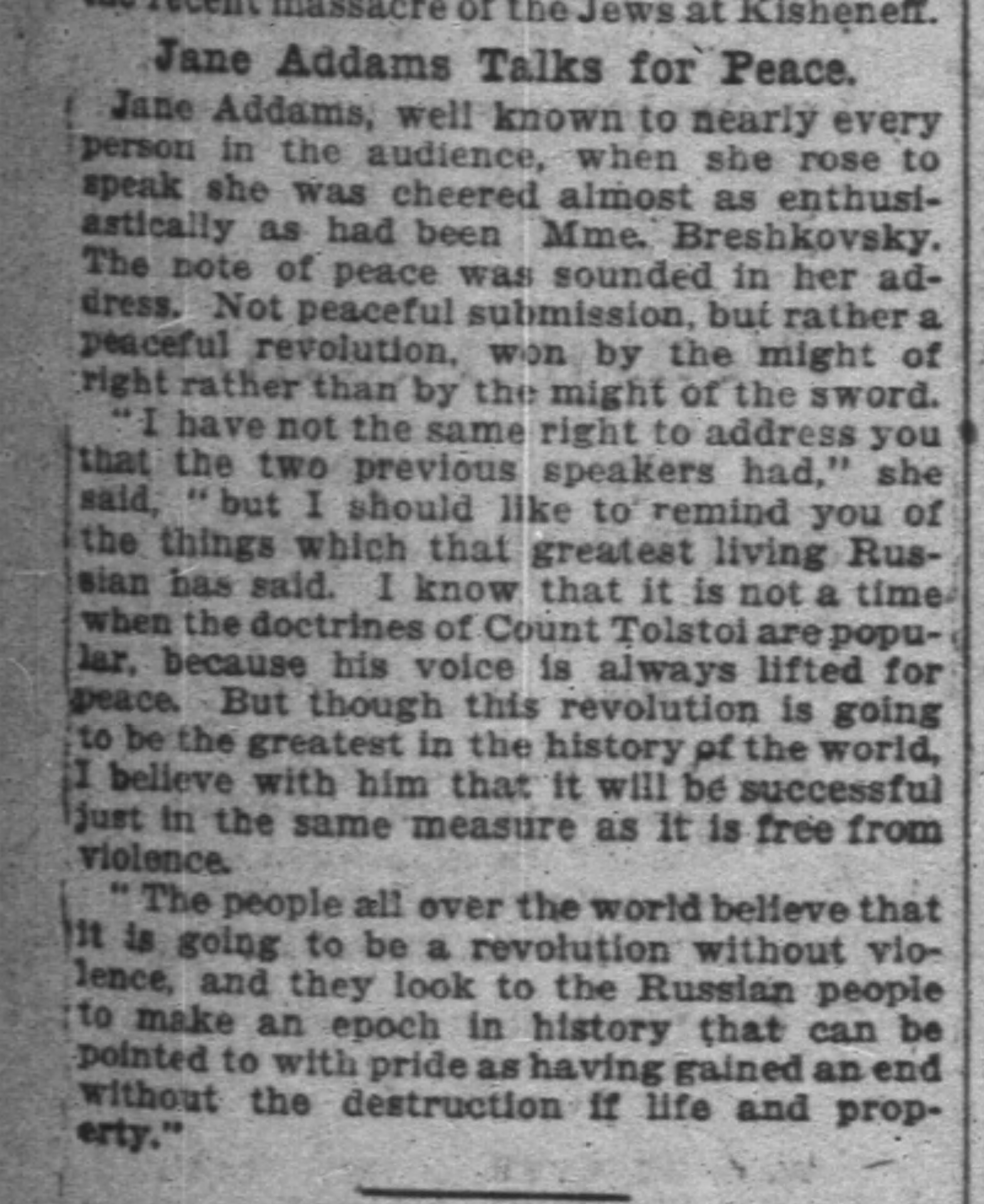 Jane Addams, well known to nearly every person in the audience, when she rose to speak she was cheered almost as enthusiastically as had been Mme. Breshkovsky. The note of peace was sounded in her address. Not peaceful submission, but rather a peaceful revolution, won by the might of right rather than by the might of the sword.