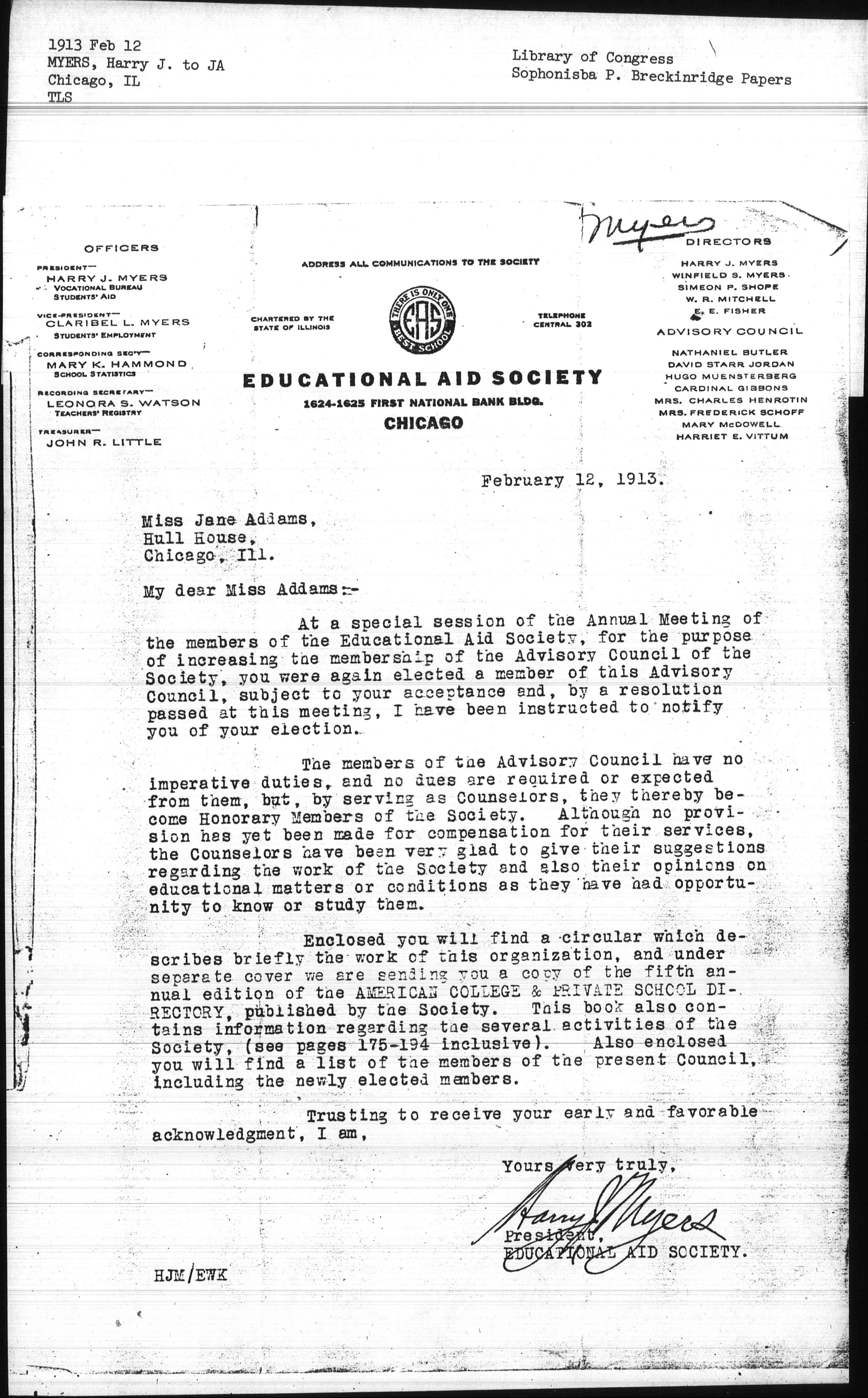 At a special session of the Annual Meeting of the members of the Educational Aid Society, for the purpose of increasing the membership of the Advisory Council of the Society, you were again elected a member of this Advisory Council, subject to your acceptance and, by a resolution passed at this meeting, I have been instructed to notify you of your election.