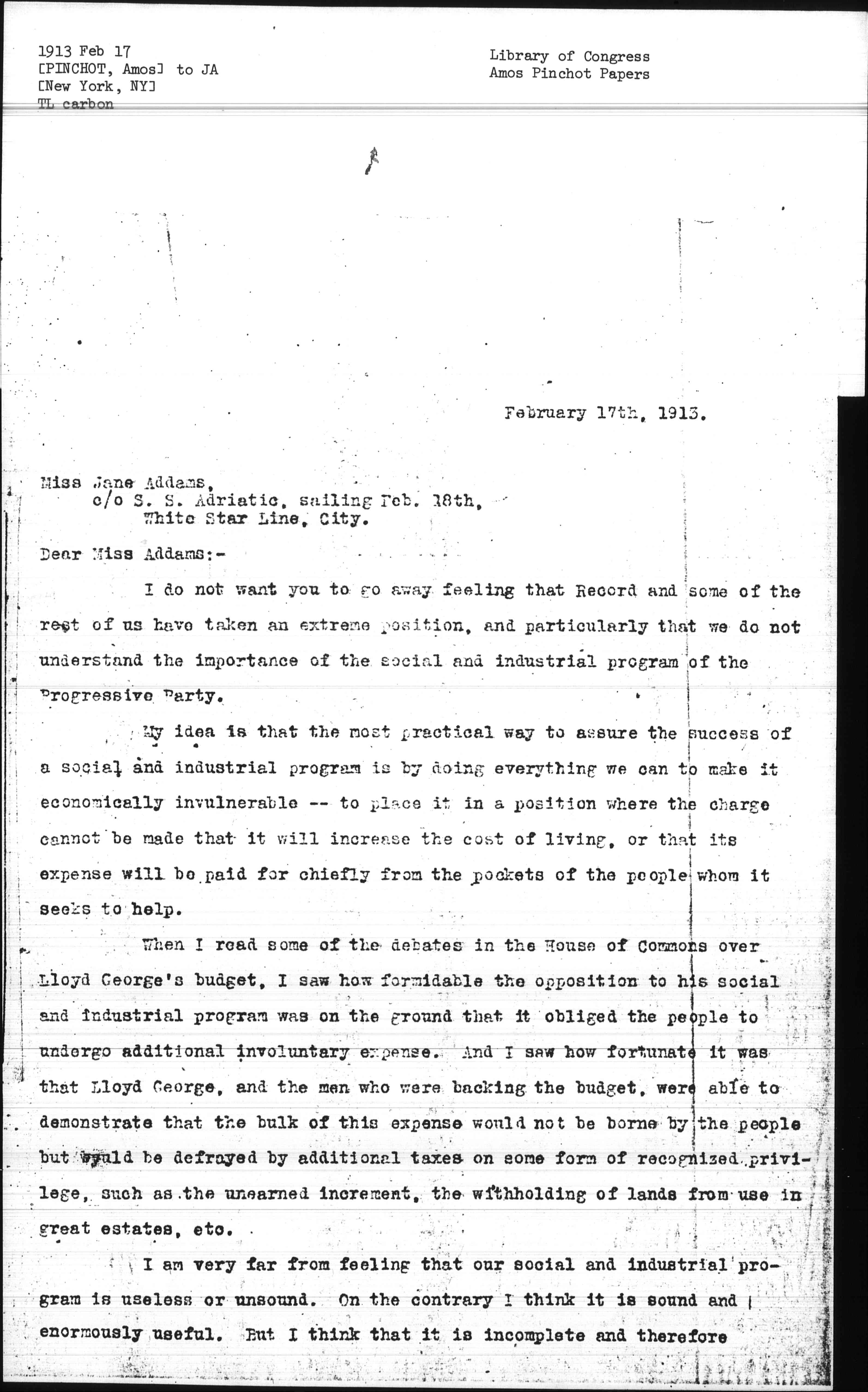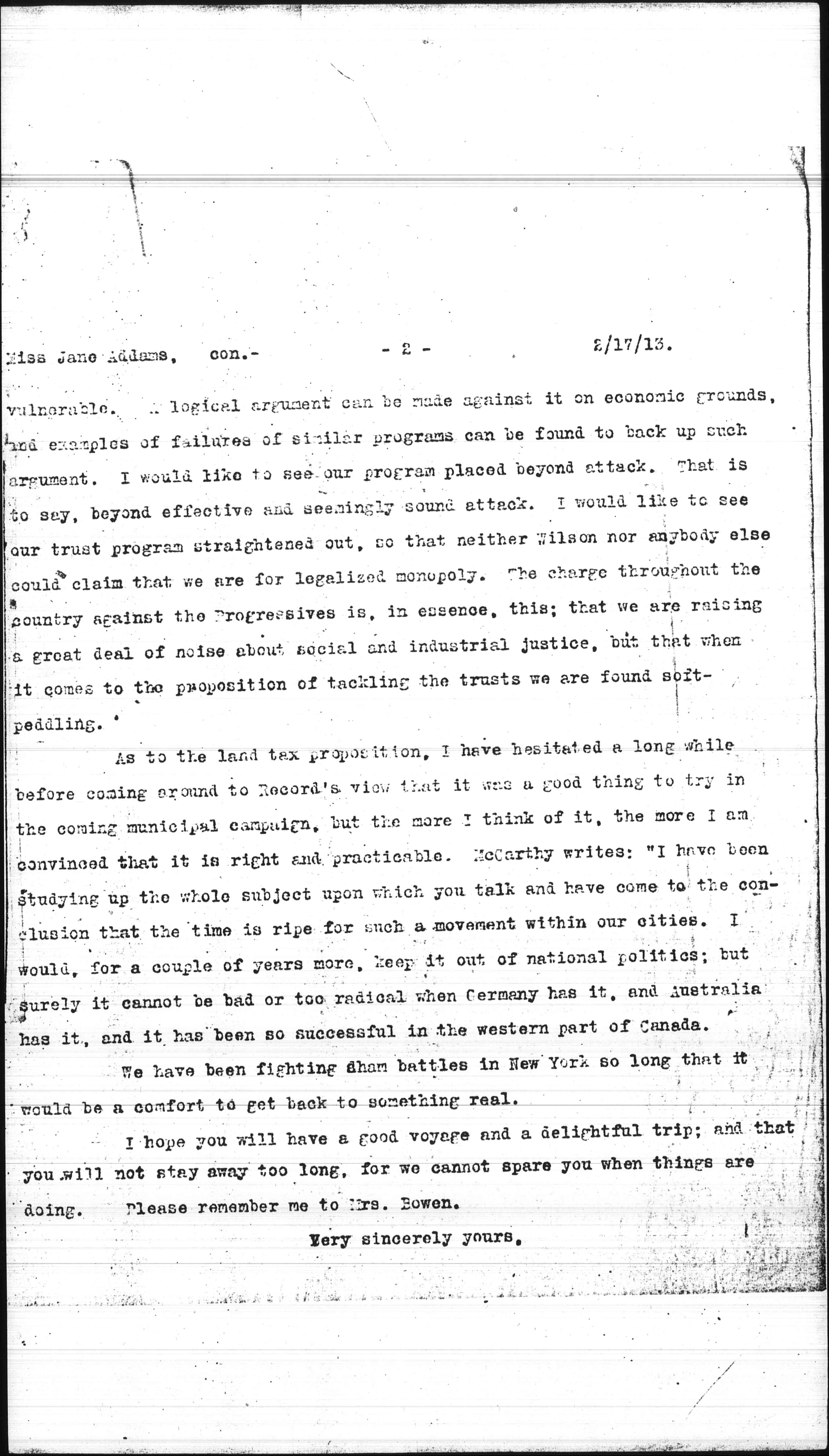 I am very far from feeling that our social and industrial program is useless or unsound. On the contrary I think it is sound and enormously useful. But I think that it is incomplete and therefore [page 2] vulnerable. A logical argument can be made against it on economic grounds, and examples of failures of similar programs can be found to back up such argument. I would like to see our program placed beyond attack. That is to say, beyond effective and seemingly sound attack. I would like to see our trust program straightened out, so that neither Wilson nor anybody else could claim that we are for legalized monopoly. The charge throughout the country against the Progressives is, in essence, this: that we are raising a great deal of noise about social and industrial justice, but that when it comes to the proposition of tackling the trusts we are found soft-peddling.