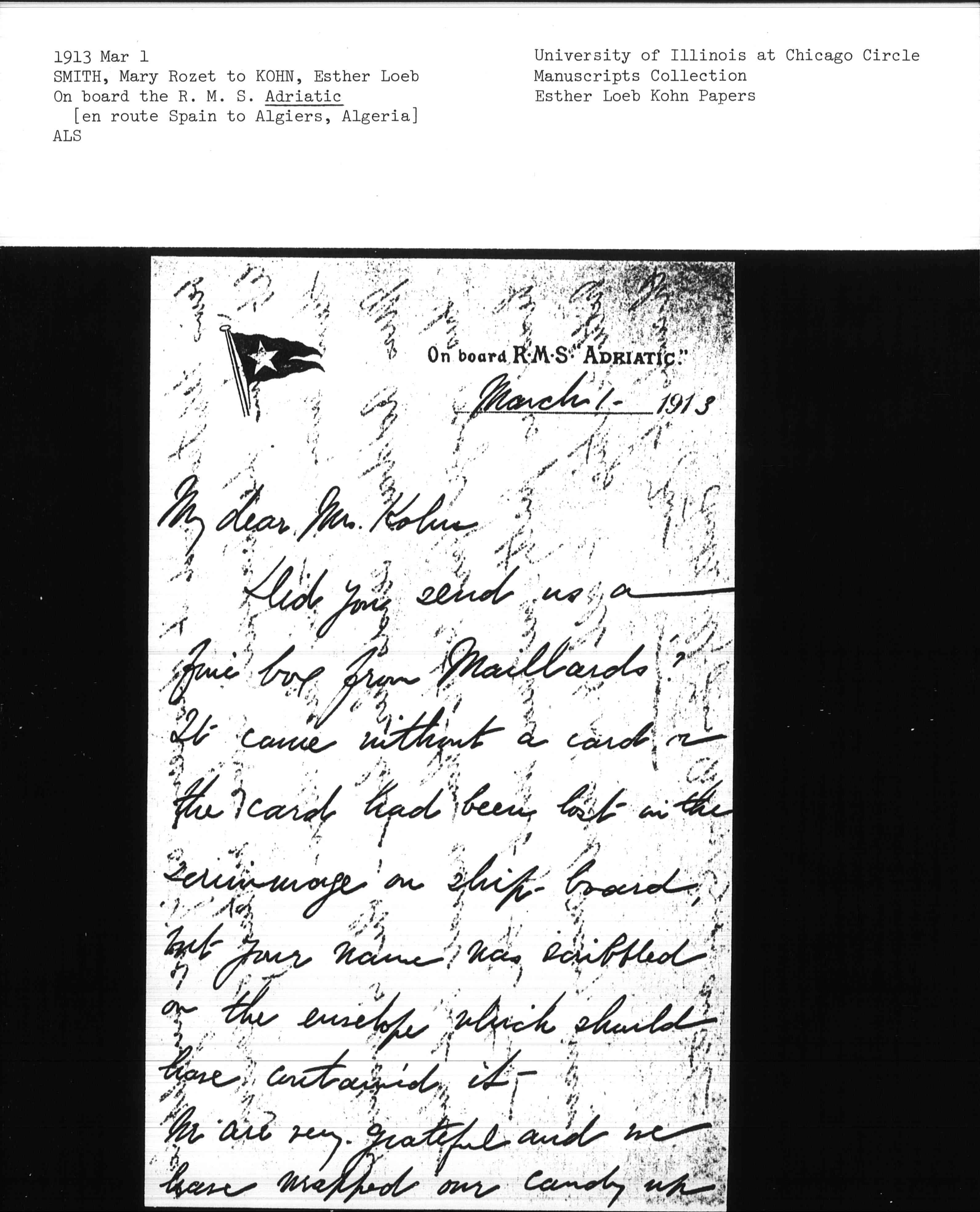Did you send us a fine box from Maillard's? It came without a card or the card had been lost in the scrimmage on ship-board, but your name was scribbled on the envelope which should have contained it.