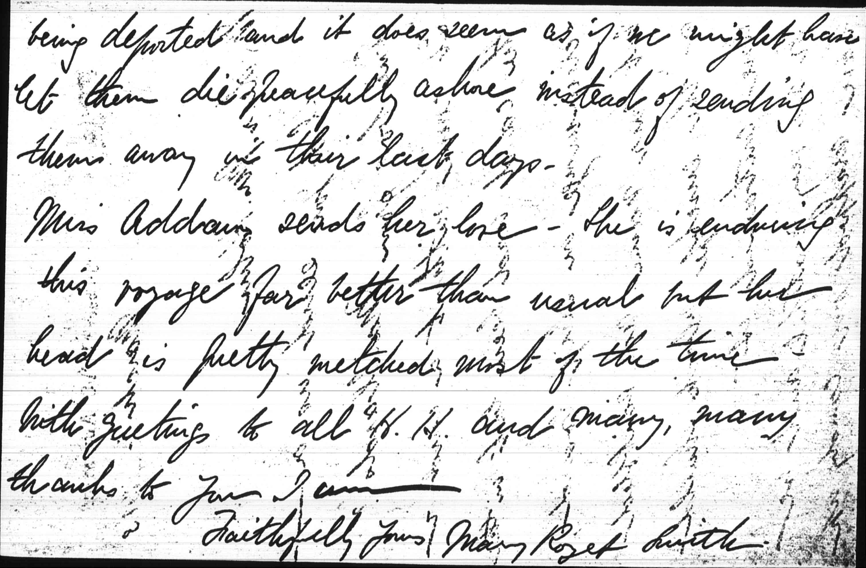 Miss Addams sends her love. She is enduring this voyage far better than usual but her head is pretty [wretched] most of the time. With greetings to all H. H. and many, many thanks to you I am