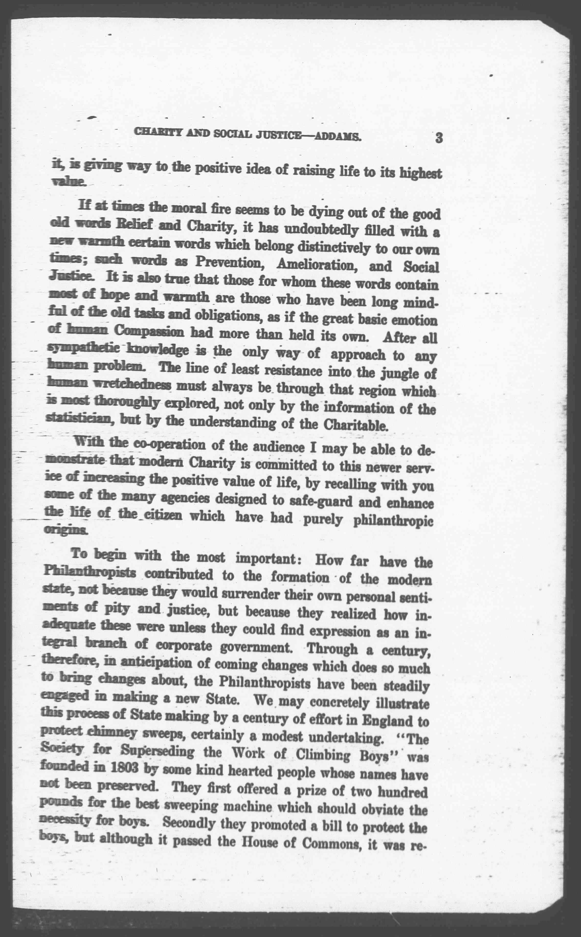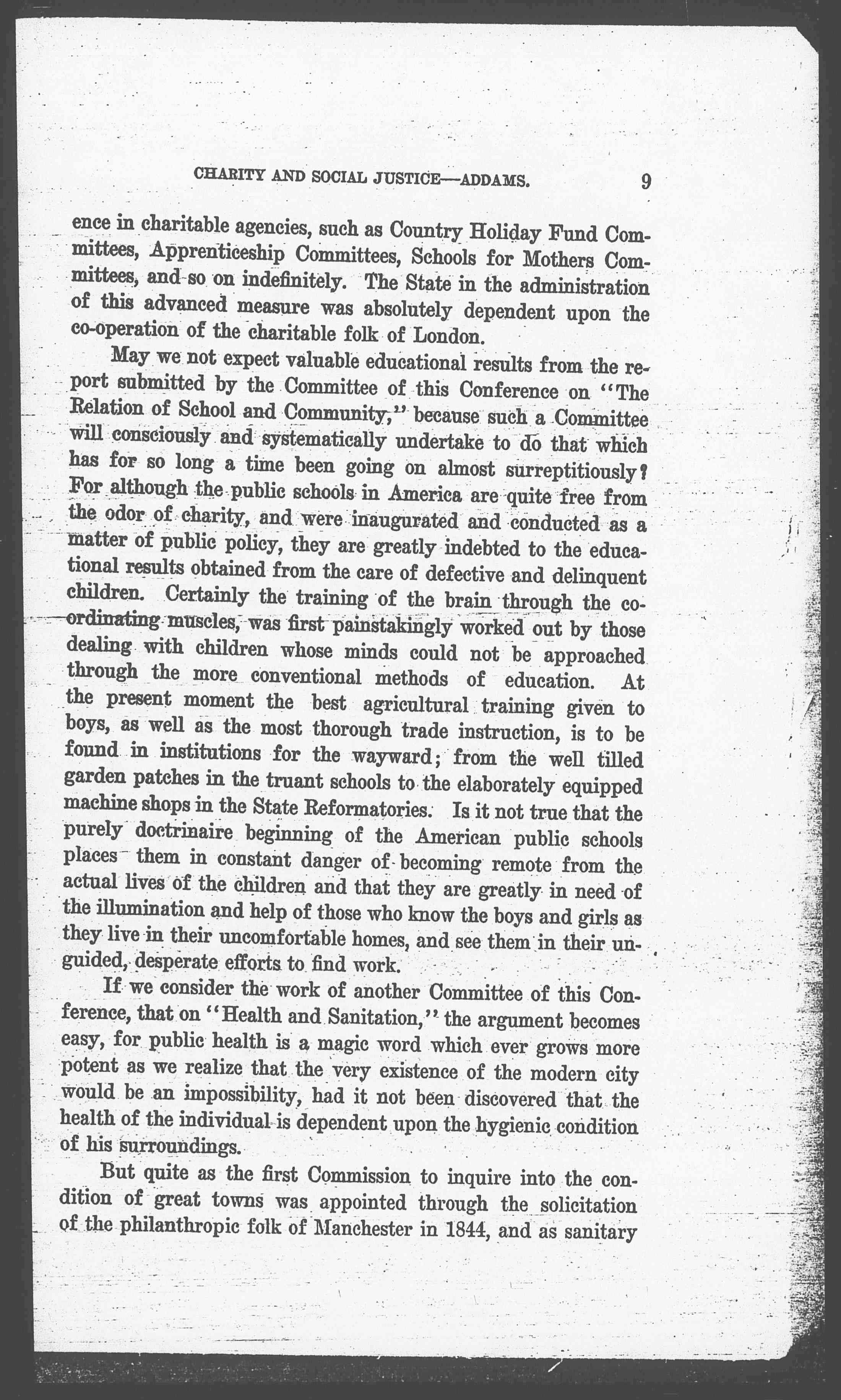 After all human progress is deeply indebted to a study of imperfections and the counsels of [despair] if not full of seasoned wisdom, are at least fertile in suggestion and a desperate spur to action. Moreover in its unending undertaking to reduce the sum of human misery, charity has shared the changes of the passing generations, until like all of its contemporaries of the passing generations, until like all of its contemporaries, it too has become less dogmatic and has assumed the evolutionary way of understanding life; with them it has grown more democratic and has attained greater flexibility of temper. Moreover, modern charity, continually discovering new obligations, has been obliged to call to its aid economics, sanitary science, statistical research, and many other agencies as the program of this Conference will testify. It has therefore through dire need, been forced to recognize that charitable effort is part of the general social movement; somewhat as John Stuart Mill, when he was hard pressed by the problems of life, restored political economy to its proper place as a branch of social philosophy, insisting that it was not a thing by itself, but was an important part of the great whole.