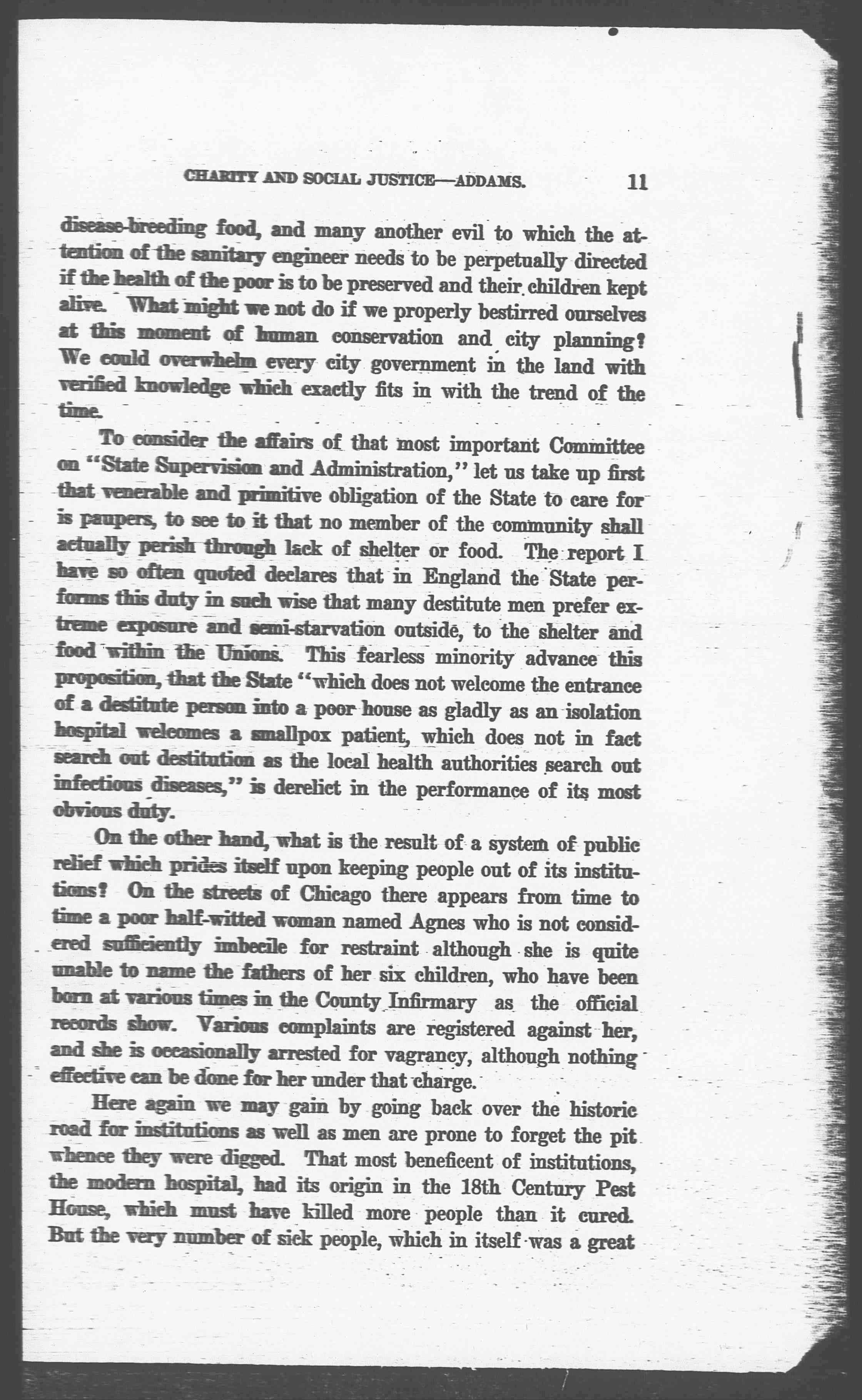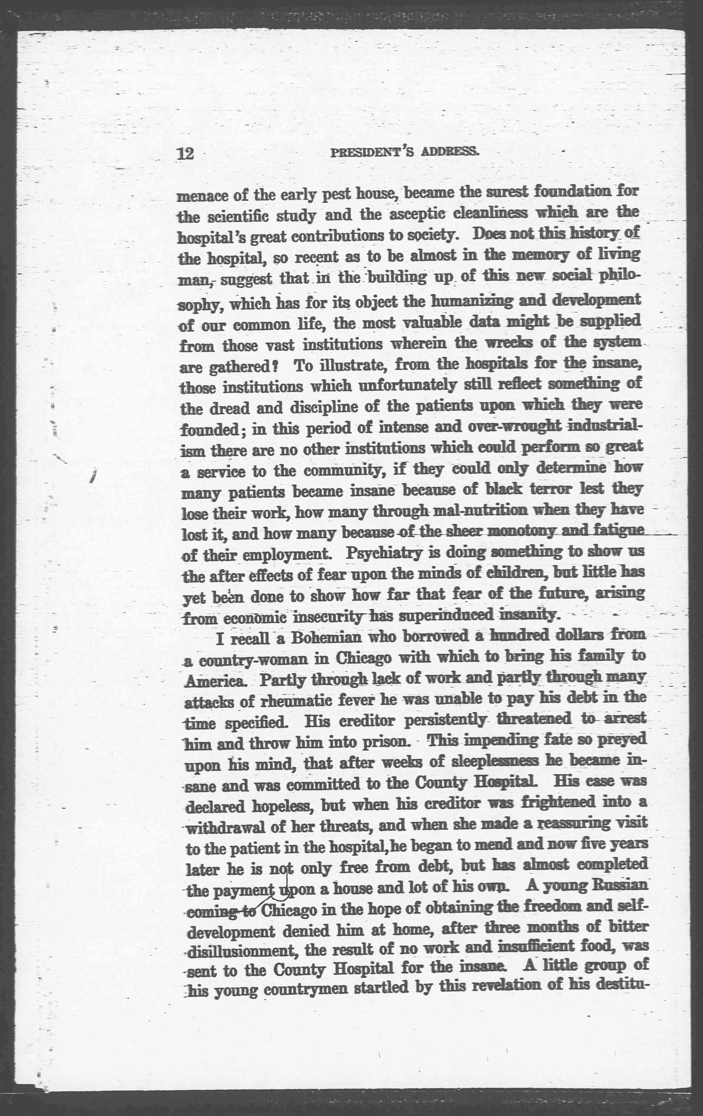 Here again we may gain by going back over the historic road for institutions as well as men are prone to forget the put whence they were digged. That most beneficent of institutions, the modern hospital, had its origin in the 18th Century Pest House, which must have killed more people than it cured. But the very number of sick people, which in itself was a great [page 12] menace of the early pest house, became the surest foundation for the scientific study and the ascetic cleanliness which are the hospital's great contributions to society. Does not this history of the hospital, so recent as to be almost in the memory of living man, suggest that in the building up of this new social philosophy, which has for its object the humanizing and development of our common life, the most valuable data might be supplied from those vast institutions wherein the wrecks of the system are gathered? To illustrate, from the hospitals for the insane, those institutions which unfortunately still reflect something of the dread and discipline of the patients upon which they were founded; in this period of intense and over-wrought industrialism there are no other institutions which could perform so great a service to the community, if they could only determine how many patients became insane because of black terror lest they lose their work, how many through [malnutrition] when they have lost it, and how many because of the sheer monotony and fatigue of their employment. Psychiatry is doing something to show us the after effects of fear upon the minds of children, but little has yet been done to show how far that fear of the future, arising from economic insecurity has superinduced insanity.