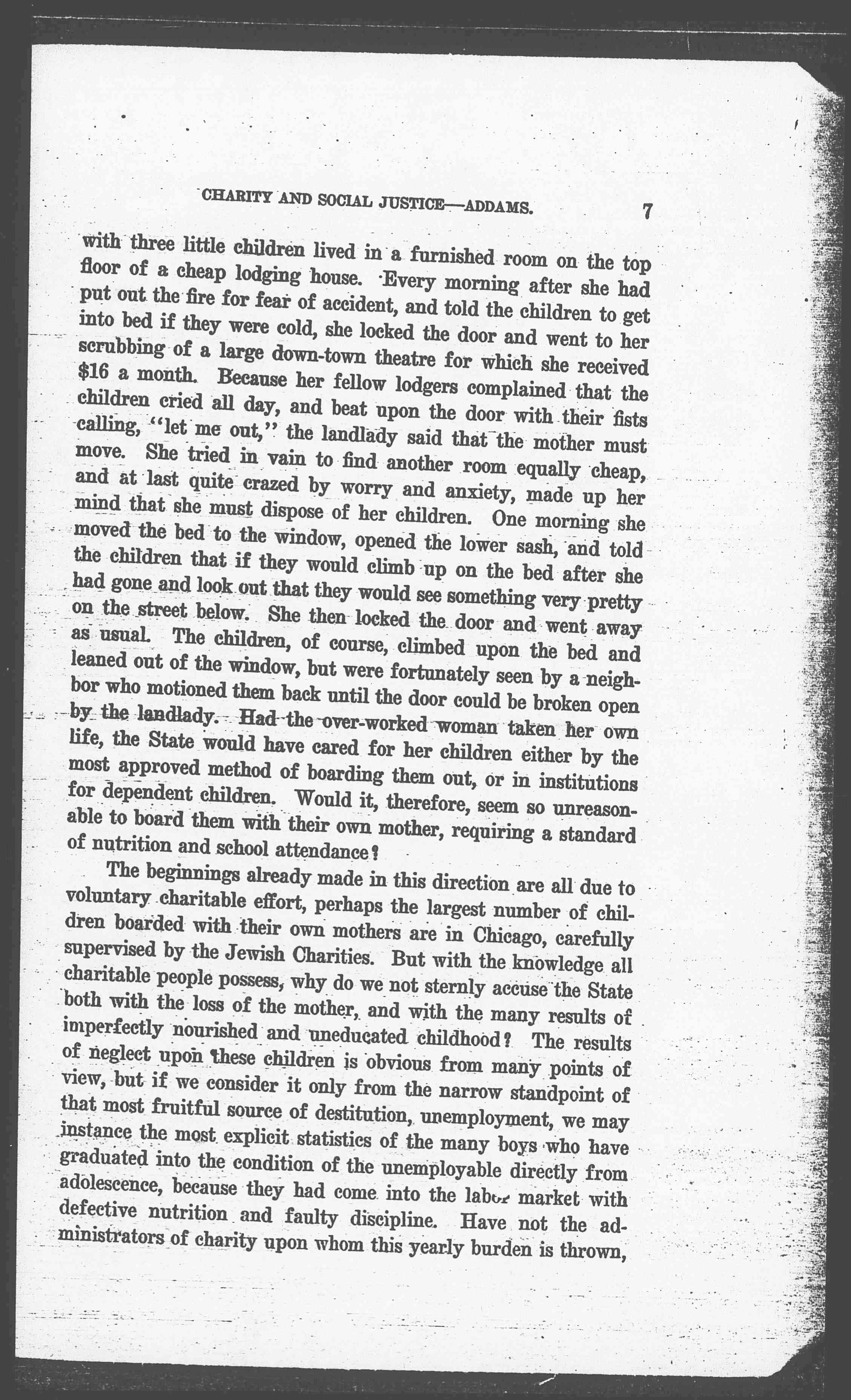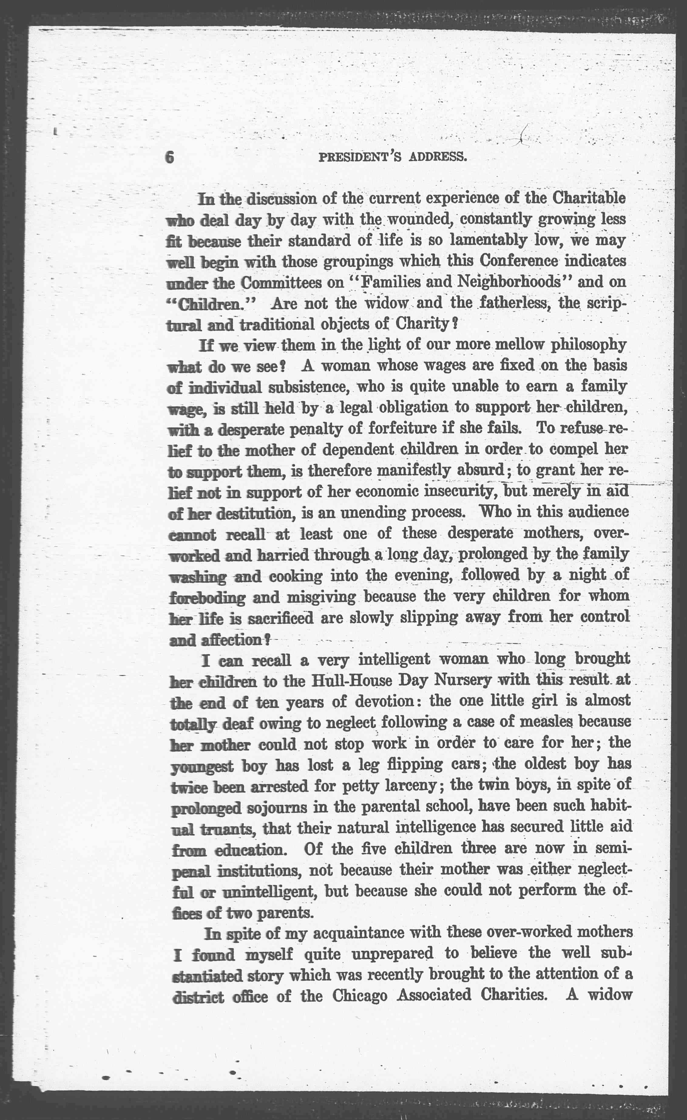 In spite of my acquaintance with these over-worked mothers I found myself quite unprepared to believe the well substantiated story which was recently brought to the attention of a district office of the Chicago Associated Charities. A widow [page 7] with three little children lived in a furnished room on the top floor of a cheap lodging house. Every morning after she had put out the fire for fear of accident, and told the children to get into bed if they were cold, she locked the door and went to her scrubbing of a large [downtown] [theater] for which she received $16 a month. Because her fellow lodgers complained that the children cried all day, and beat upon the door with their fists calling, "let me out," the landlady said that the mother must move. She tried in vain to find another room equally cheap, and at last quite crazed by worry and anxiety, made up her mind that she must dispose of her children. One morning she moved the bed to the window, opened the lower sash, and told the children that if they would climb up on the bed after she had gone and look out that they would see something very pretty on the street below. She then locked the door and went away as usual. The children, of course, climbed upon the bed and leaned out of the window, but were fortunately seen by a neighbor who motioned them back until the door could be broken open by the landlady. Had the over-worked woman taken her own life, the State would have cared for her children either by the most approved method of boarding them out, or in institutions for dependent children. Would it, therefore, seem so unreasonable to board them with their own mother, requiring a standard of nutrition and school attendance?