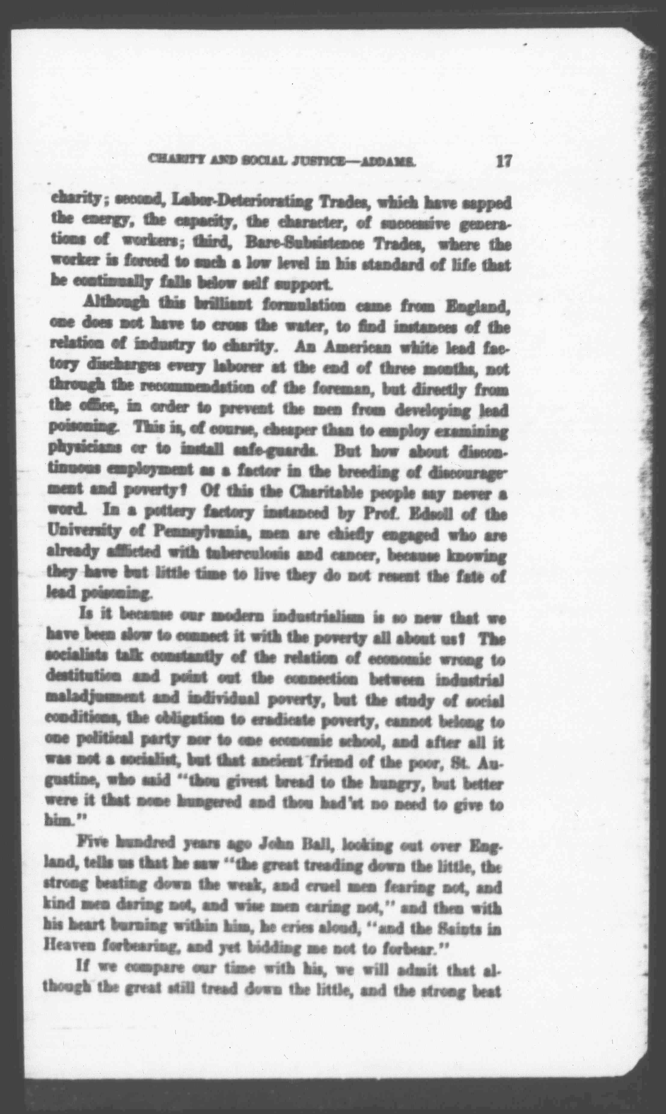 Although this brilliant formulation came from England, one does not have to cross the water, to find instances of the relation of industry to charity. An American white lead factory discharges every laborer at the end of three months, not through the recommendation of the foreman, but directly from the office, in order to prevent the men from developing lead poisoning. This is, of course, cheaper than to employ examining physicians or to install [safeguards]. But how about discontinuous employment as a factor in the breeding of discouragement and poverty? Of this the Charitable people say never a word. In a pottery factory instanced by Prof. Edsell of the University of Pennsylvania, men are chiefly engaged who are already afflicted with tuberculosis and cancer, because knowing they have but little time to live they do not resent the fate of lead poisoning.