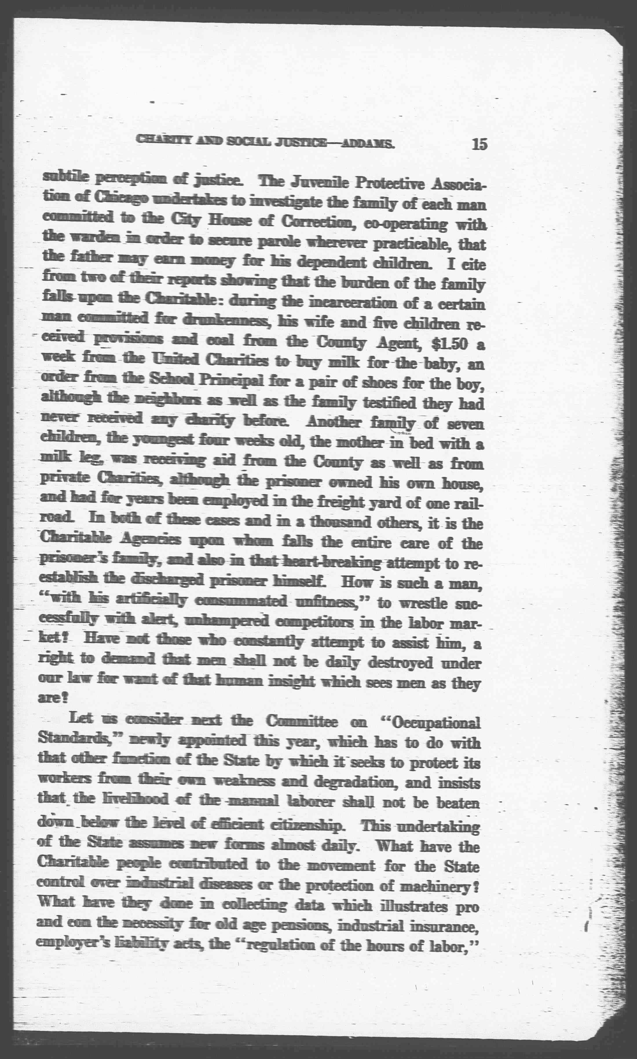Certainly upon the Charitable and upon no one else falls the care of the prisoner's family during his incarceration, and this in spite of the fact that Detroit is making an effort to support the prisoner's family from the earnings of the prisoner and that Washington has done much already in the direction of securing family support from the prisoner himself, and Cleveland has added to that, the prisoner's reinstatement. Although the present Mayor of Chicago issues so many pardons that he practically does away with the work of one municipal judge each year, if these pardons were issued not for political reasons, but were based upon the popular plea that the prisoner has a wife and little children to care for, one might be almost willing to accept them in lieu of any reasonable arrangements to care for the prisoner's family and as one of those first blind efforts to meet the popular demand for mercy so often founded upon a [page 15] subtle perception of justice. The Juvenile Protective Association of Chicago undertakes to investigate the family of each man committed to the City House of Correction, [cooperating] with the warden in order to secure parole wherever practicable, that the father may earn money for his dependent children. I cite from two of their reports showing that the burden of the family falls upon the Charitable: during the incarceration of a certain man committed for drunkenness, his wife and five children received provisions and coal from the County Agent, $1.50 a week from the United Charities to buy milk for the baby, an order from the School Principal for a pair of shoes for the boy, although the neighbors as well as the family testified they had never received any charity before. Another family of seven children, the youngest four weeks old, the mother in bed with a milk leg, was receiving aid from the County as well as from private Charities, although the prisoner owned his own house, and had for years been employed in the freight yard of one railroad. In both of these cases and in a thousand others, it is the Charitable Agencies upon whom falls the entire care of the prisoner's family, and also in that heart-breaking attempt to reestablish the discharged prisoner himself. How is such a man, "with his artificially consummated unfitness," to wrestle successfully with alert, unhampered competitors in the labor market? Have not those who constantly attempt to assist him, a right to demand that men shall not be daily destroyed under our law for want of that human insight which sees men as they are?