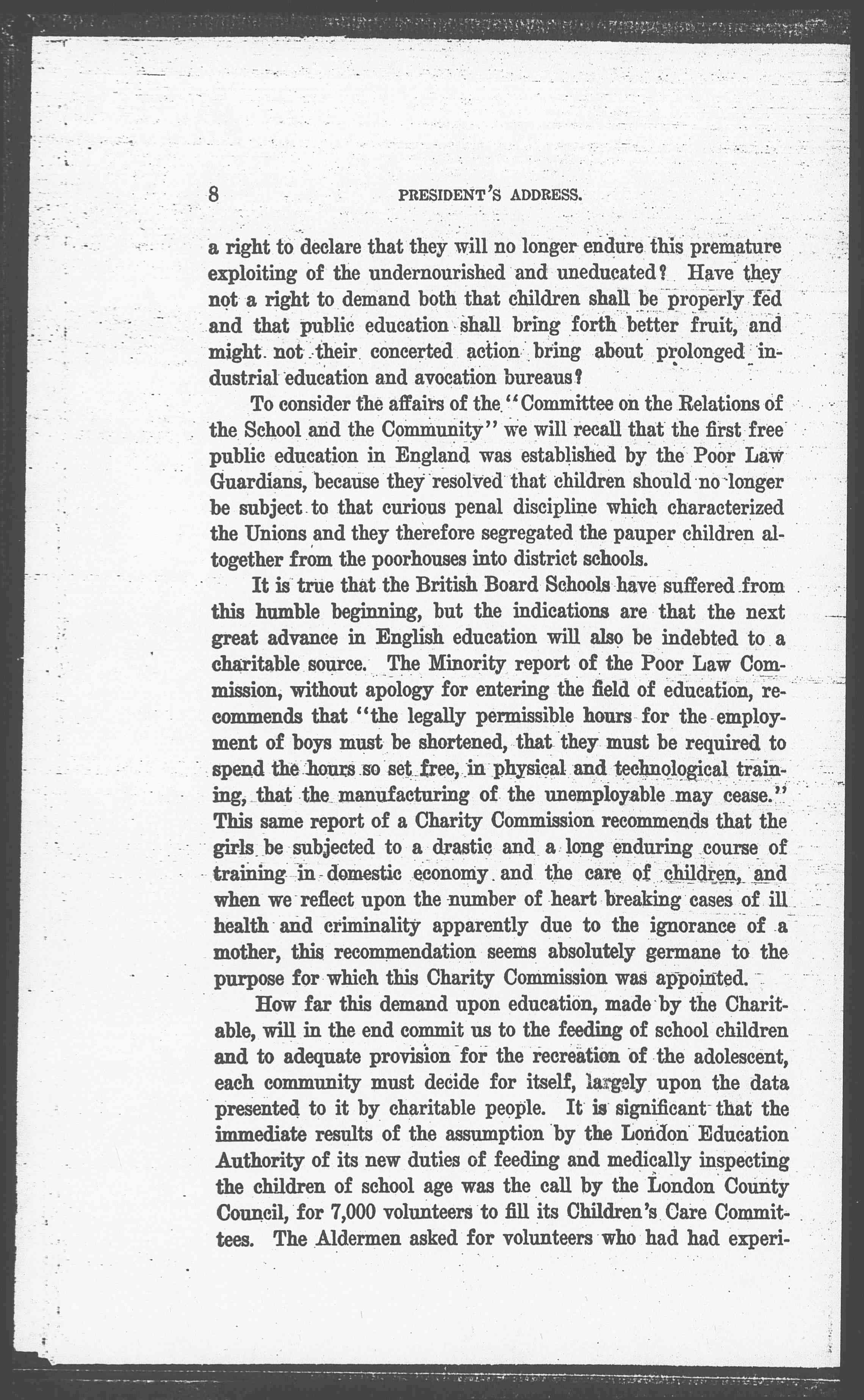 How far this demand upon education, made by the Charitable, will in the end commit us to the feeding of school children and to adequate provision for the recreation of the adolescent, each community must decide for itself, largely upon the data presented to it by charitable people. It is significant that the immediate results of the assumption by the London Education Authority of its new duties of feeding and medically inspecting the children of school age was the call by the London County Council, for 7,000 volunteers to fill its Children's Care Committees. The Aldermen asked for volunteers who had had experience [page 9] in charitable agencies, such as Country Holiday Fund Committees, Apprenticeship Committees, Schools for Mothers Committees, and so on indefinitely. The State in the administration of this advanced measure was absolutely dependent upon the [cooperation] of the charitable folk of London.
