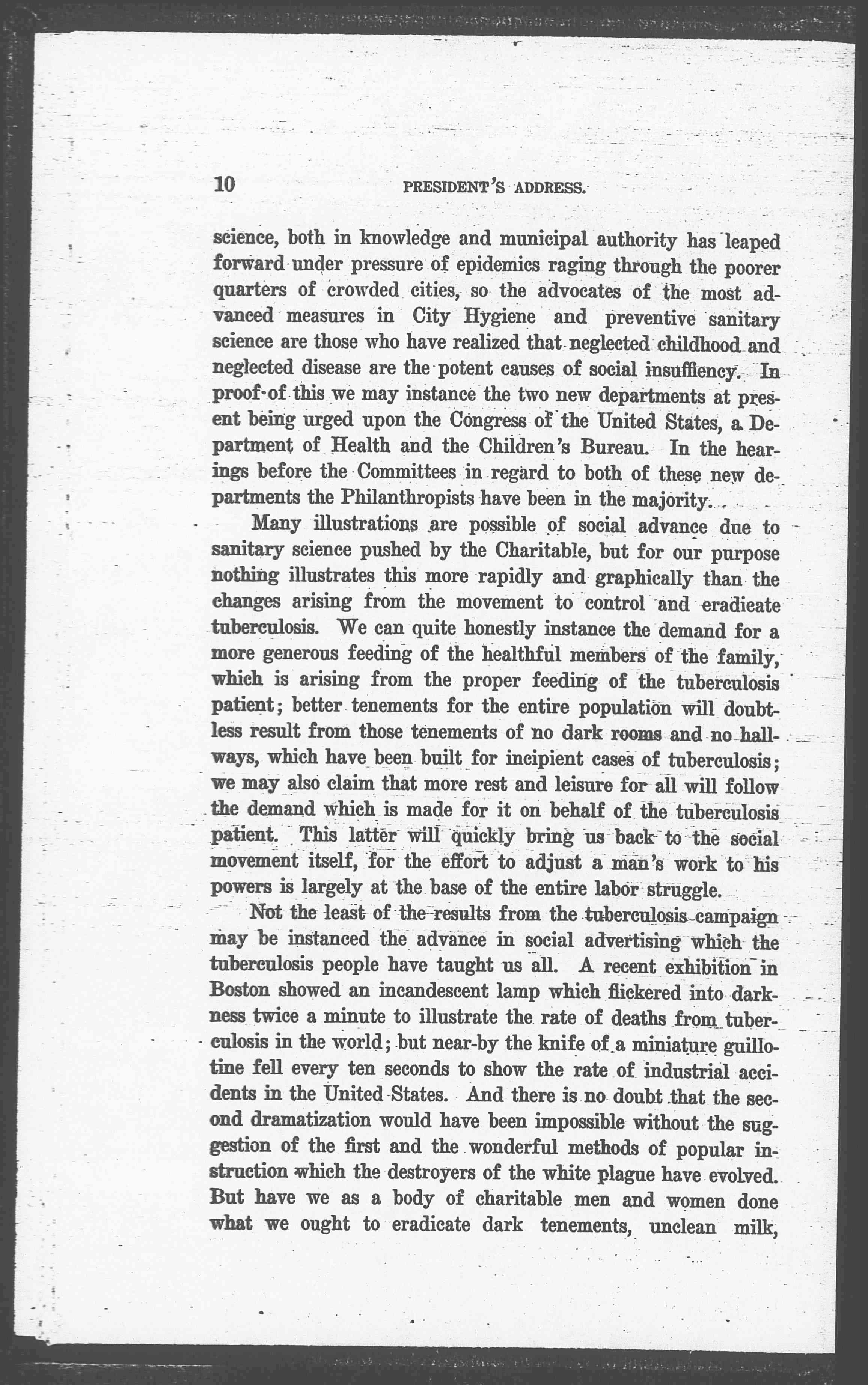 Not the least of the results from the tuberculosis campaign may be instanced the advance in social advertising which the tuberculosis people have taught us all. A recent exhibition in Boston showed an incandescent lamp which flickered into darkness twice a minute to illustrate the rate of deaths from tuberculosis in the world; but [nearby] the knife of a miniature guillotine fell every ten seconds to show the rate of industrial accidents in the United States. And there is no doubt that the second dramatization would have been impossible without the suggestion of the first and the wonderful methods of popular instruction which the destroyers of the white plague have evolved. But have we as a body of charitable men and women done what we ought to eradicate dark tenements, unclean milk, [page 11] disease-breeding food, and many another evil to which the attention of the sanitary engineer needs to be perpetually directed if the health of the poor is to be preserved and their children kept alive. What might we not do if we properly bestirred ourselves at this moment of human conservation and city planning? We could overwhelm every city government in the land with verified knowledge which exactly fits in with the trend of the time.