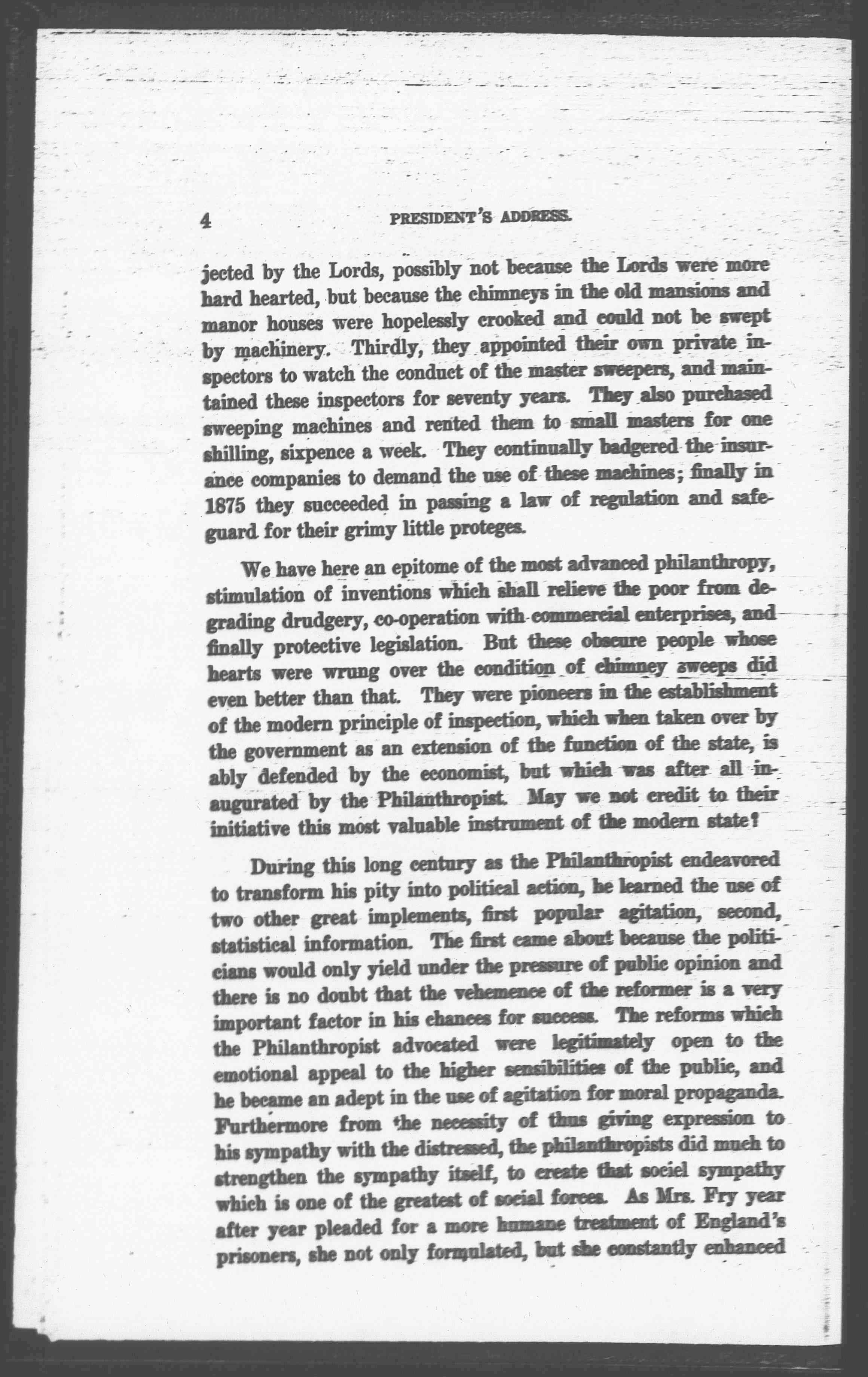 To begin with the most important: How far have the Philanthropists contributed to the formation of the modern state, not because they would surrender their own personal sentiments of pity and justice, but because they realized how inadequate these were unless they could find expression as an integral branch of corporate government. Through a century, therefore, in anticipation of coming changes which does so much to bring changes about, the Philanthropists have been steadily engaged in making a new State. We may concretely illustrate this process of State making by a century of effort in England to protect chimney sweeps, certainly a modest undertaking. "The Society for Superseding the Work of Climbing Boys" was founded in 1803 by some kind hearted people whose names have not been preserved. They first offered a prize of two hundred pounds for the best sweeping machine which should obviate the necessary for boys. Secondly they promoted a bill to protect the boys, but although it passed the House of Commons, it was rejected [page 4] by the Lords, possibly not because the Lords were more hard hearted, but because the chimneys in the old mansions and manor houses were hopelessly crooked and could not be swept by machinery. Thirdly, they appointed their own private inspectors to watch the conduct of the master sweepers, and maintained these inspectors for seventy years. They also purchased sweeping machines and rented them to small masters for one shilling, sixpence a week. They continually badgered the insurance companies to demand the use of these machines; finally in 1875 they succeeded in passing a law of regulation and [safeguard] for their grimy little protégés.