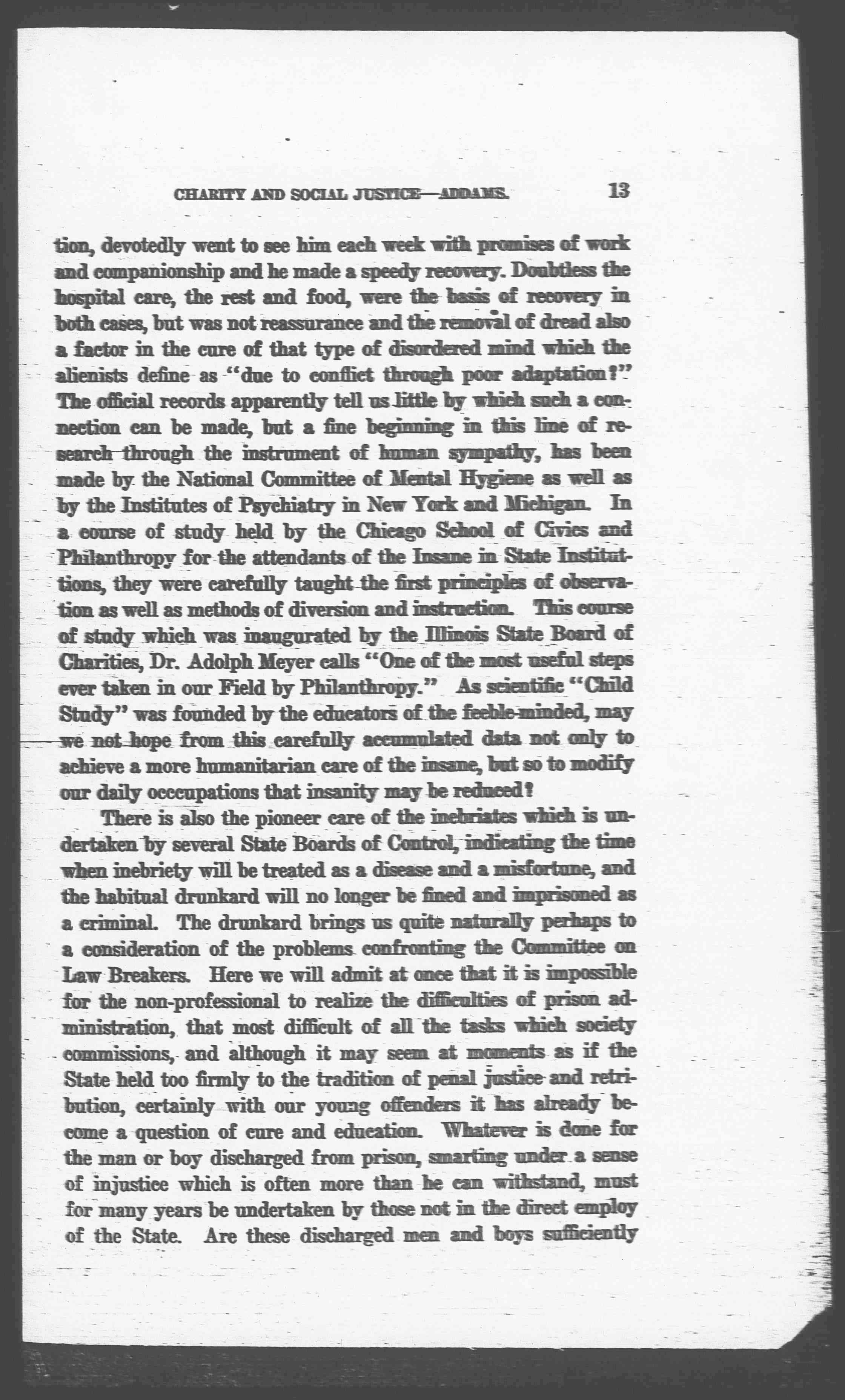 I recall a Bohemian who borrowed a hundred dollars from a country-woman in Chicago with which to bring his family to America. Partly through lack of work and partly through many attacks of rheumatic fever he was unable to pay his debt in the time specified. His creditor persistently threatened to arrest him and throw him into prison. This impending fate so preyed upon his mind, that after weeks of sleeplessness he became insane and was committed to the County Hospital. His case was declared hopeless, but when his creditor was frightened into a withdrawal of her threats, and when she made a reassuring visit to the patient in the hospital, he began to mend and now five years later he is not only free from debt, but has almost completed the payment upon a house and lot of his own. A young Russian coming to Chicago in the hope of obtaining the freedom and self-development denied him at home, after three months of bitter disillusionment, the result of no work and insufficient food, was sent to the County Hospital for the insane. A little group of his young countrymen startled by this revelation of his destitution, [page 13] devotedly went to see him each week with promises of work and companionship and he made a speedy recovery. Doubtless the hospital care, the rest and food, were the basis of recovery in both cases, but was not reassurance and the removal of dread also a factor in the cure of that type of disordered mind which the alienists define as "due to conflict through poor adaptation?" The official records apparently tell us little by which such a connection can be made, but a fine beginning in this line of research through the instrument of human sympathy, has been made by the National Committee of Mental Hygiene as well as by the Institutes of Psychiatry in New York and Michigan. In a course of study held by the Chicago School of Civics and Philanthropy for the attendants of the Insane in State Institutions, they were carefully taught the first principles of observation as well as methods of diversion and instruction. This course of study which was inaugurated by the Illinois State Board of Charities, Dr. Adolph Meyer calls "One of the most useful steps ever taken in our Field by Philanthropy." As scientific "Child Study" was founded by the educators of the feeble-minded, may we not hope from this carefully accumulated data not only to achieve a more humanitarian care of the insane, but so to modify our daily occupations that insanity may be reduced?