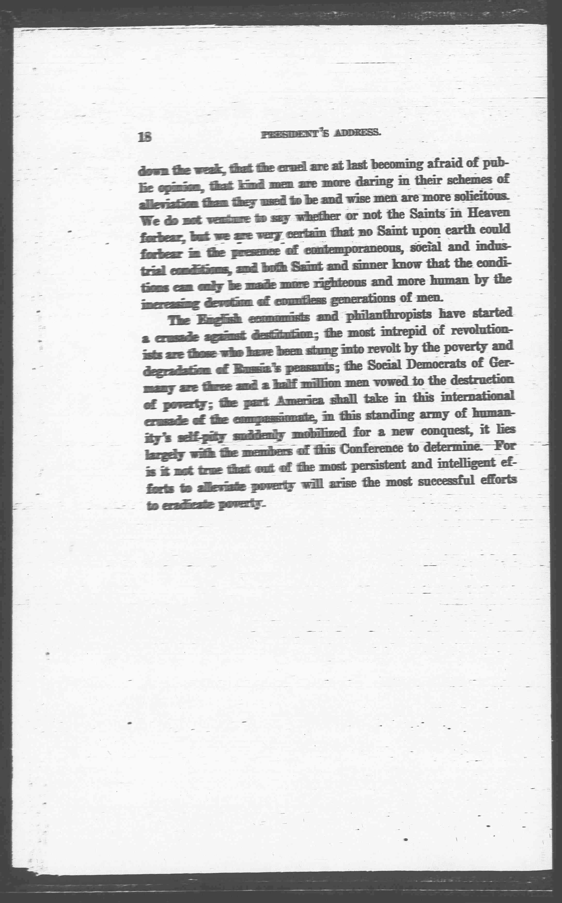 The English economists and philanthropists have started a crusade against destitution; the most intrepid of revolutionists are those who have been stung into revolt by the poverty and degradation of Russia's peasants; the Social Democrats of Germany are three and a half million men vowed to the destruction of poverty; the part America shall take in this international crusade of the compassionate, in this standing army of humanity's self-pity suddenly mobilized for a new conquest, it lies largely with the members of this Conference to determine. For is it not true that out of the most persistent and intelligent efforts to alleviate poverty will arise the most successful efforts to eradicate poverty.