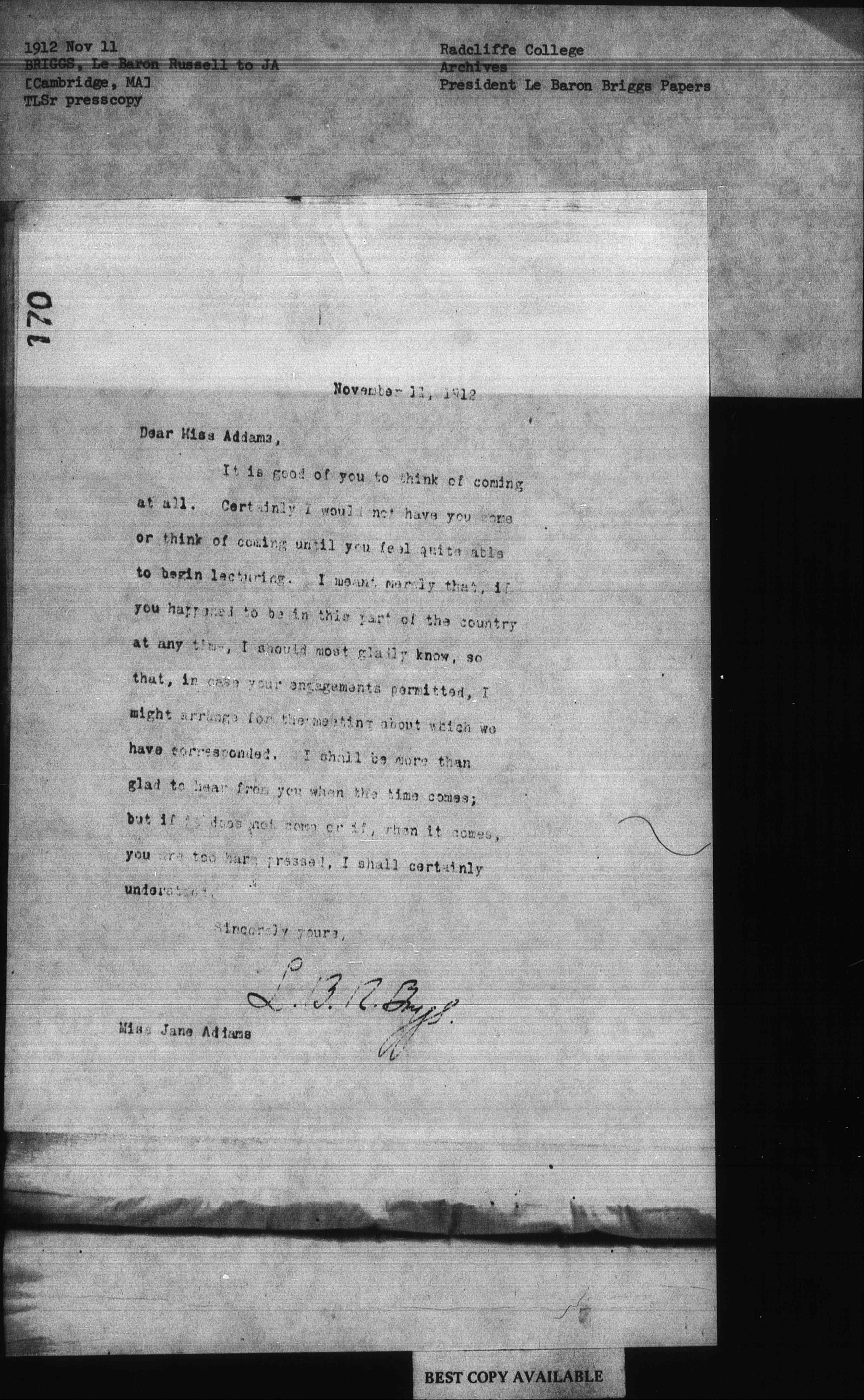 Dear Miss Addams,It is good of you to think of coming at all. Certainly I would not have you come or think of coming until you feel quite able to begin lecturing. I meant merely that, if you happened to be in this part of the country at any time, I should most gladly know, so that, in case you engagements permitted, I might arrange for the meeting about which we have corresponded. I shall be more than glad to hear from you when the time comes; but if it does not come or if, when it comes, you are too hard pressed, I shall certainly understand.