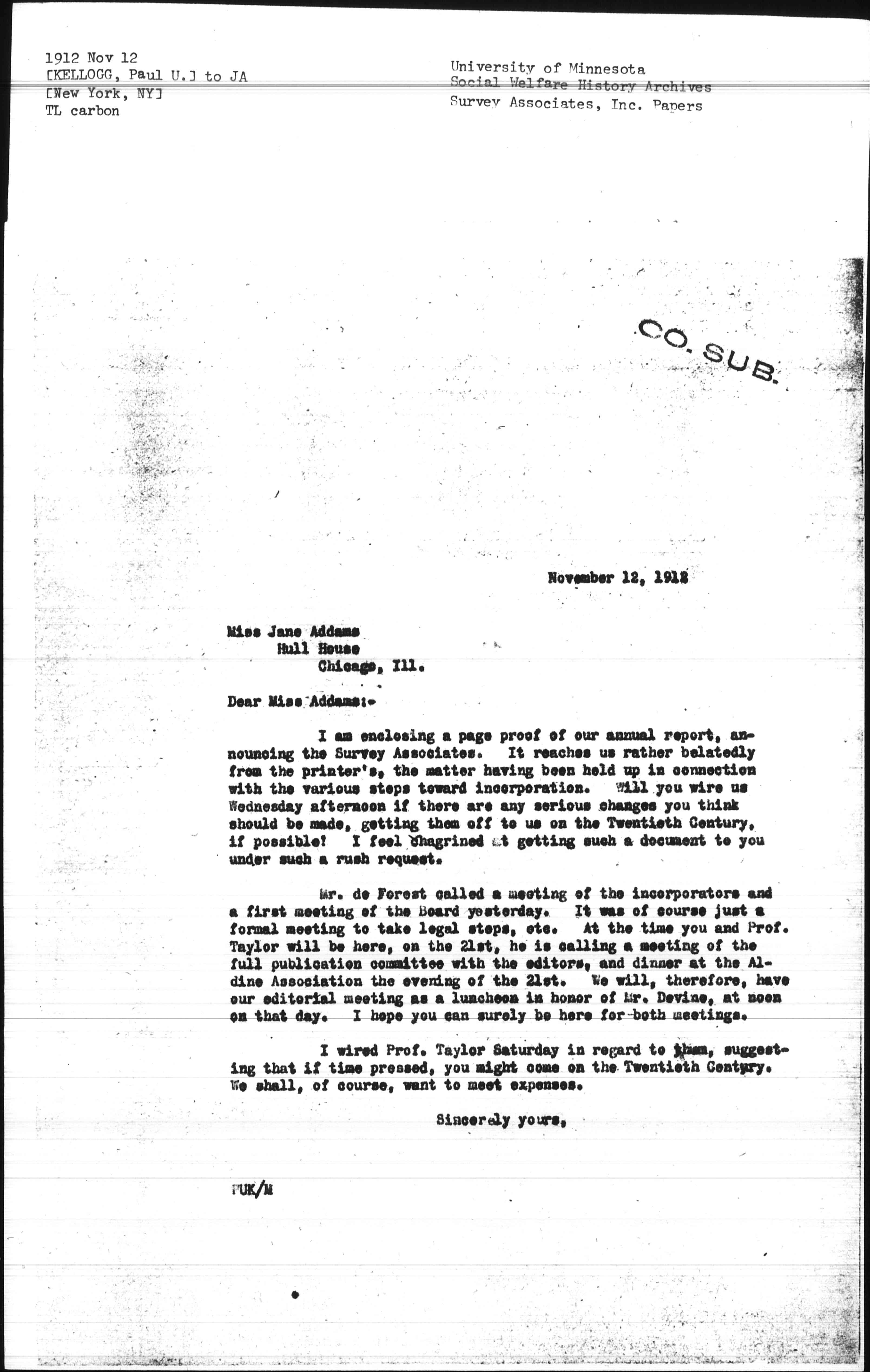 Mr. DeForest called a meeting of the incorporators and a first meeting of the Board yesterday. It was of course just a formal meeting to take legal steps, etc. At the time you and Prof. Taylor will be here, on the 21st, he is calling a meeting of the full publication committee with the editors, and dinner at the Aldine Association the evening of the 21st. We will, therefore, have our editorial meeting as a luncheon in honor of Mr. Devine, at noon on that day. I hope you can surely be here for both meetings.