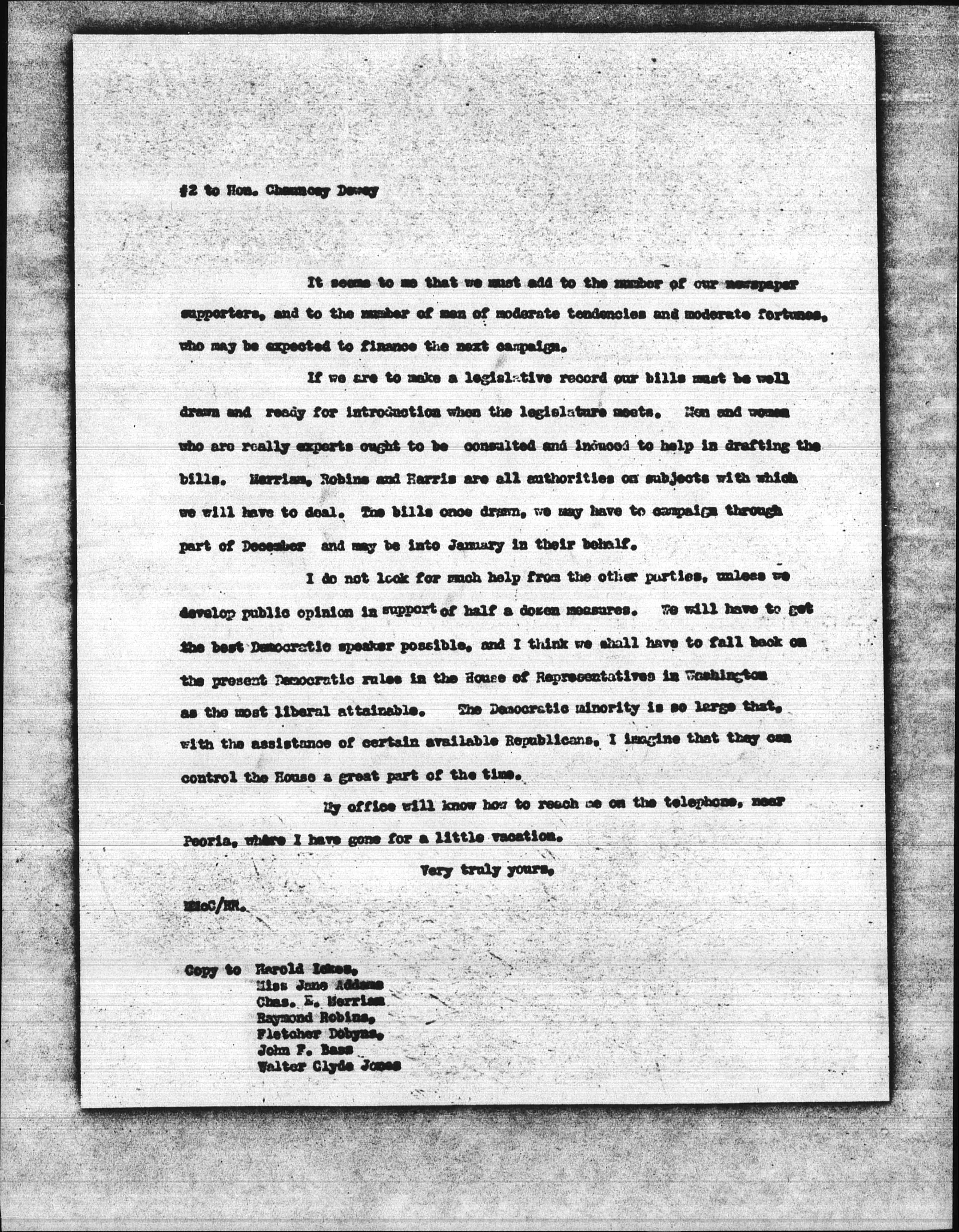I do not look for much help from the other parties, unless we develop public opinion in support of half a dozen measures. We will have to get the best Democratic speaker possible, and I think we shall have to fall back on the present Democratic rules in the House of Representatives in Washington as the most liberal attainable. The Democratic minority is so large that, with the assistance of certain available Republicans, i imagine that they can control the Hose a great part of the time.