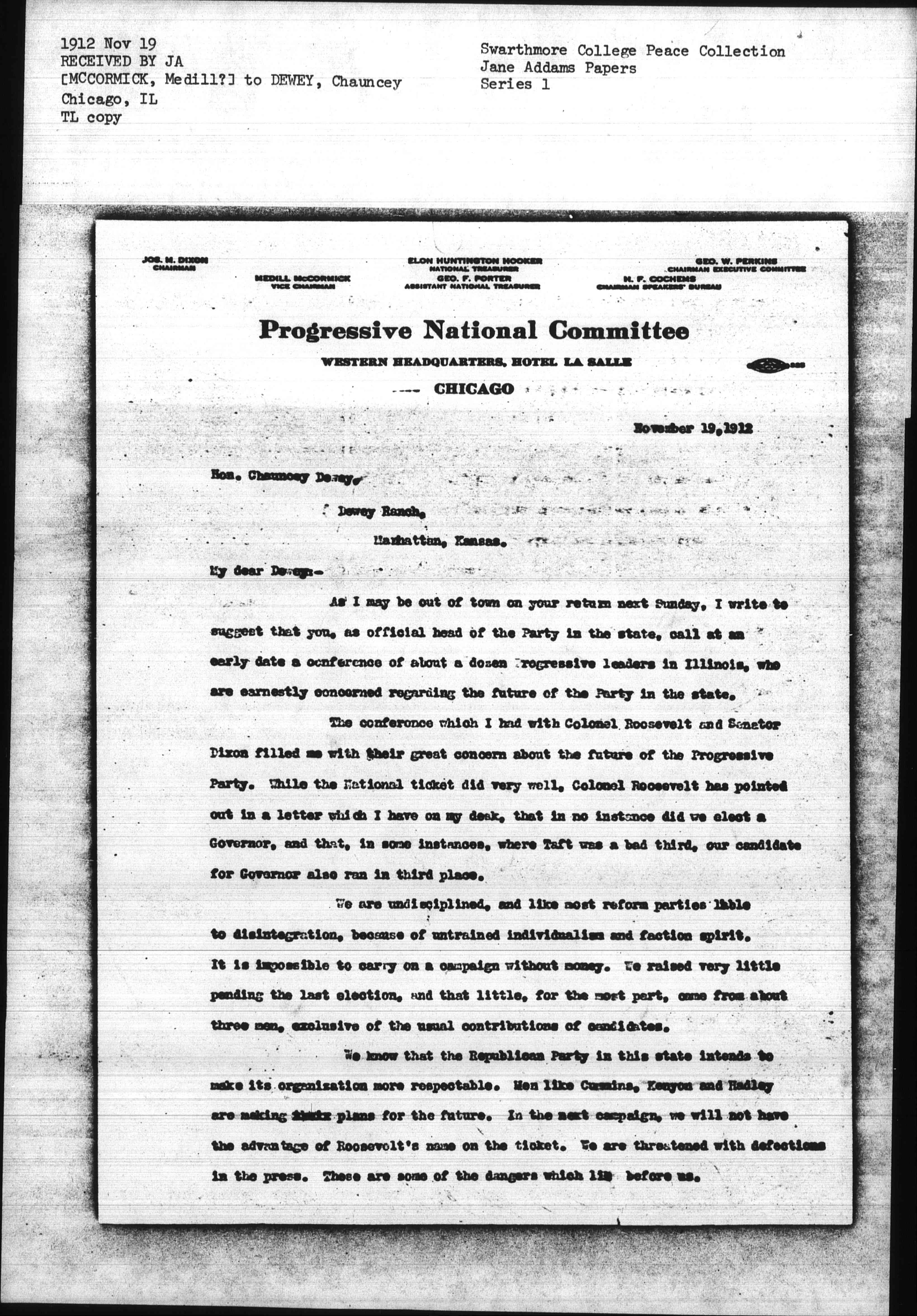 The conference which I had with Colonel Roosevelt and Senator Dixon filled me with their great concern about the future of the Progressive Party. While the National ticket did very well, Colonel Roosevelt had pointed out in a letter which I have on my desk, that in no instance did we elect a Governor, and that, in some instances, where Taft was a bad third, our candidate for Governor also ran in third place.