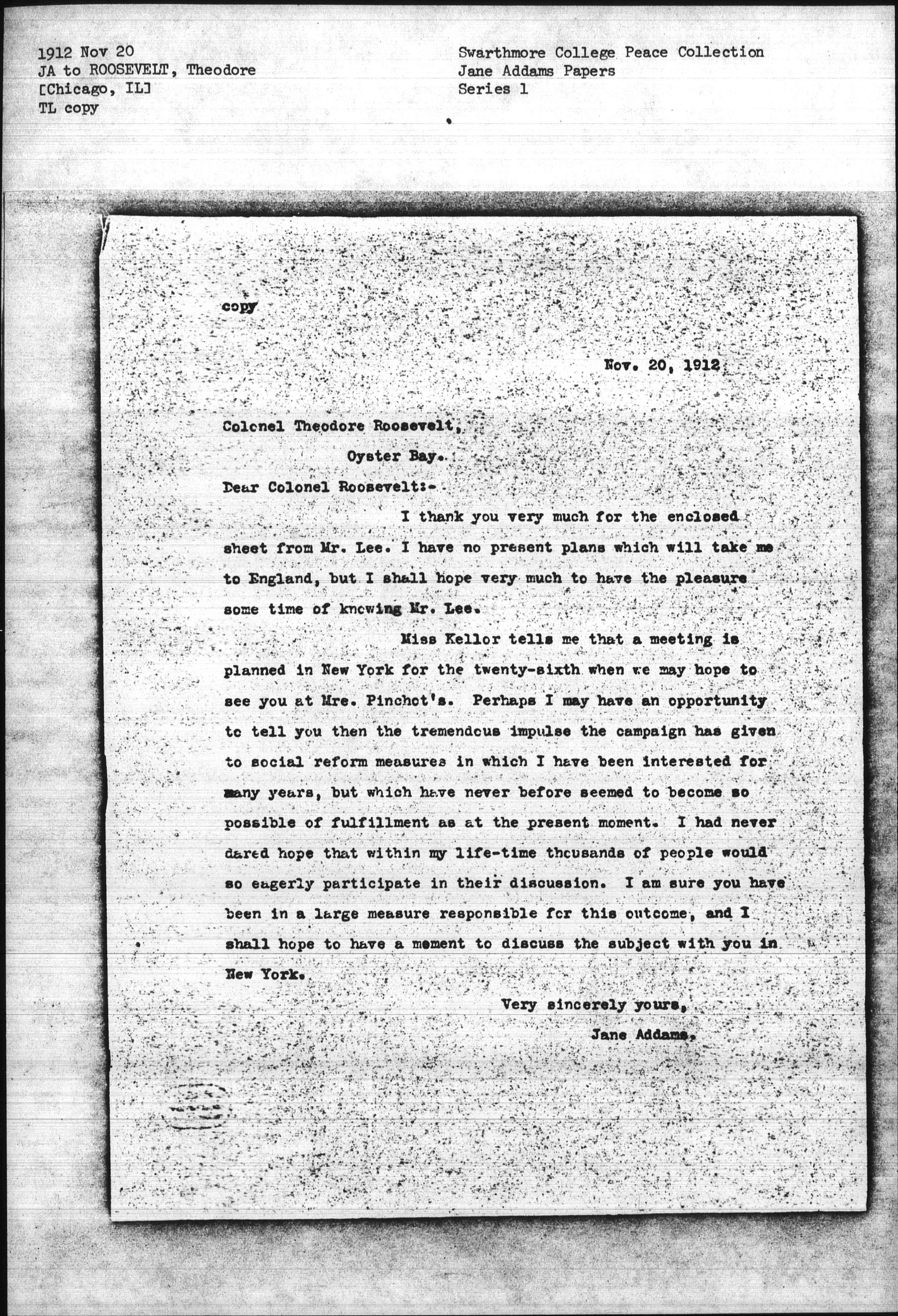 Miss Kellor tells me that a meeting is planned in New York for the twenty-sixth when we may hope to see you at Mr. Pinchot's. Perhaps I may have an opportunity to tell you then the tremendous impulse the campaign has given to social reform measures in which I have been interested for many years, but which have never before seemed to become so possible of fulfillment as at the present moment. I had never dared hope that written my life-time thousands of people would so eagerly participate in their discussion. I am sure you have been in a large measure responsible for this outcome, and I shall hope to have a moment to discuss the subject with you in New York.