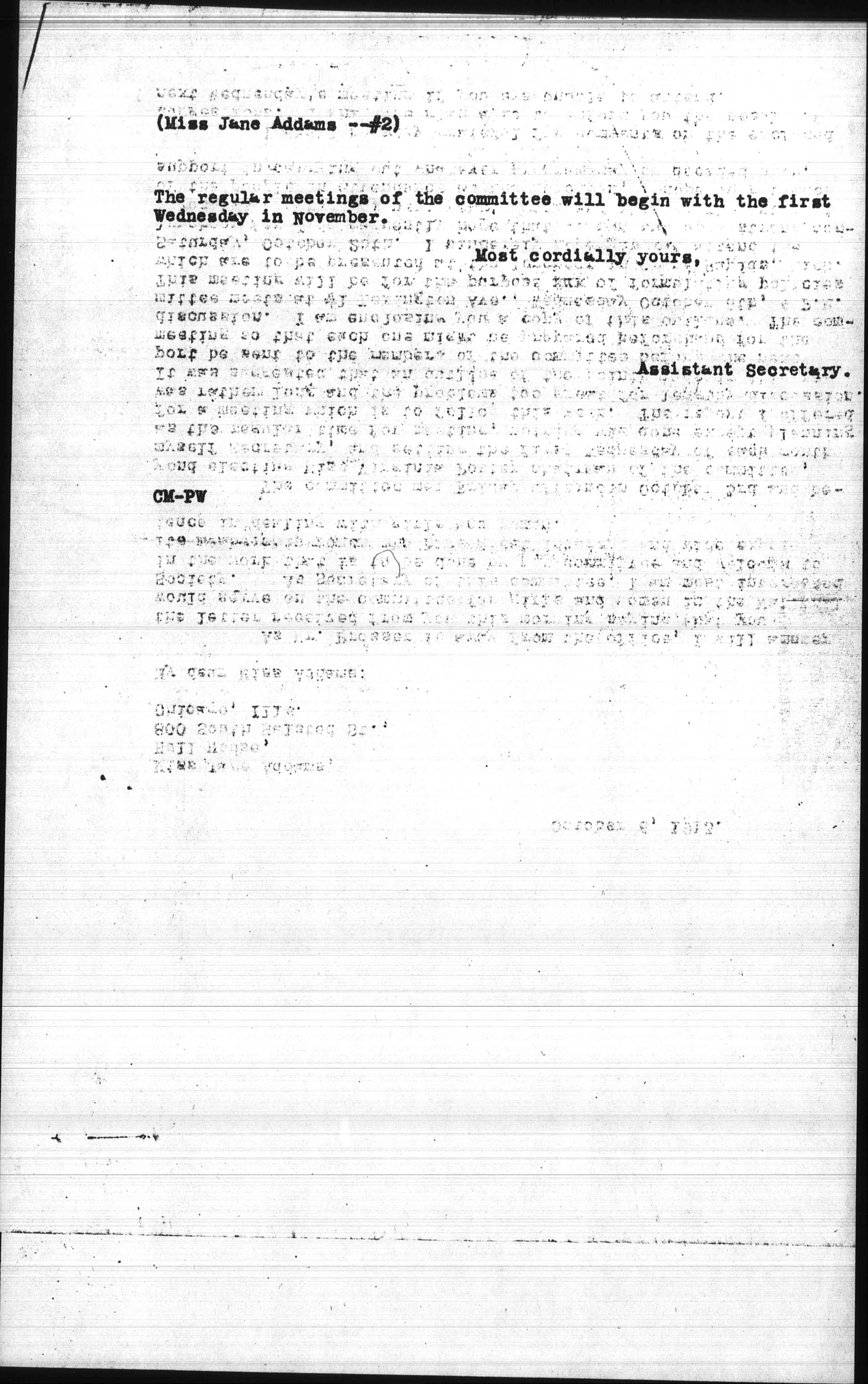 The committee met Friday afternoon October 3rd and beyond electing Miss Virginia Potter chairman of the committee, myself Secretary, and setting the first Wednesday of each month as the regular time for meeting, nothing was done except planning for a meeting which is to follow this week. The report I offered was rather long and the problems too great for lengthy discussion. It was suggested that an outline of the points made in this report be sent to the members of the committee before the next meeting so that each one might be prepared beforehand for the discussion. I am enclosing you a copy of this outline. The committee meets at #1 Lexington Ave., Wednesday October 8th, 4 P.M. This meeting will be for the purpose of formulating policies which are to be presented at the luncheon in Grand Rapids, Mich. Saturday, October 25th. I sincerely hope you can attend the luncheon for I do earnestly hope that we can put up a strong constructive program for next year's work and through the interest of the people in attendance at the luncheon, I hope to get much support in carrying out whatever program may be decided upon.