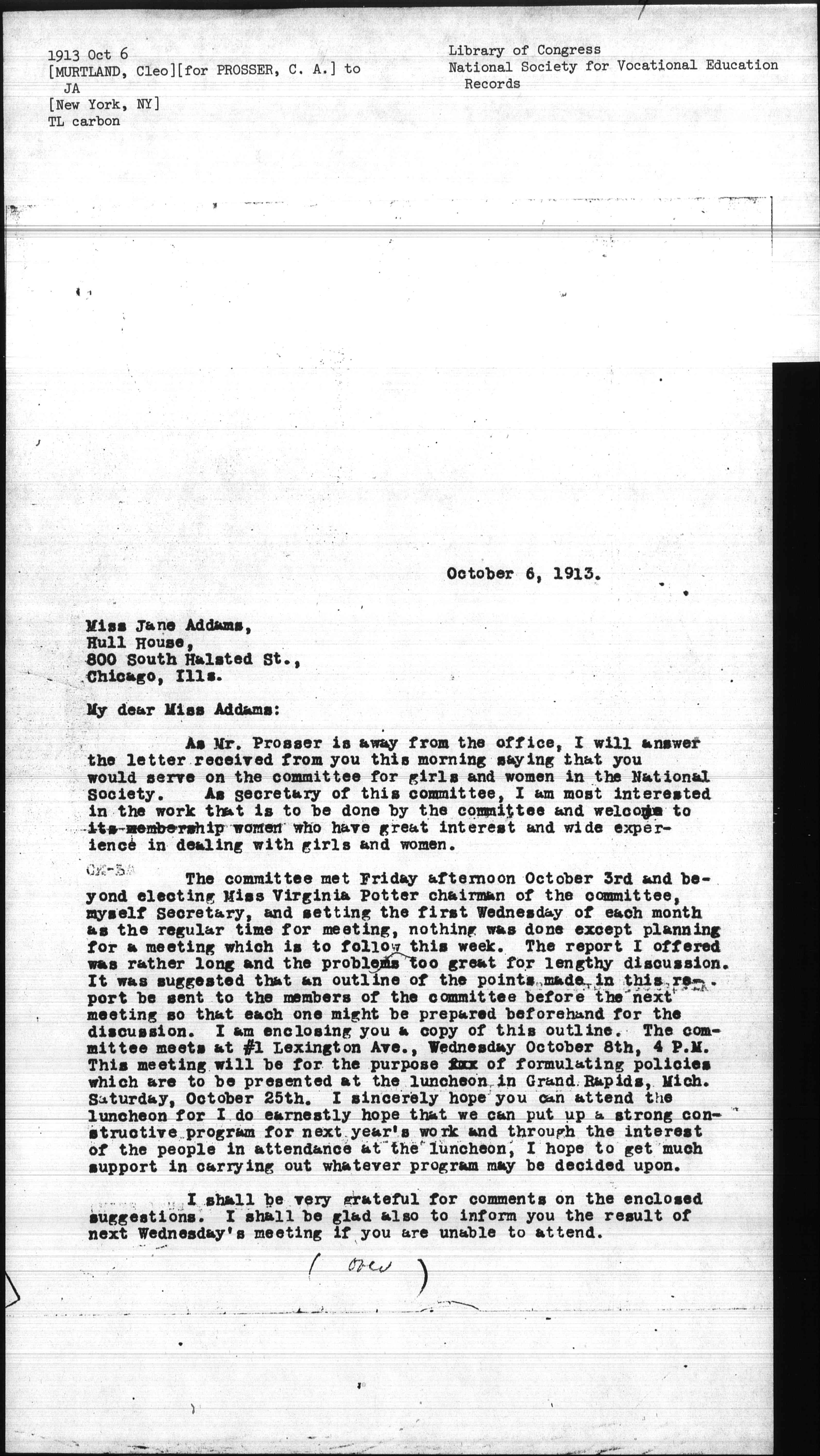 As Mr. Prosser is away from the office, I will answer the letter received from you this morning saying that you would serve on the committee for girls and women in the National Society. As Secretary of this committee, I am most interested in the work that is to be done by the committee and welcome to its membership women who have great interest and wide experience in dealing with girls and women.