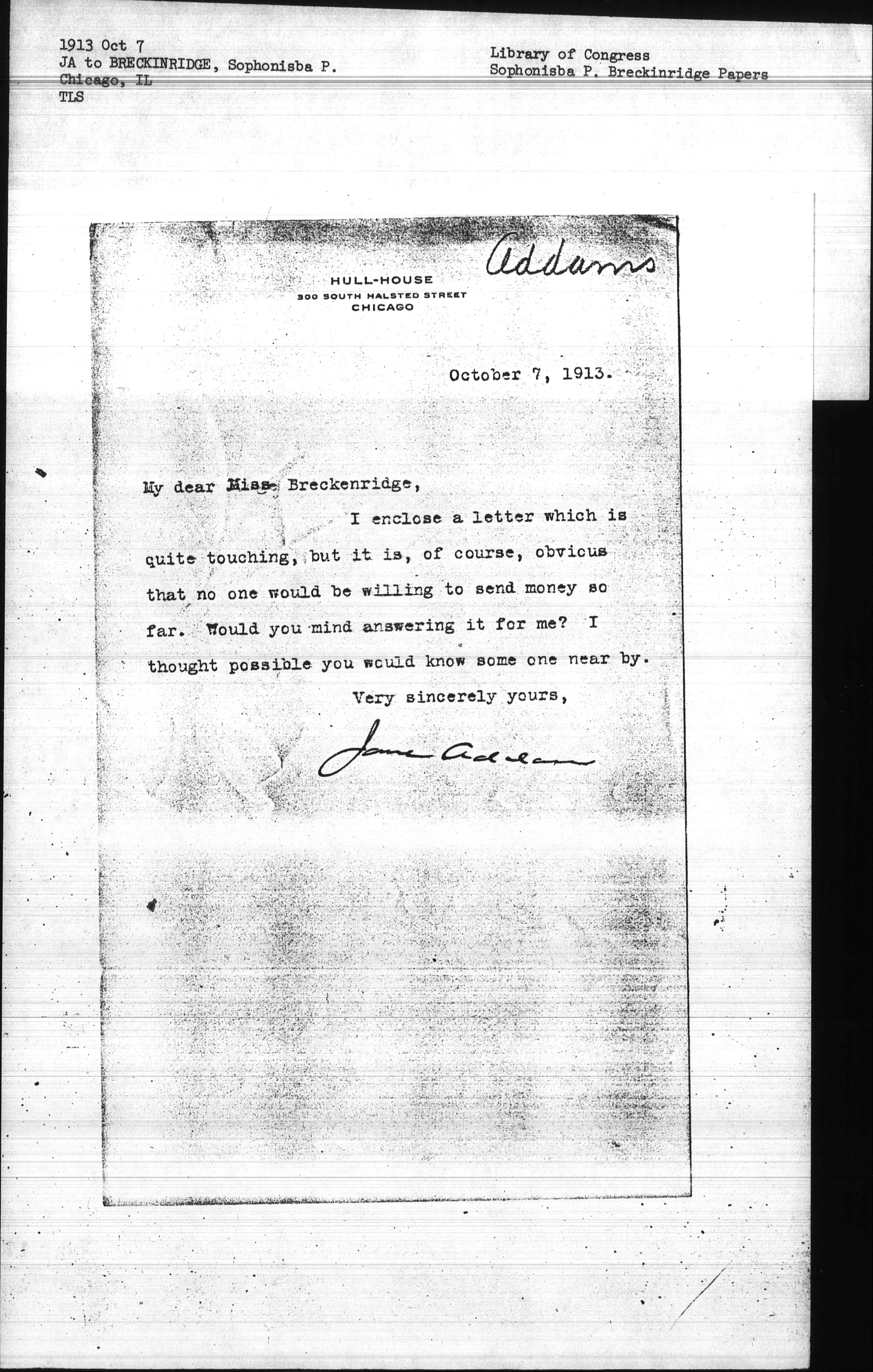 I enclose a letter which is quite touching, but it is, of course, obvious that no one would be willing to send money so far. Would you mind answering it for me? I thought possible you would know some one [nearby].