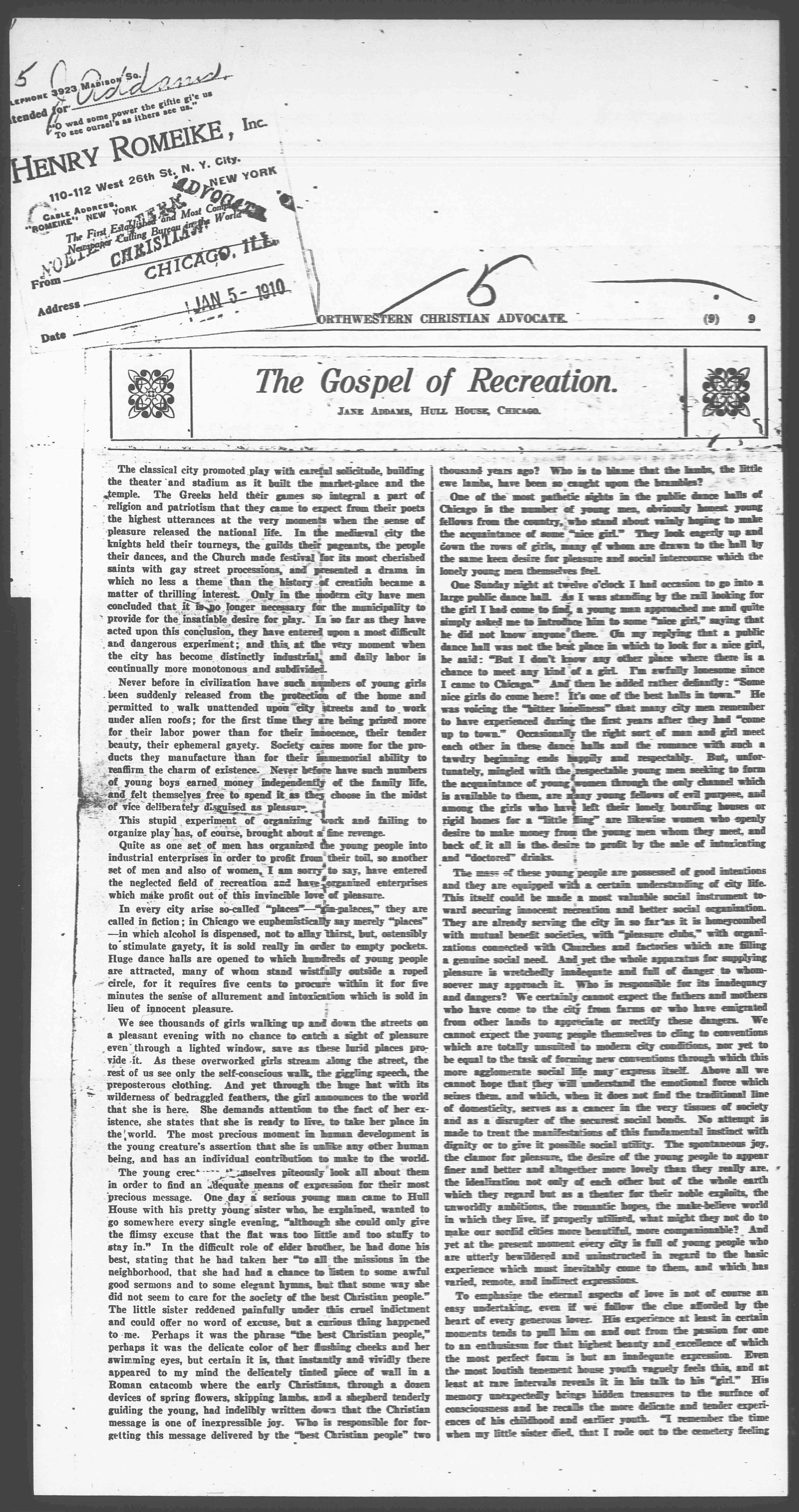 To emphasize the eternal aspects of love is not of course an easy undertaking, even if we follow the [clue] afforded by the heart of every generous lover. His experience at least in certain moments tends to pull him on and out from the passion for one to an enthusiasm for that highest beauty and excellence of which the most perfect form is but an adequate expression. Even the most loutish tenement-house youth vaguely feels this, and at least at rare intervals reveals it in his talk to his "girl." His memory unexpectedly brings hidden treasures to the surface of consciousness and he recalls the more delicate and tender experiences of his childhood and earlier youth. "I remember the time when my little sister died, that I rode out to the cemetery feeling [page 2] that everybody in Chicago has moved away from the town to make room for that kid's funeral, everything was so darned lonesome and yet it was kind of peaceful, too." Or, "I never had a chance to go into the country when I was a kid, but I remember one day when I had to deliver a package way out on the west side, that I saw a flock of sheep in Douglass park. I had never thought that a sheep could be anywhere but in a picture, and when I saw those big white spots on the green grass beginning to move and to turn into sheep, I felt exactly as if St. Cecilia had come out of her frame over the organ and was walking in the park." Such moments come into the life of the most prosaic youth living in the most crowded quarters of the cities. What do we do to encourage and to solidify those moments, to make them come true in our dingy towns, to give them expression in forms of art?