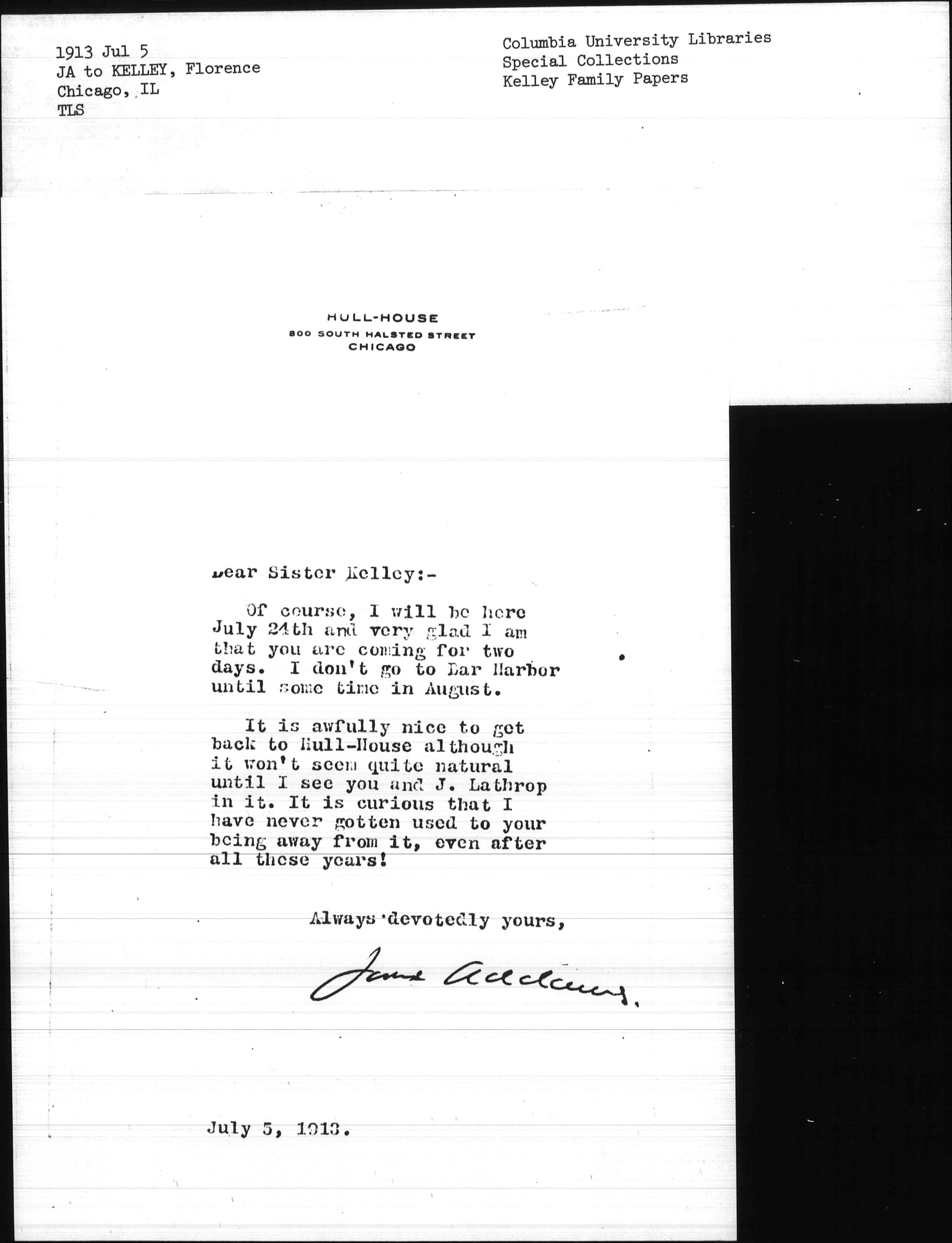 It is awfully nice to get back to Hull-House although it won't seem quite natural until I see you and J. Lathrop in it. It is curious that I have never gotten used to your being away from it, even after all these years!