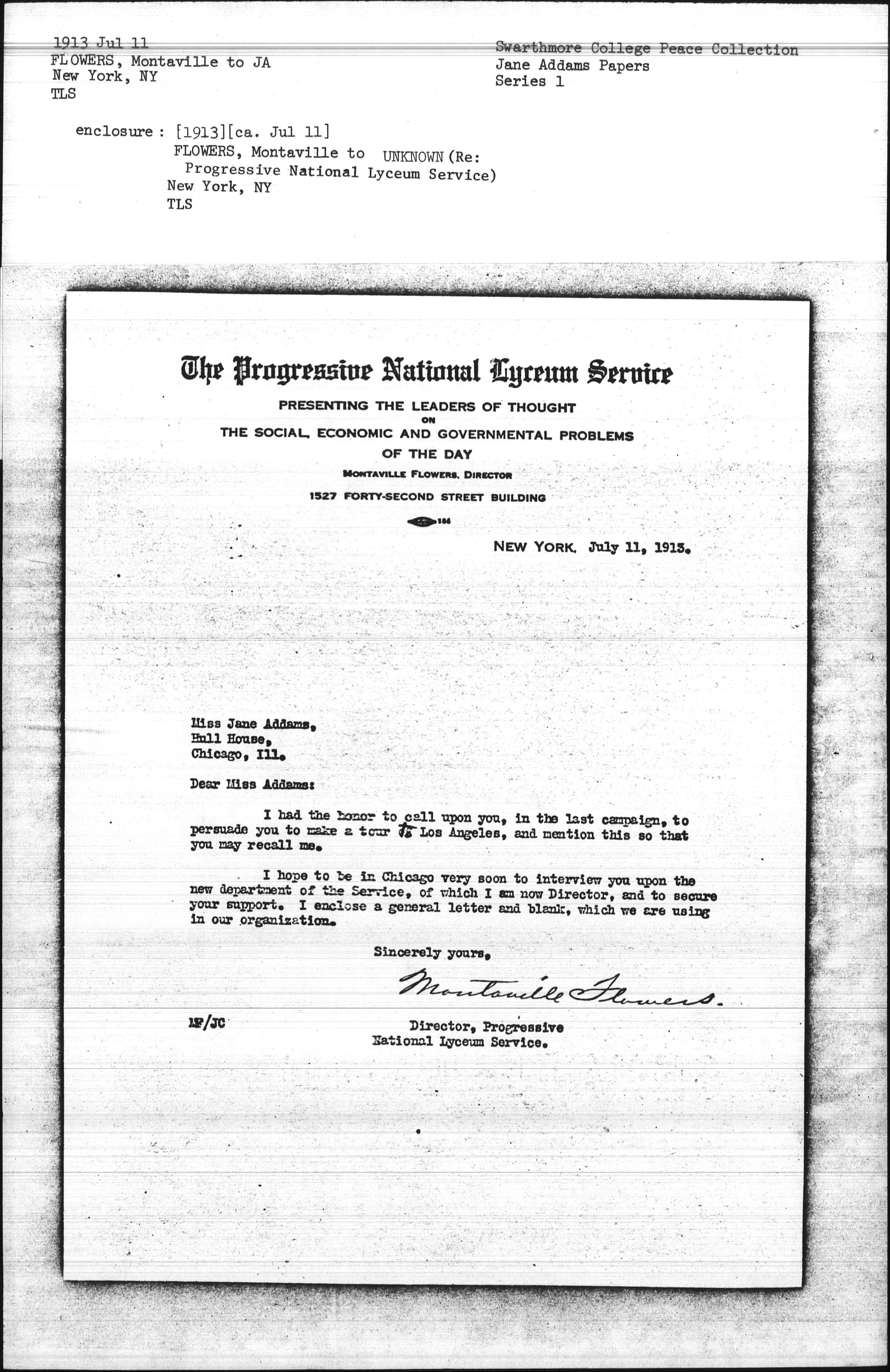 I hope to be in Chicago very soon to interview you upon the new department of the Service, of which I am now Director, and to secure your support. I enclose a general letter and blank, which we are using in our organization.