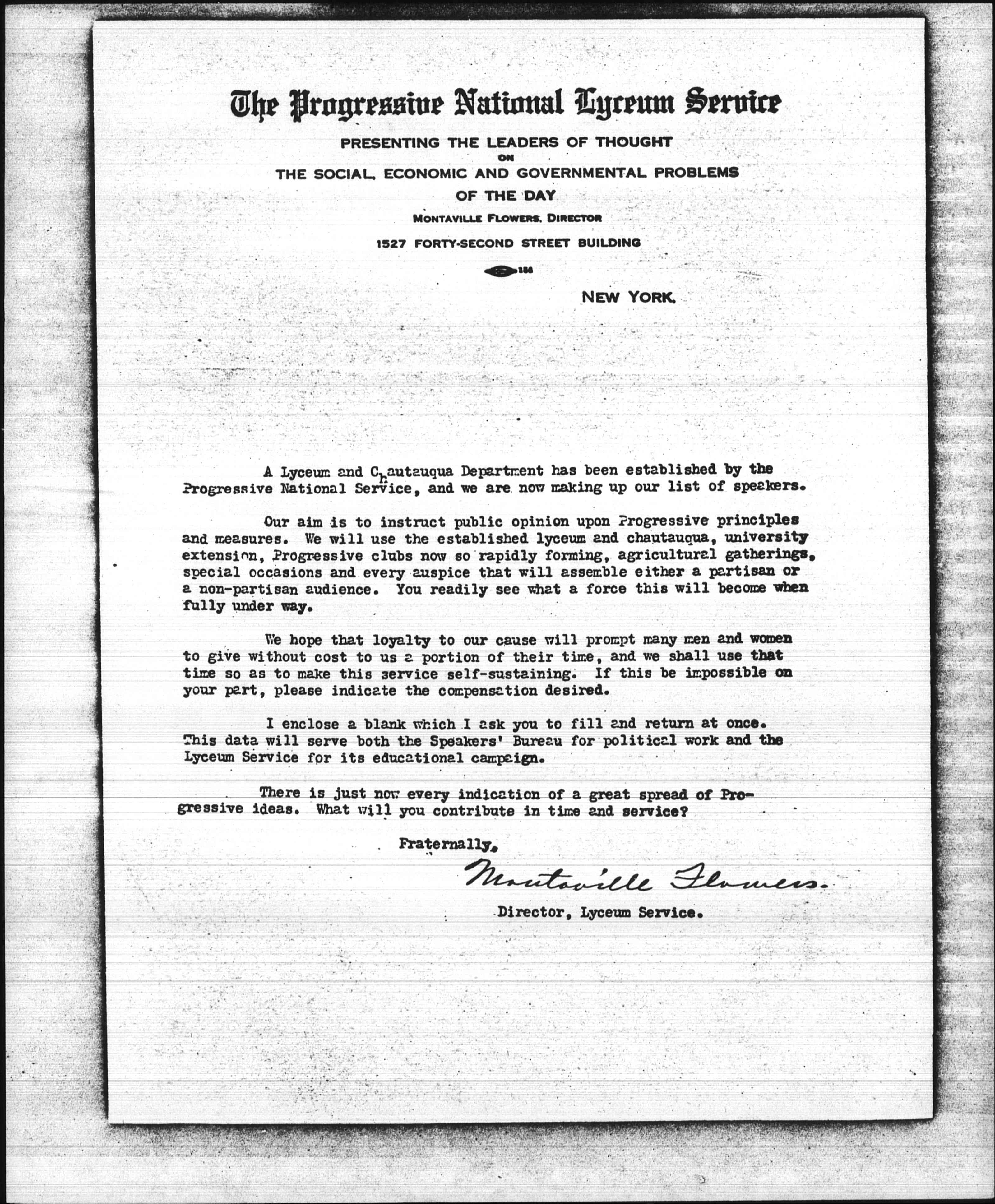 A Lyceum and Chautauqua Department has been established by the Progressive National Service, and we are now making up our list of speakers.