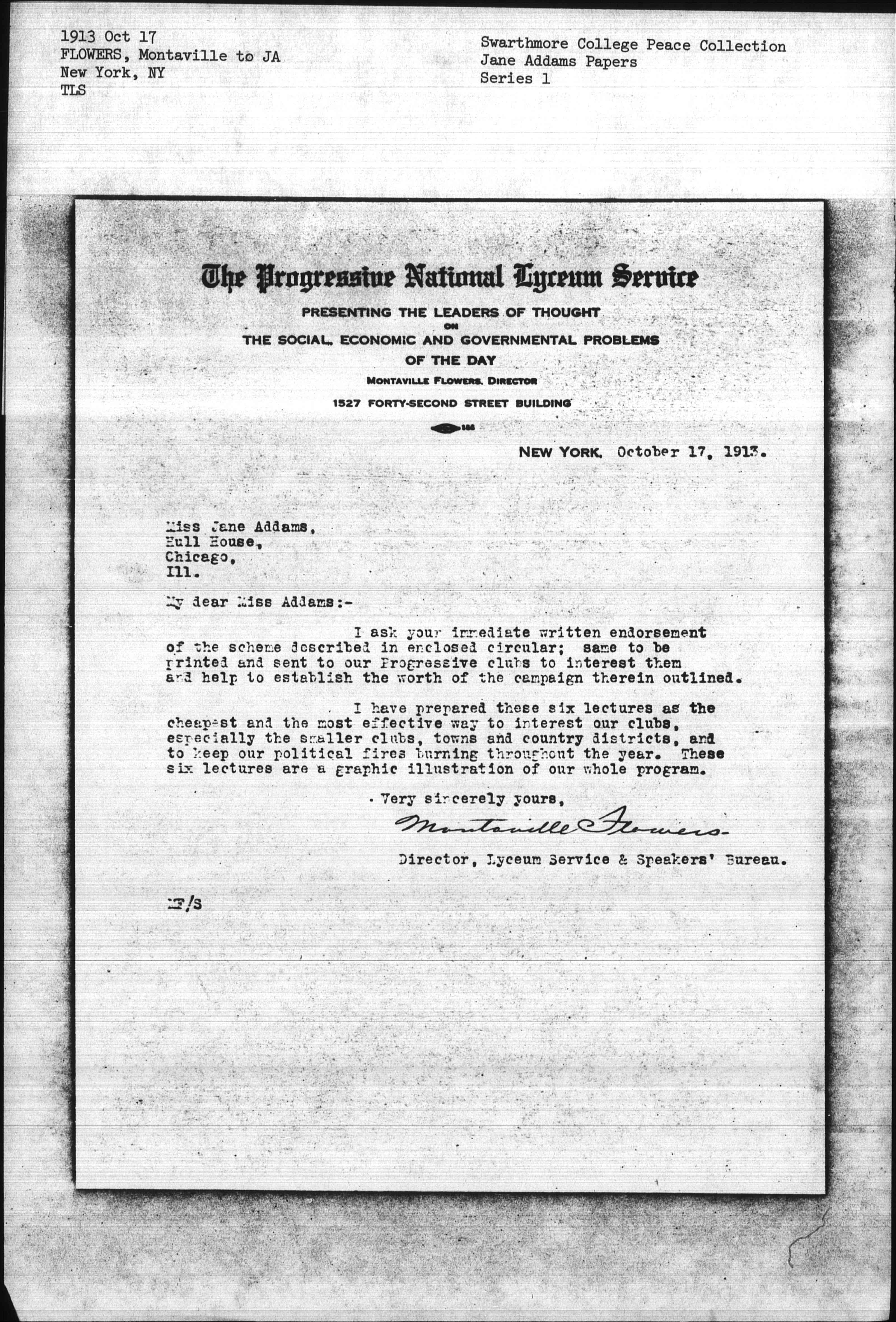 I ask your immediate written endorsement of the scheme described in enclosed circular; same to be printed and sent to our Progressive clubs to interest them and help to establish the worth of the campaign therein outlined.