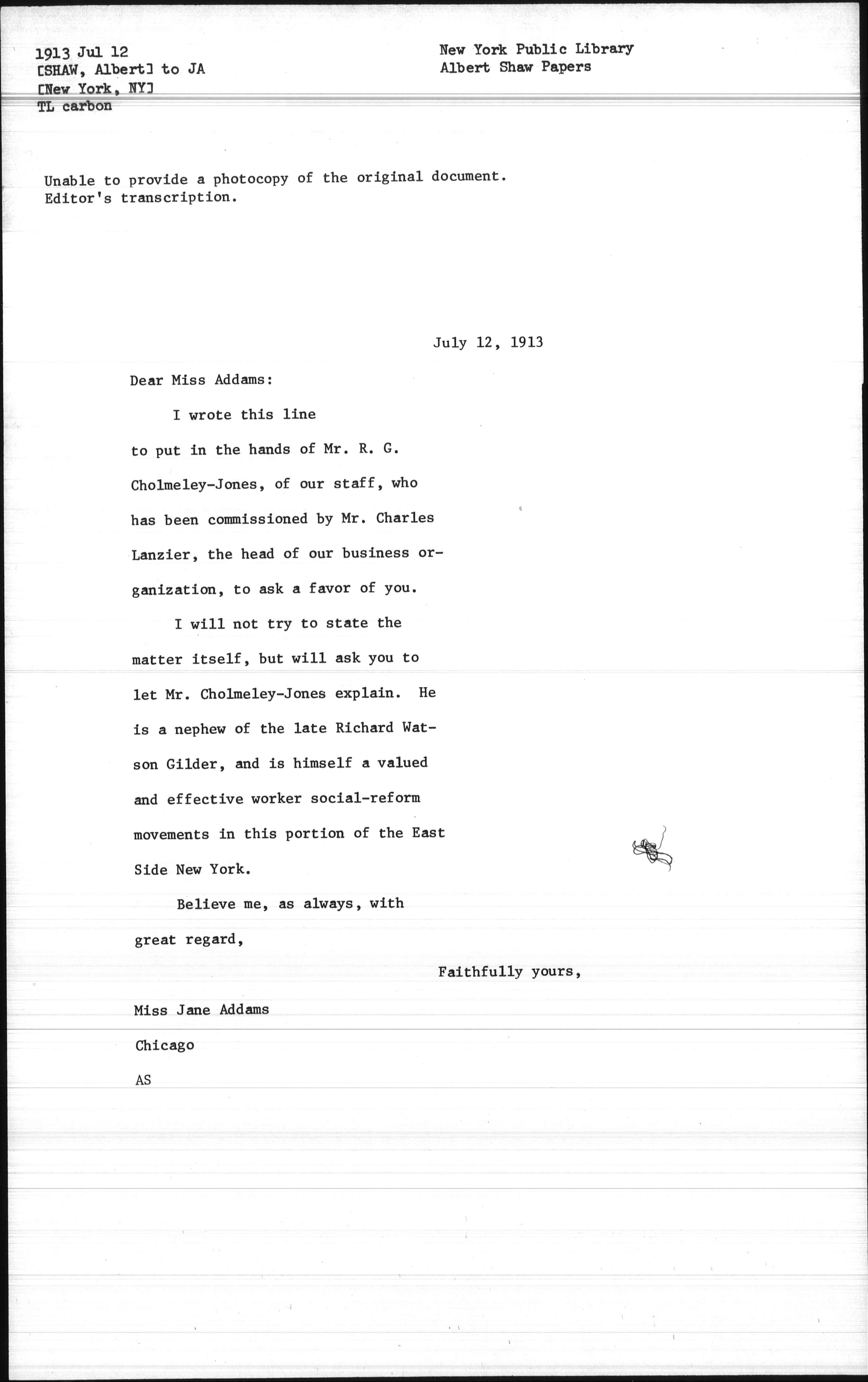 I wrote this line to put in the hands of Mr. R. G. Cholmeley-Jones, of our staff, who has been commissioned by Mr. Charles Lanzier, the head of our business organization, to ask a favor of you.