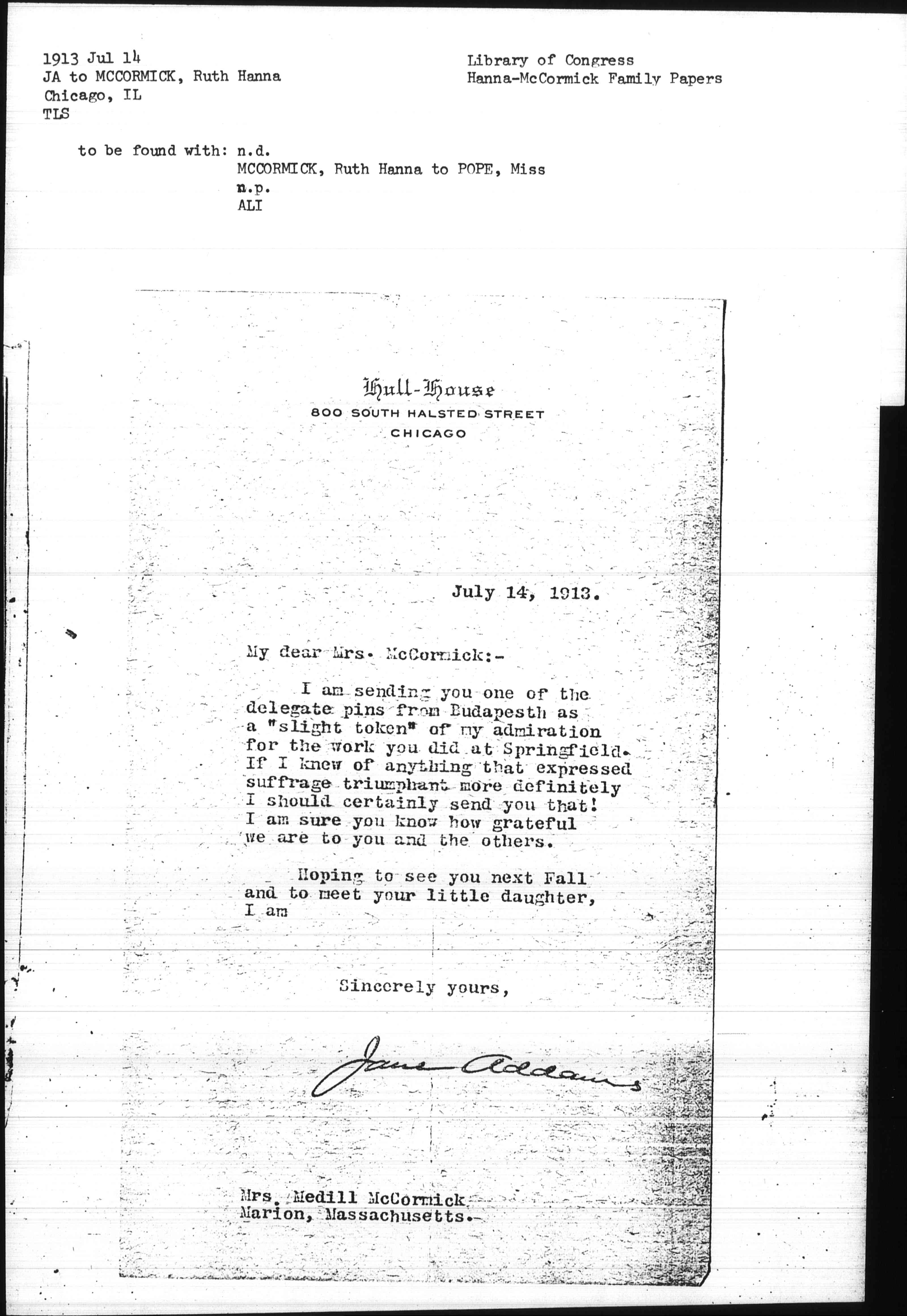 I am sending you one of the delegate pins from [Budapest] as a "slight token" of my admiration for the work you did at Springfield. If I knew of anything that expressed suffrage triumphant more definitely I should certainly send you that! I am sure you know how grateful we are to you and the others.