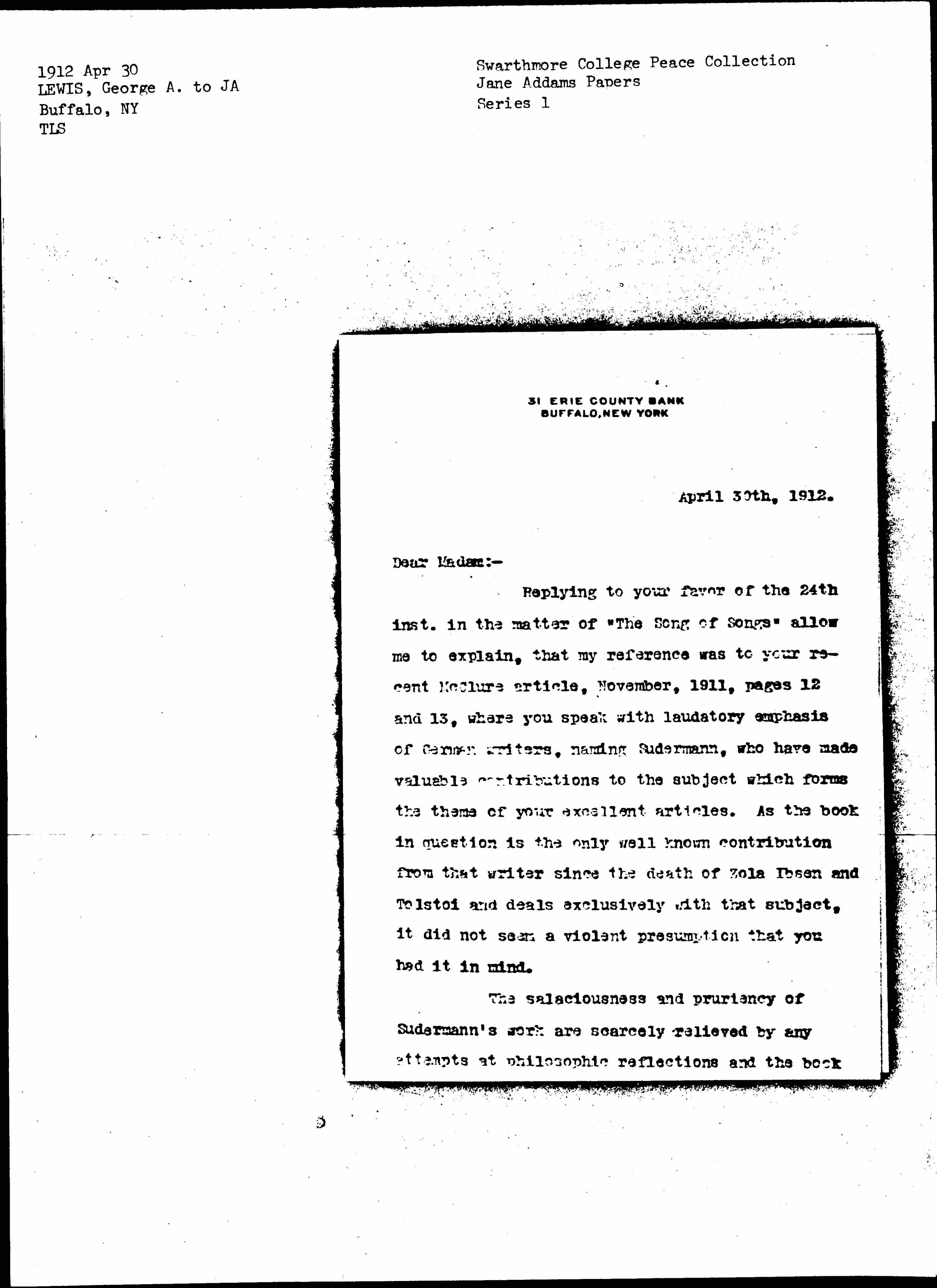 Replying to your favor of the 24th inst. in the matter of "The Song of Songs" allow me to explain, that my reference was to your recent McClure article, November, 1911, pages 12 and 13, where you speak with laudatory emphasis of German writers, naming Sudermann, who have made valuable contributions to the subject which forms the theme of your excellent articles. As the book in question is the only well known contribution from that writer since the death of Zola Ibsen and [Tolstoy] and deals exclusively with that subject, it did not seem a violent presumption that you had it in mind.