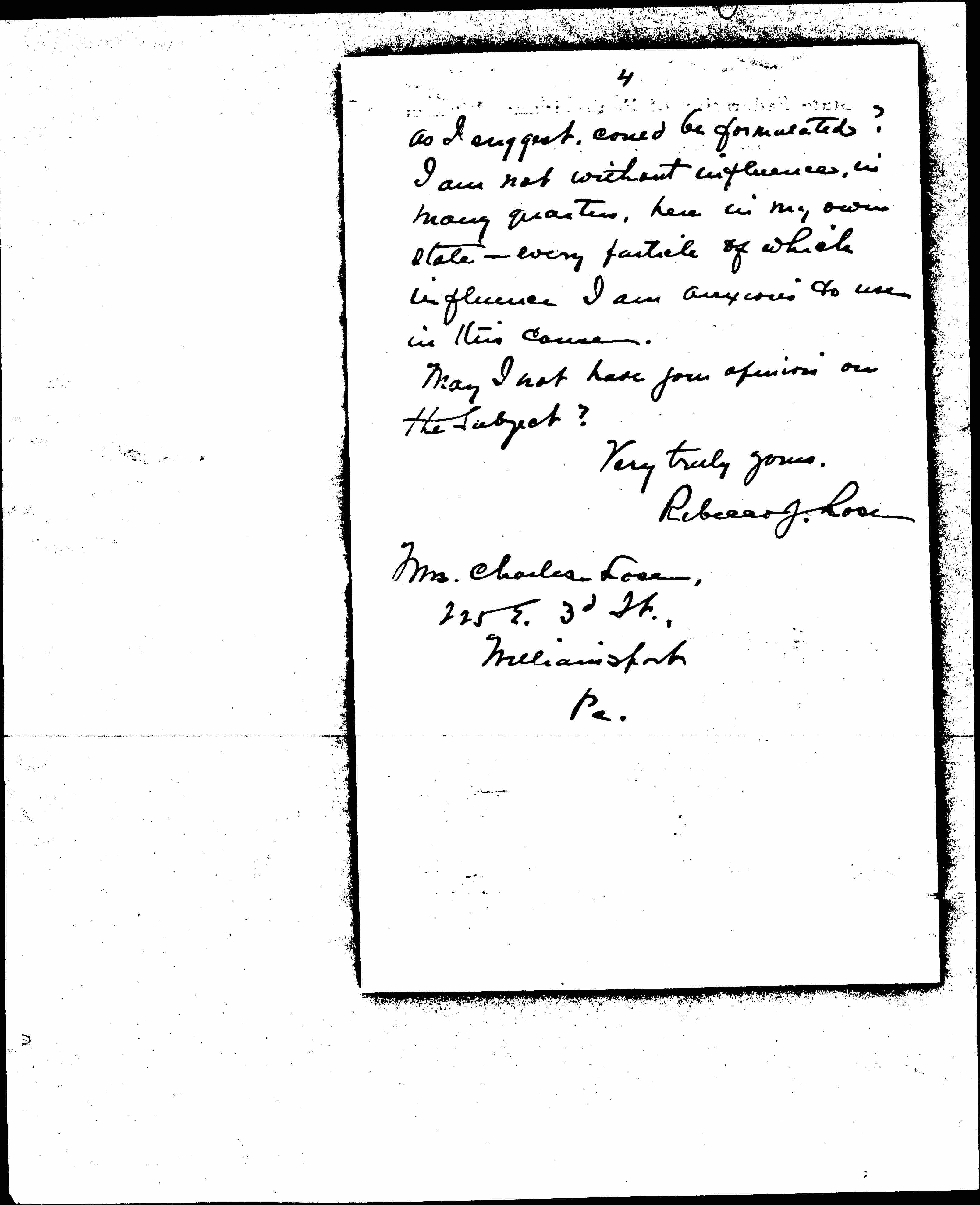 Do you believe such a demand [page 4] as I suggest, could be formulated? I am not without influences, in many quarters, here in my own state -- every particle of which influence I am anxious to use in this cause.