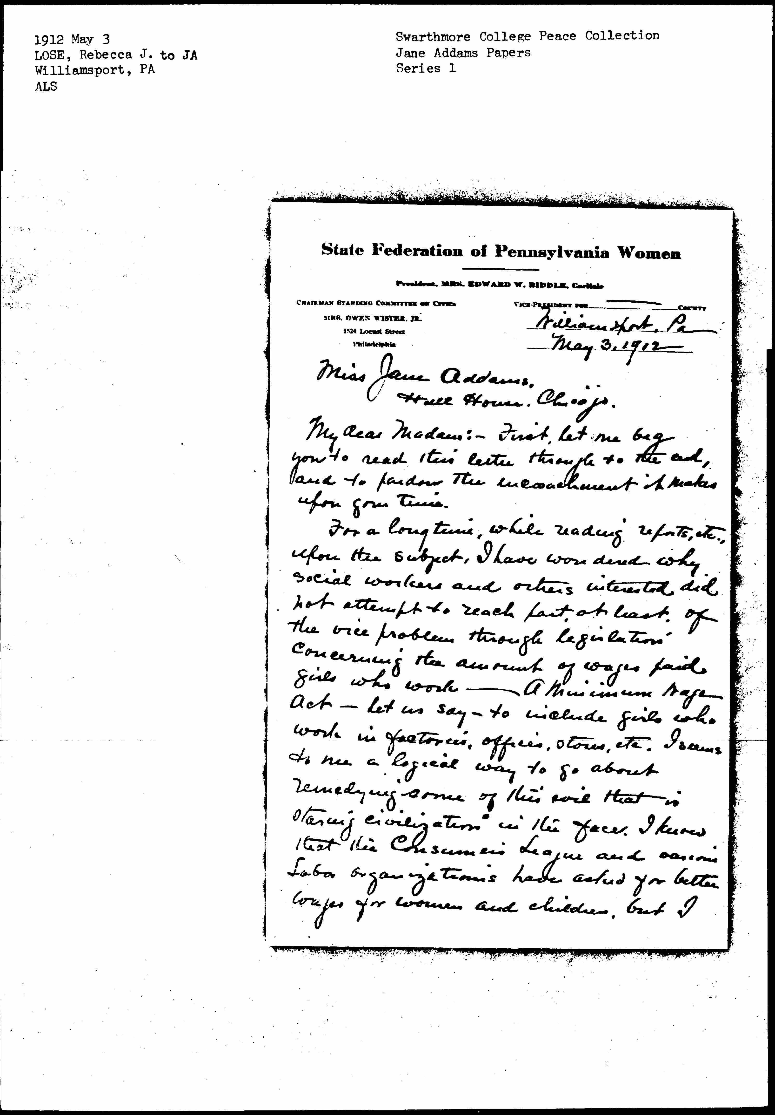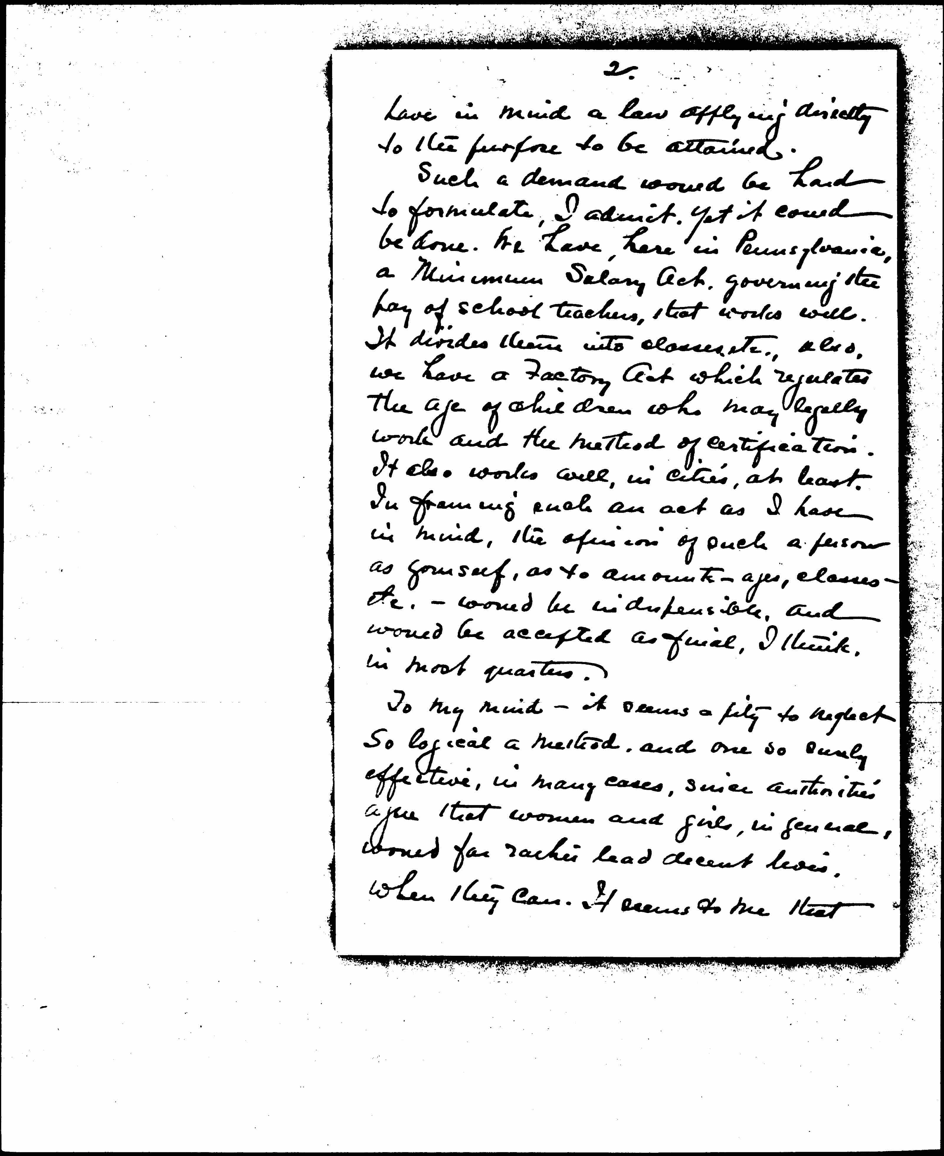 For a long time, while reading reports, etc., upon the subject, I have wondered why social workers and others interested did not attempt to reach part, at least, of the vice problem through legislation concerning the amount of wages paid girls who work -- A Minimum Wage Act -- let us say -- to include girls who work in factories, offices, stores, etc. [It] seems to me a logical way to go about remedying some of this evil that is staring civilization in the face. I knew that the Consumer's League and various Labor organizations have asked for better wages for women and children, but I [page 2] have in mind a law applying directly to the purpose to be attained.