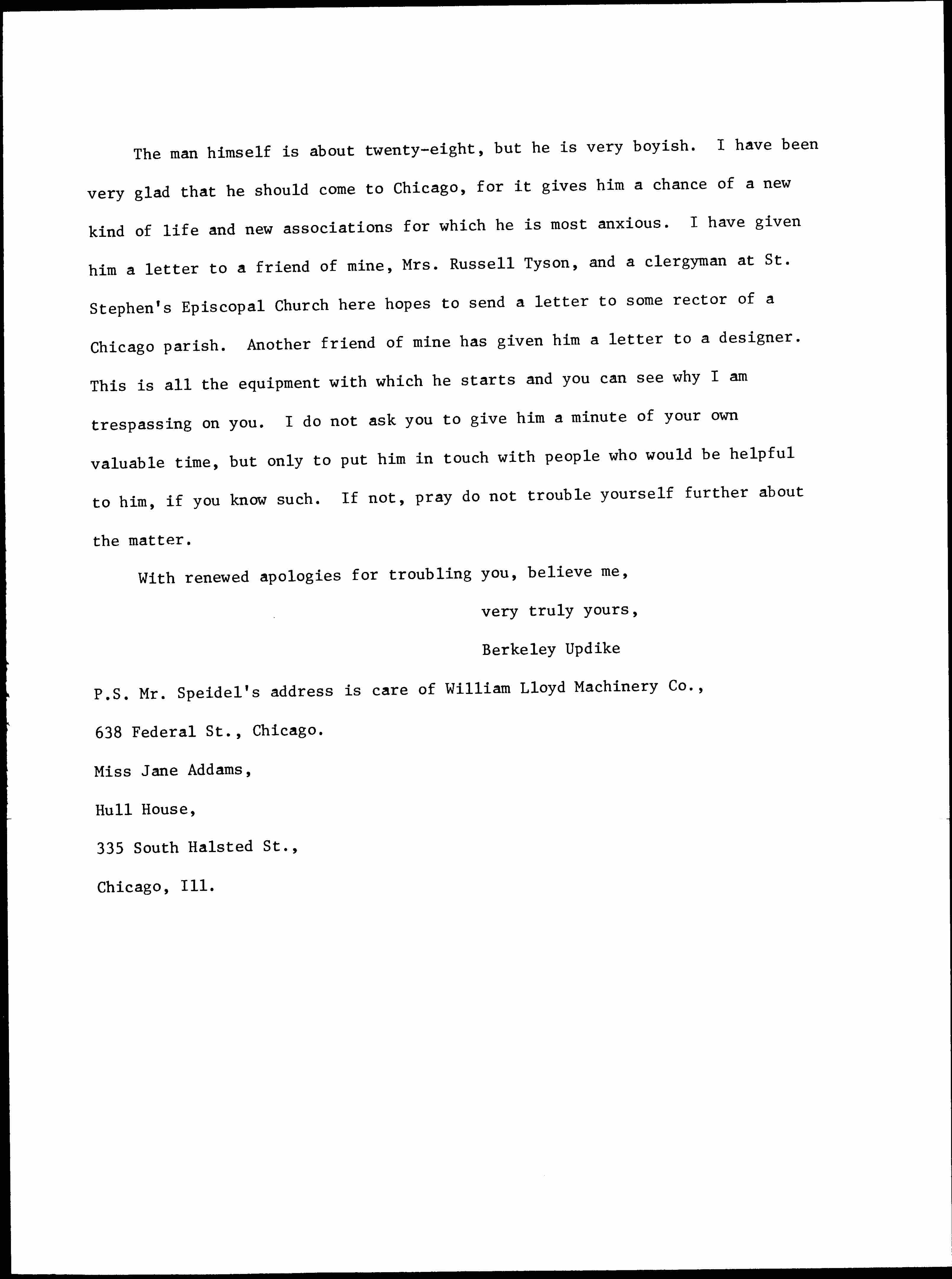 The man himself is about twenty-eight, but he is very boyish. I have been very glad that he should come to Chicago, for it gives him a chance of a new kind of life and new associations for which he is most anxious. I have given him a letter to a friend of mine, Mrs. Russell Tyson, and a clergyman at St. Stephen's Episcopal Church here hopes to send a letter to some rector of a Chicago Parish. Another friend of mine has given him a letter to a designer. This is all the equipment with which he starts and you can see why I am trespassing on you. I do not ask you to give him a minute of your own valuable time, but only to put him in touch with people who would be helpful to him, if you know such. If not, pray do not trouble yourself further about the matter.