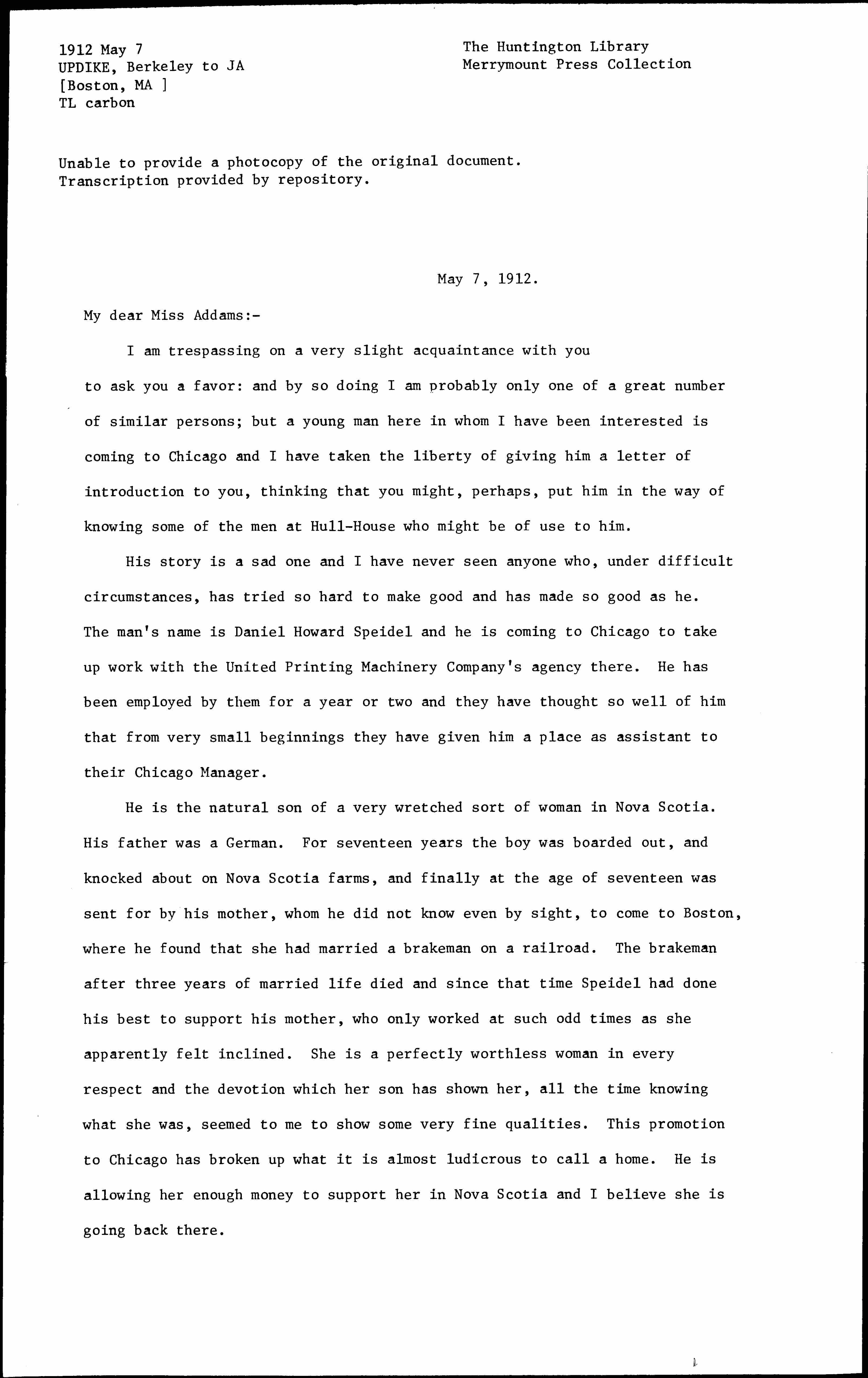 I am trespassing on a very slight acquaintance with you to ask you a favor: and by doing so I am probably only one of a great number of similar persons; but a young man here in whom I have been interested is coming to Chicago and I have taken the liberty of giving him a letter of introduction to you, thinking that you might, perhaps, put him in the way of knowing some of the men at Hull-House who might be of use to him.