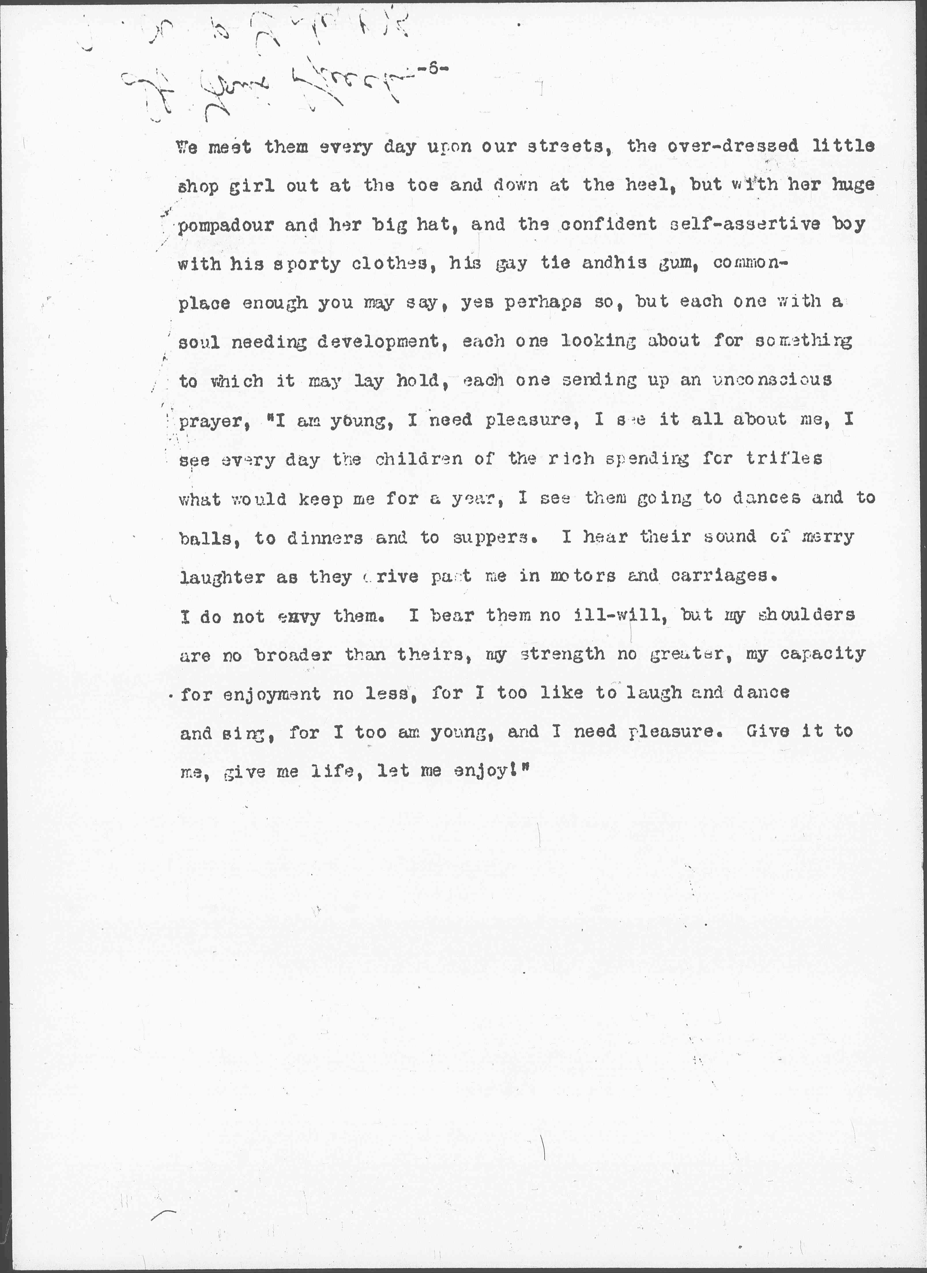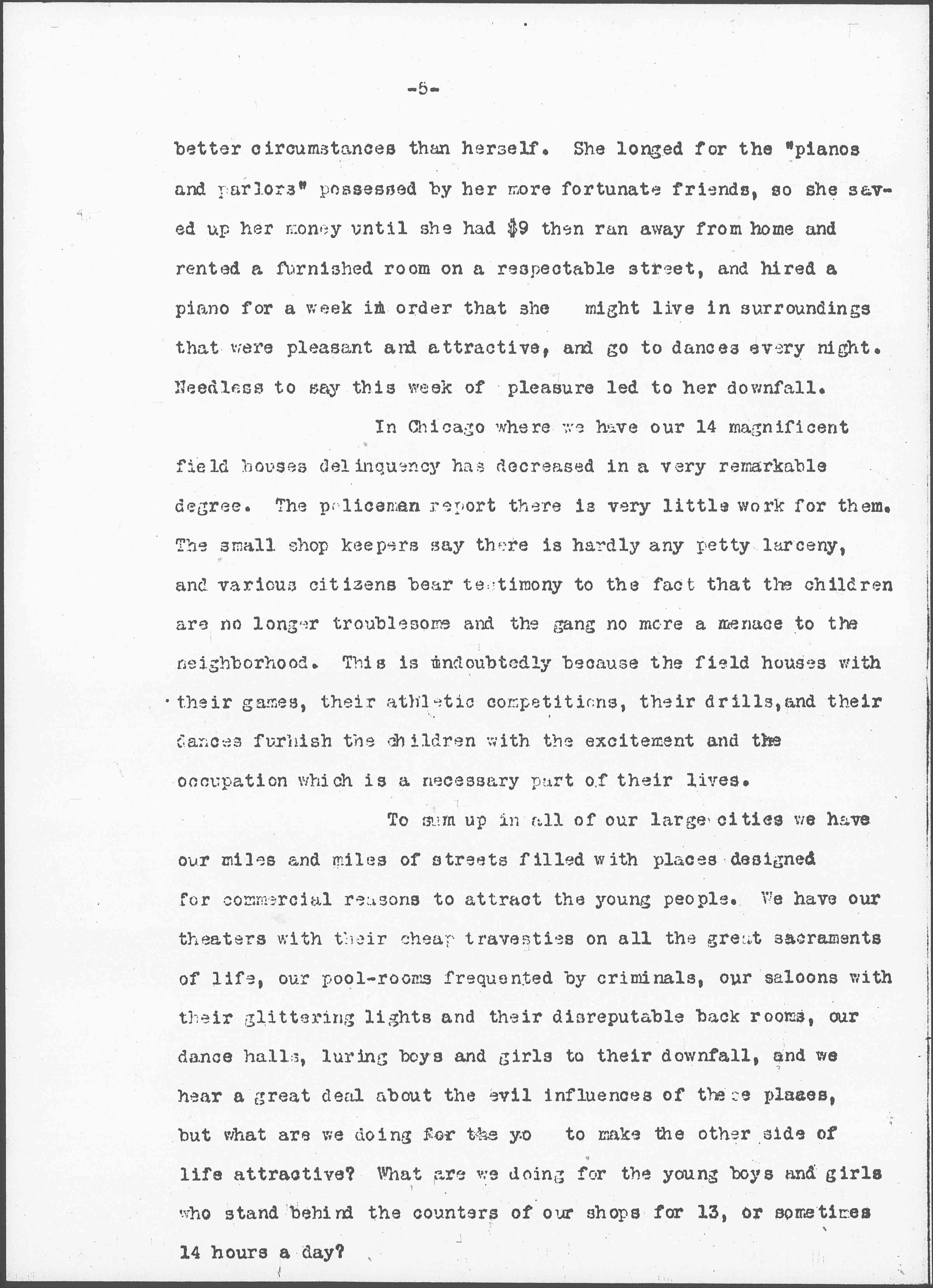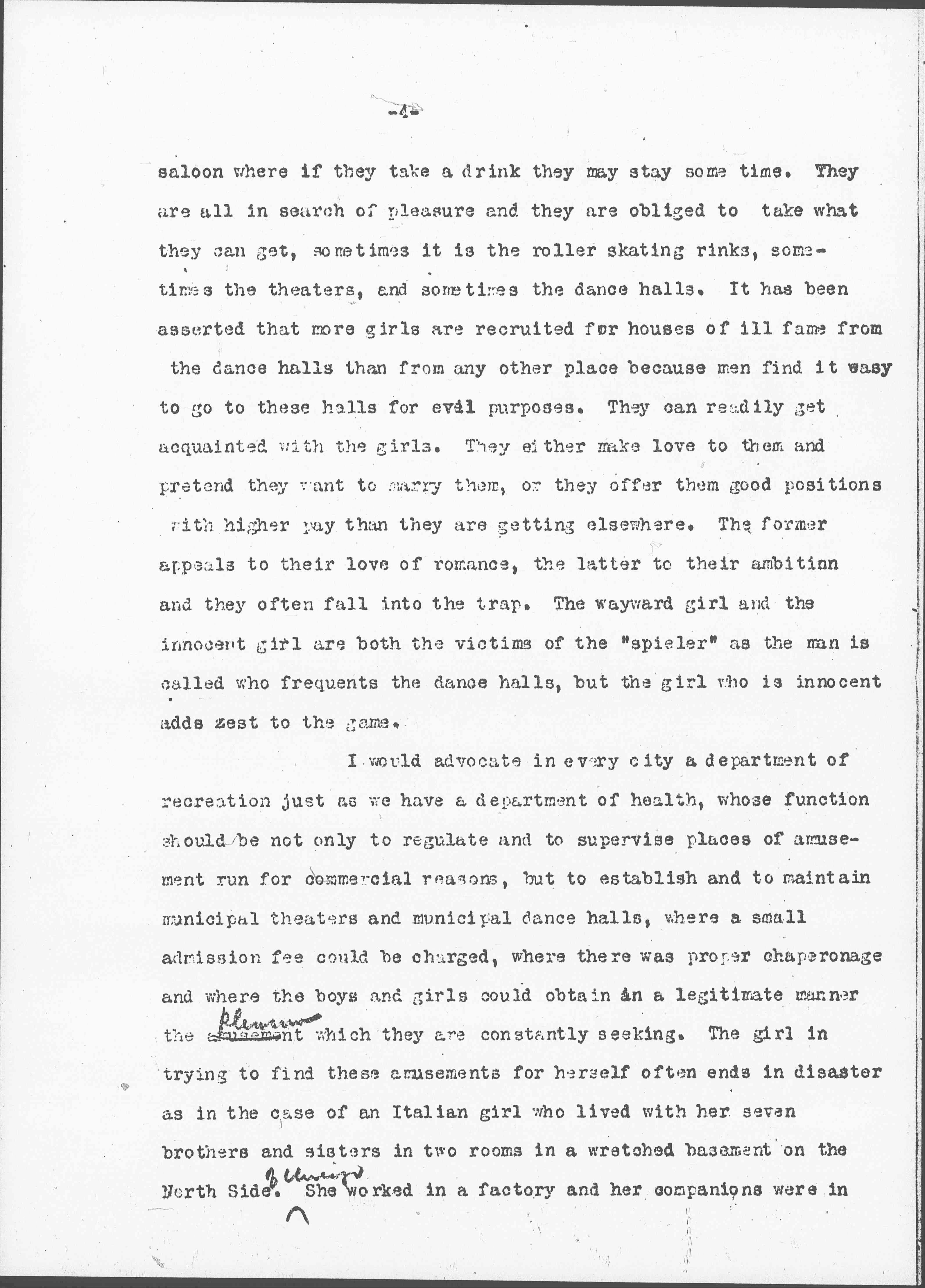 I would advocate in every city a department of recreation just as we have a department of health, whose function would be not only to regulate and to supervise places of amusement run for commercial reasons, but to establish and to maintain municipal theaters and municipal dance halls, where a small admission fee could be charged, where there was proper chaperonage and where the boys and girls could obtain a legitimate manner the amusement ↑pleasure↓ which they are constantly seeking. The girl in trying to find these amusements for herself often ends in disaster as in the case of an Italian girl who lived with her seven brothers and sisters in two rooms in a wretched basement on the North Side ↑of Chicago↓. She worked in a factory and her companions were in [page 5] better circumstances than herself. She longed for the "pianos and parlors" possessed by her more fortunate friends, so she saved up her money until she had $9 then ran away from home and rented a furnished room on a respectable street, and hired a piano for a week in order that she might live in surroundings that were pleasant and attractive, and go to dances every night. Needless to say this week of pleasure led to her downfall.