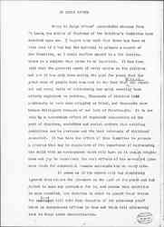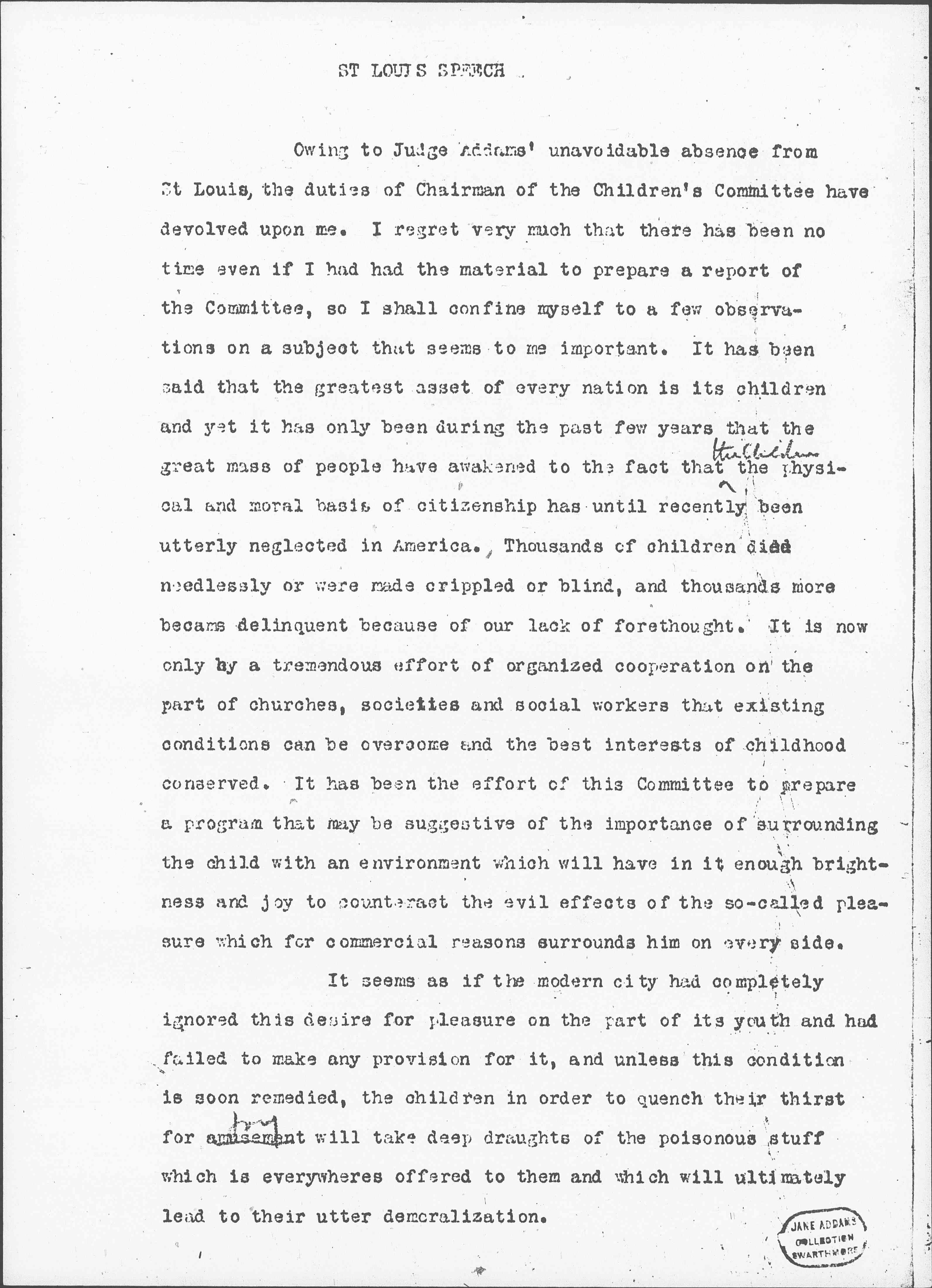 Owing to Jane Addams' unavoidable absence from St Louis, the duties of Chairman of the Children's Committee have devolved upon me. I regret very much that there has been no time even if I had the material to prepare a report of the Committee, so I shall confine myself to a few observations on a subject that seems to me important. It has been said that the greatest asset of every nation is its children and yet it has only been during the past few years that the great mass of people have awakened to the fact that ↑the children↓ the physical and moral basis of citizenship has until recently been utterly neglected in America. Thousands of children died needlessly or were made crippled or blind, and thousands more became delinquent because of our lack of forethought. it is now only by a tremendous effort of organized cooperation on the part of churches, societies and social workers that existing conditions can be overcome and the best interests of childhood conserved. It has been the effort of this Committee to prepare a program that may be suggestive of the importance of surrounding the child with an environment which will have in it enough brightness and joy to counteract the evil effects of the so-called pleasure which for commercial reasons surrounds him on every side.