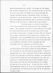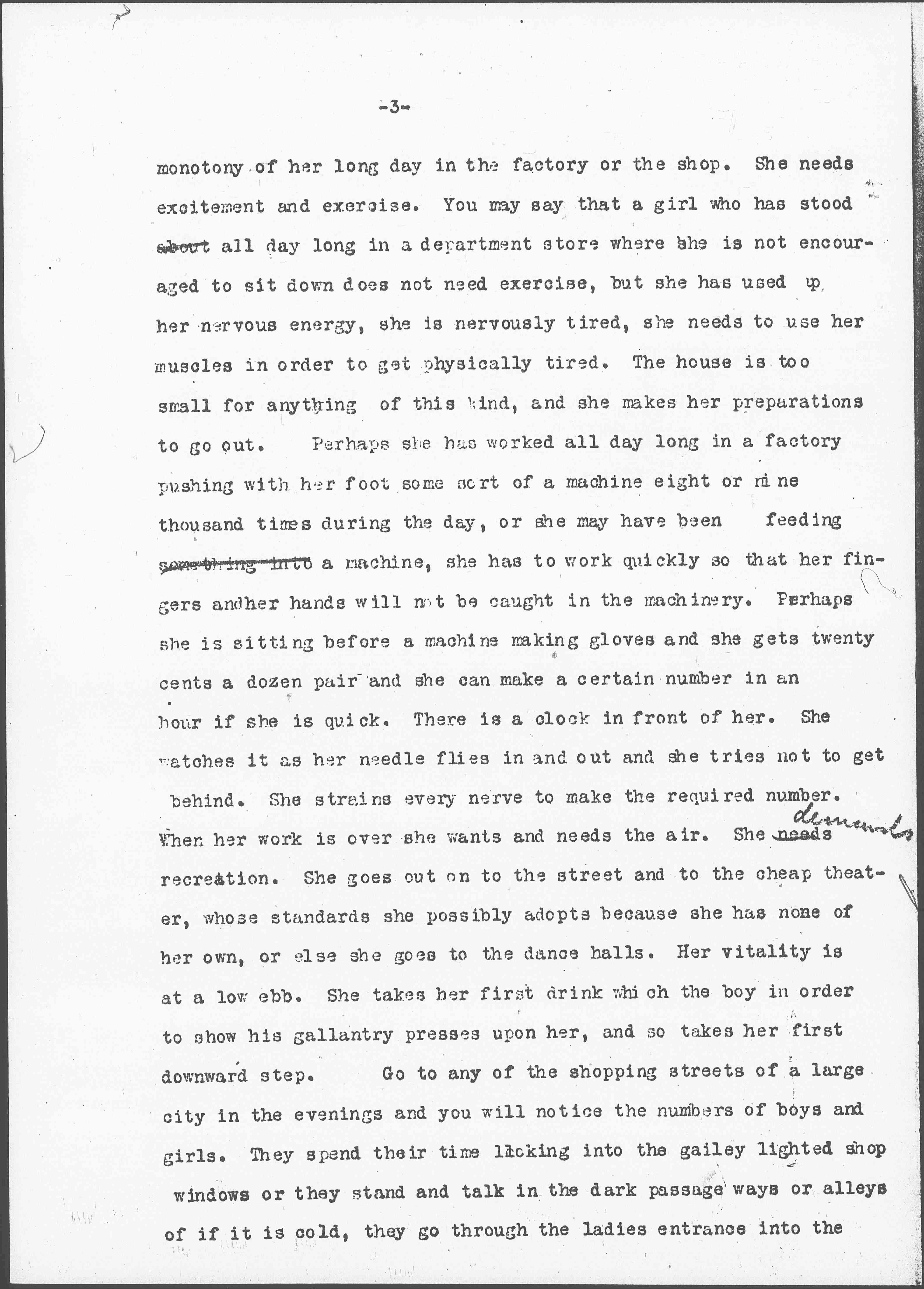 The average girl who lives in these tenements usually goes out because the home is unattractive. There is no room where she can see her company. She is tired after the [page 3] monotony of her long day in the factory or the shop. She needs excitement and exercise. You may say that a girl who has stood about all day long in a department store where she is not encouraged to set down does not need exercise, but she has used up her nervous energy, she is nervously tired, she needs to use her muscles in order to get physically tired. The house is too small for anything of this kind, and she makes her preparations to go out. Perhaps she has worked all day long in a factory pushing with her foot some sort of a machine eight or nine thousand times during the day, or she may have been feeding something into a machine, she has to work quickly so that her fingers and her hands will not be caught in the machinery. Perhaps she is sitting before a machine making gloves and she gets twenty cents a dozen pair and she can make a certain number in an hour if she is quick. There is a clock in front of her. She watches it as her needle flies in and out and she tries not to get behind. She strains every nerve to make the required number. When her work is over she wants and needs the air. She needs ↑demands↓ recreation. She goes out on to the street and to the cheap theater, whose standards she possibly adopts because she has none of her own, or else she goes to the dance halls. Her vitality is at a low ebb. She takes her first drink which the boy in order to show his gallantry presses upon her, and so takes her first downward step. Go to any of the shopping streets of a large city in the evenings and you will notice the numbers of boys and girls. They spend their time looking into the [gaily] lighted shop windows or they stand and talk in the dark passage ways or alleys [or] if it is cold, they go through the ladies entrance into the [page 4] saloon where if they take a drink they may stay some time. They are all in search of pleasure and they are obliged to take what they can get, sometimes it is the roller skating rinks, sometimes the theaters, and sometimes the dance halls. It has been asserted that more girls are recruited for houses of ill fame from the dance halls than from any other place because men find it easy to go to these halls for evil purposes. They can readily get acquainted with the girls. They either make love to them and pretend they want to marry them, or they offer them good positions with higher pay than they are getting elsewhere. The former appeals to their love of romance, the latter to their ambition and they often fall into the trap. The wayward girl and the innocent girl are both the victim of the "spieler" as the man is called who frequents the dance halls, but the girl who is innocent adds zest to the game.