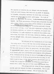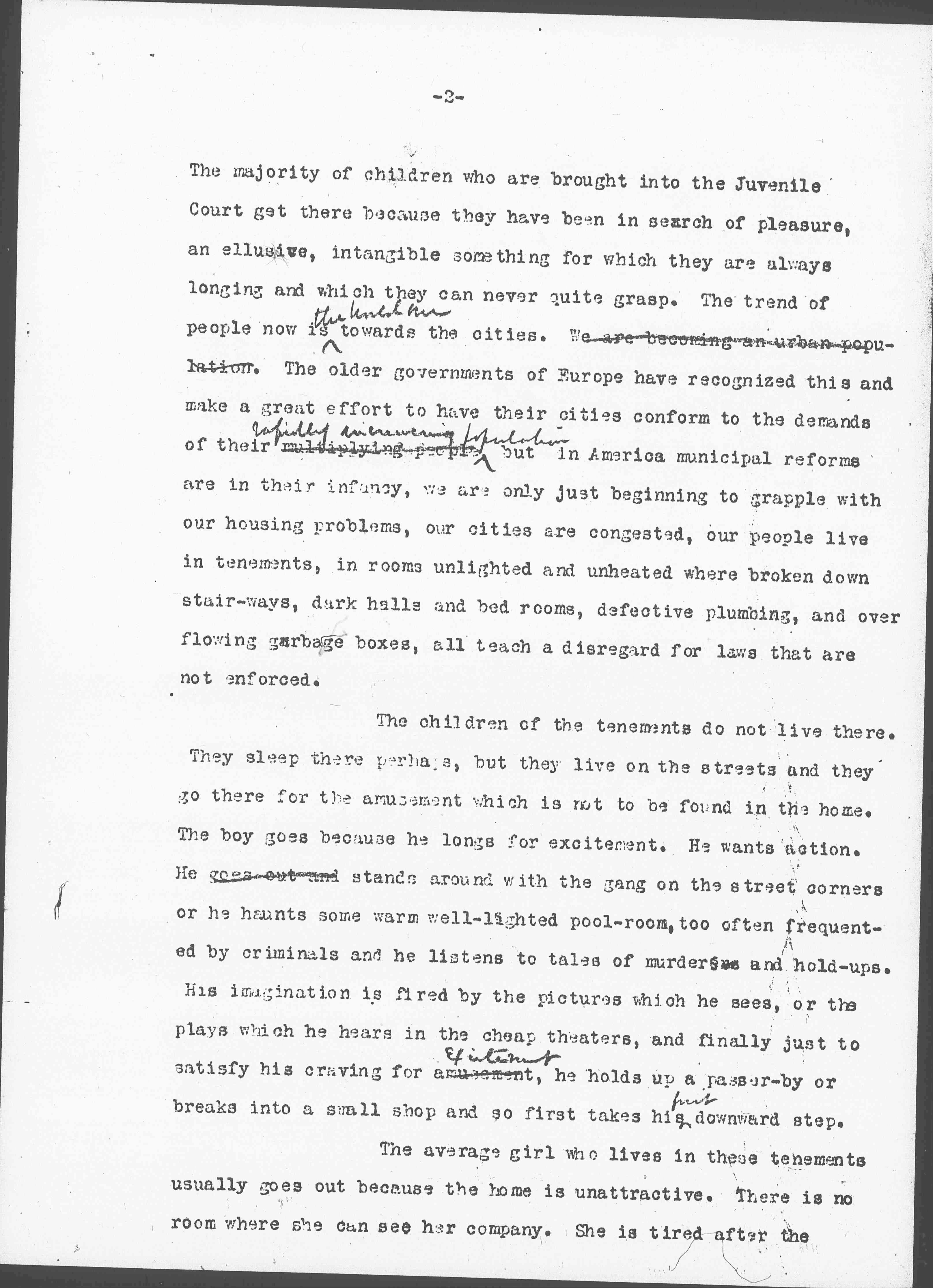 The majority of children who are brought into the Juvenile Court get there because they have been in search of pleasure, an [elusive], intangible something for which they are always longing and which they can never quite grasp. The trend of people now is ↑the [[illegible]↓ towards the cities. We are becoming an urban population. The older governments of Europe have recognized this and make a great effort to have their cities conform to the demands of their multiplying people ↑rapidly increasing population↓ but in America municipal reforms are in their infancy, we are only just beginning to grapple with our housing problems, our cities are congested, our people live in tenements, in rooms unlighted and unheated where broken down stair-ways, dark halls and bed rooms, defective plumbing, and over flowing garbage boxes, all teach a disregard for laws that are not enforced.
