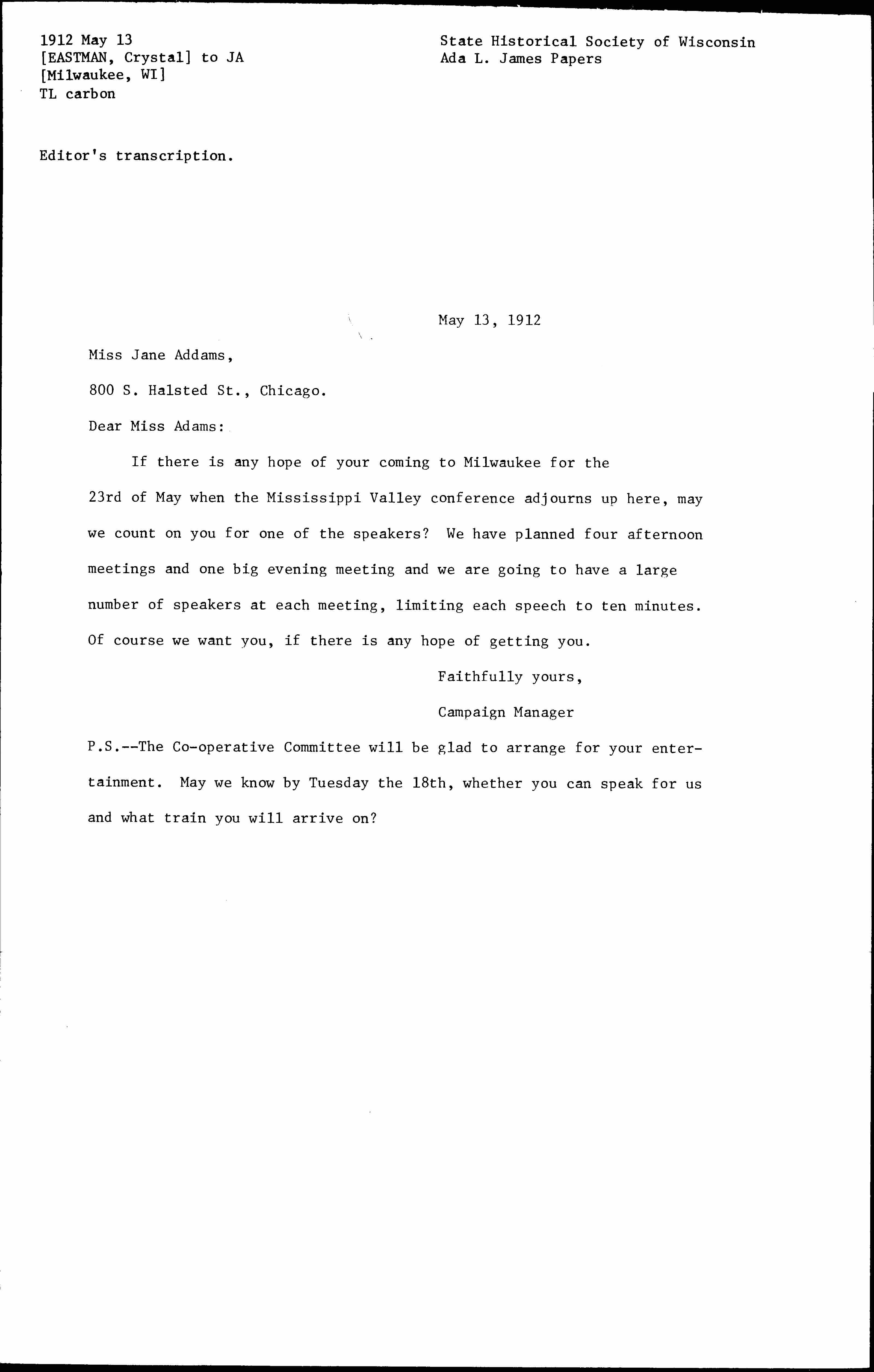 P.S.--The Cooperative Committee will be glad to arrange for your entertainment. May we know by Tuesday the 18th, whether you can speak for us and what train you will arrive on?