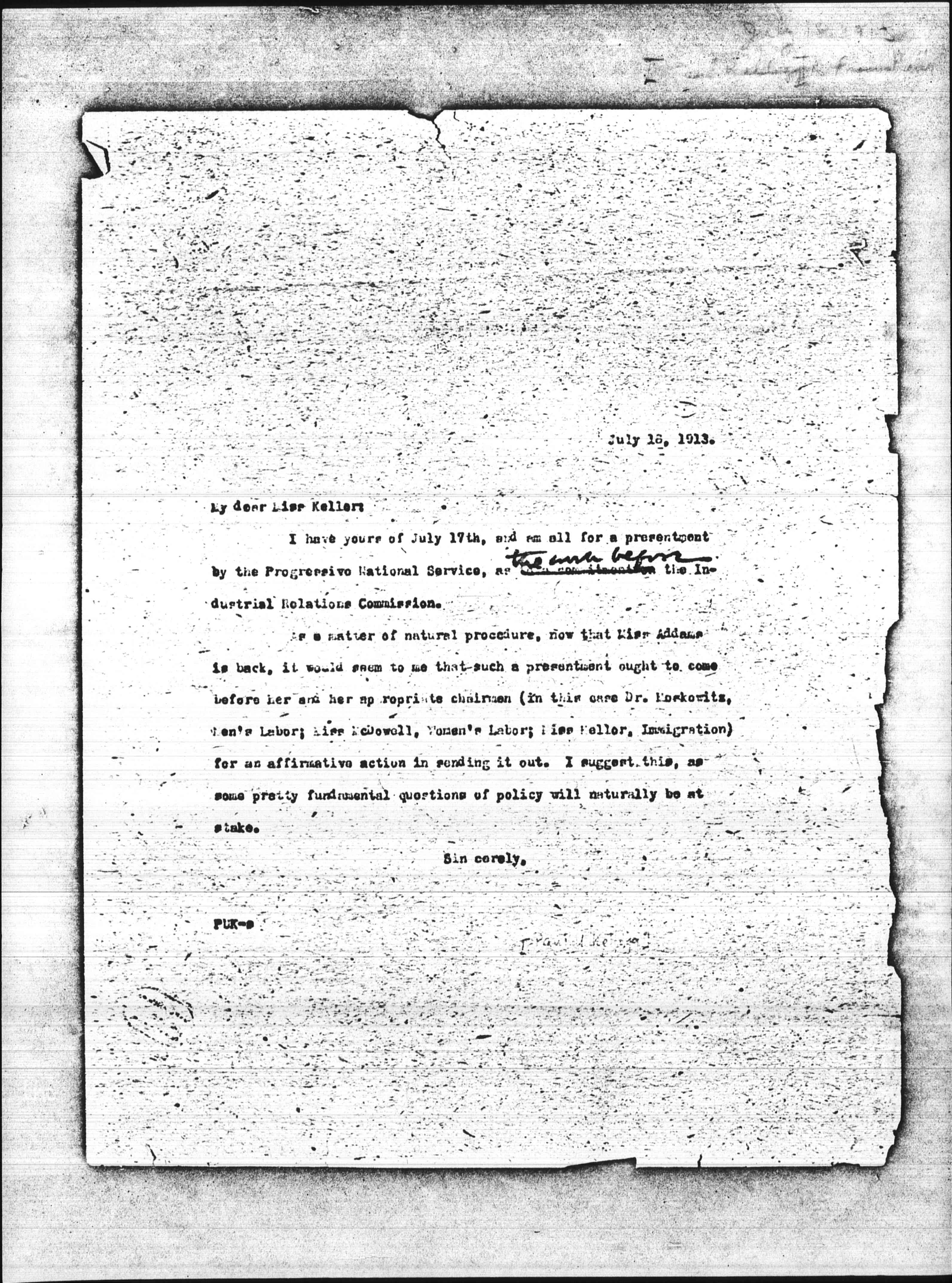 As a matter of natural procedure, now that Miss Addams is back, it would seem to me that such a presentment ought to come before her and her appropriate chairman (in this care Dr. Moskowitz, Men's Labor; Miss McDowell, Women's Labor; Miss Kellor, Immigration) for an affirmative action in sending it out. I suggest this, as some pretty fundamental questions of policy will naturally be at stake.